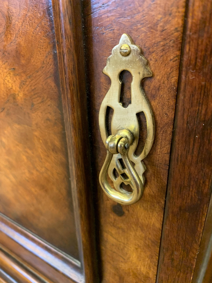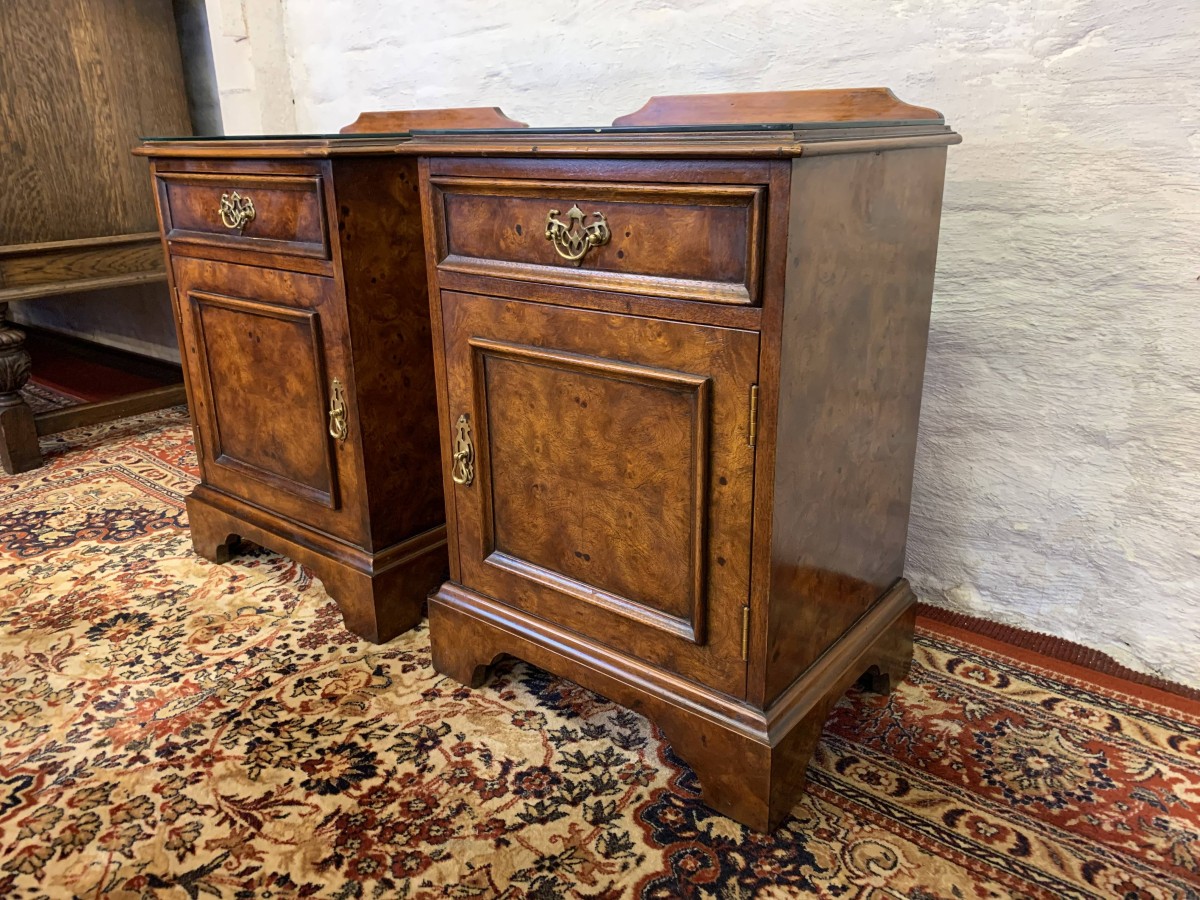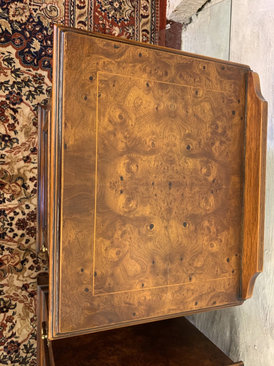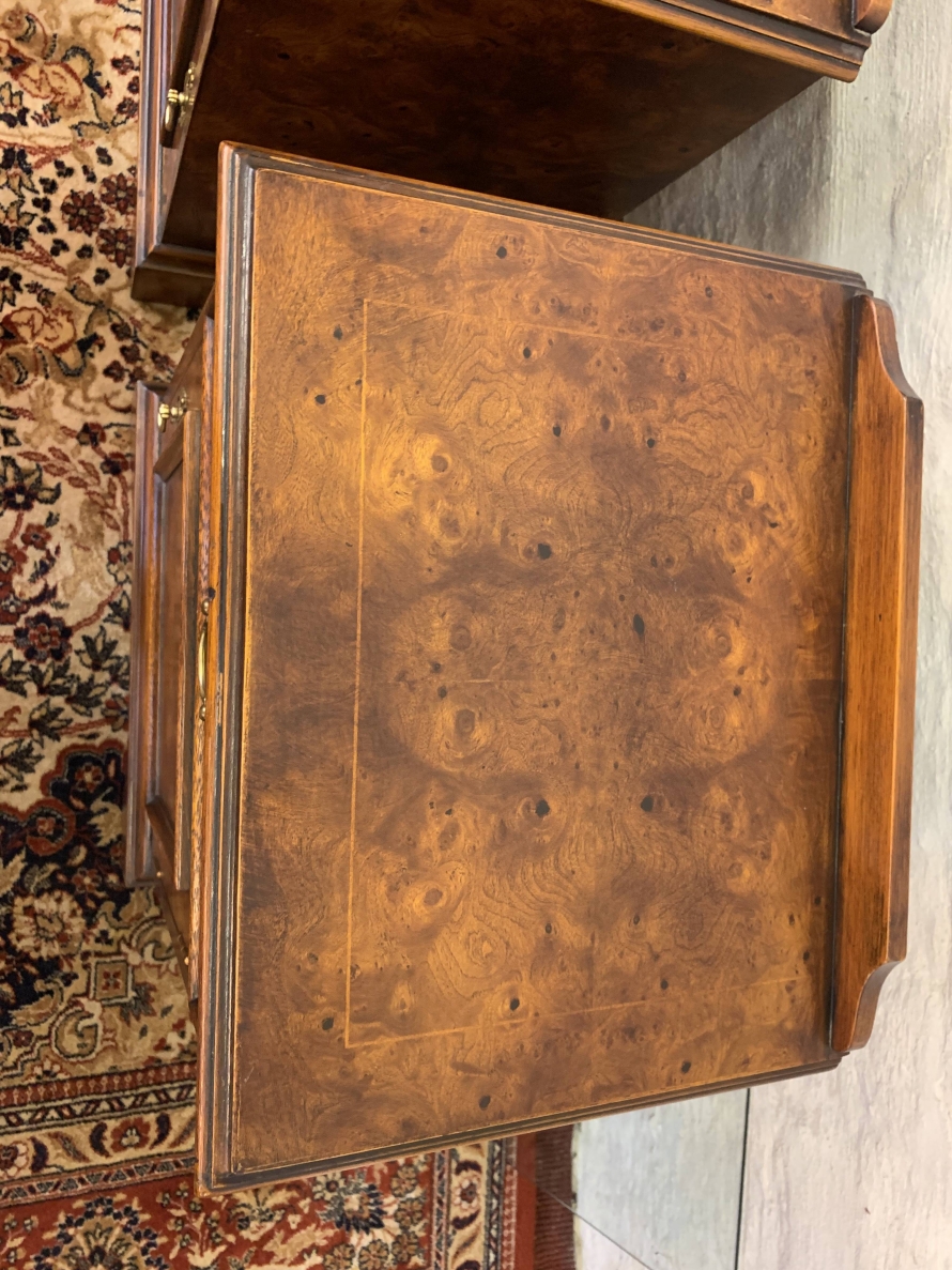 This fabulous pair of burr walnut bedside cabinets are in excellent condition. Upstand to the back, string inlay decoration to the top each with removable glass protectors. Below is a drawer with a decorative brass handle, below is a cupboard door, the door having a brass drop handle. This fabulous pair of cabinets stand on four bracket feet.