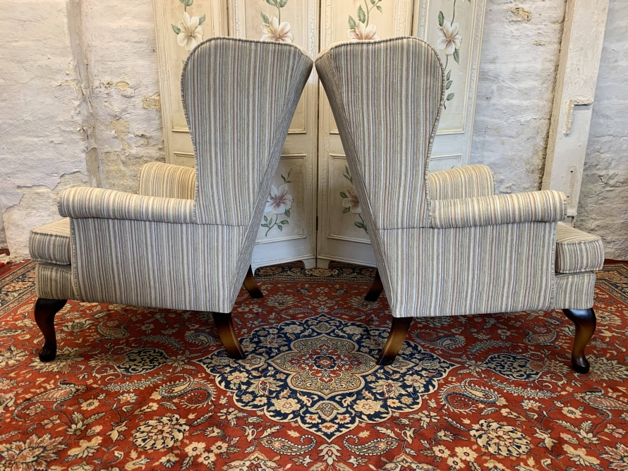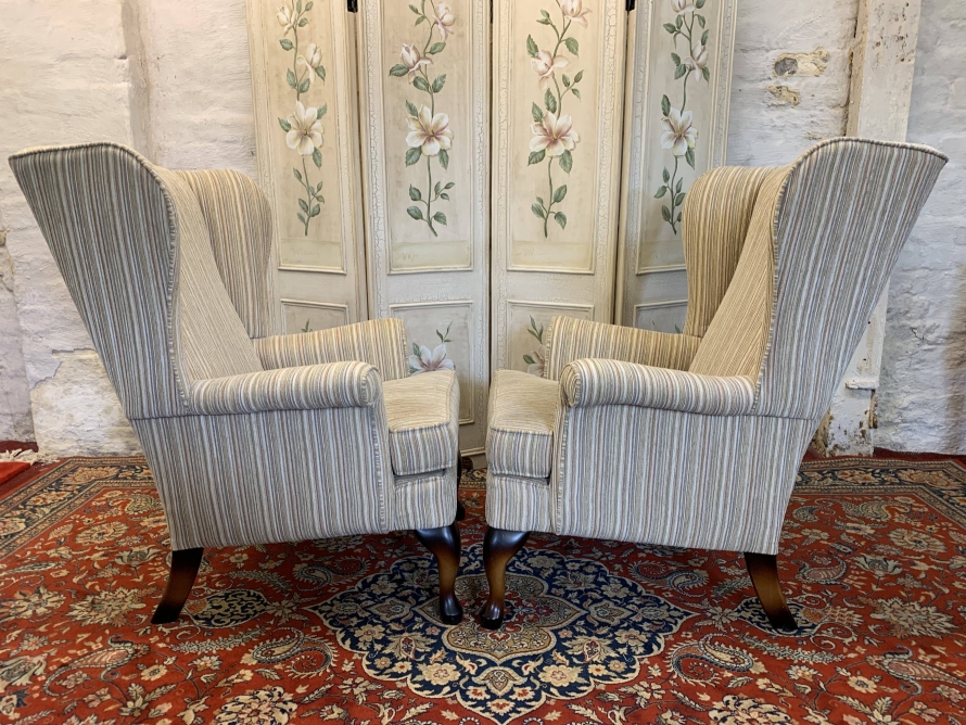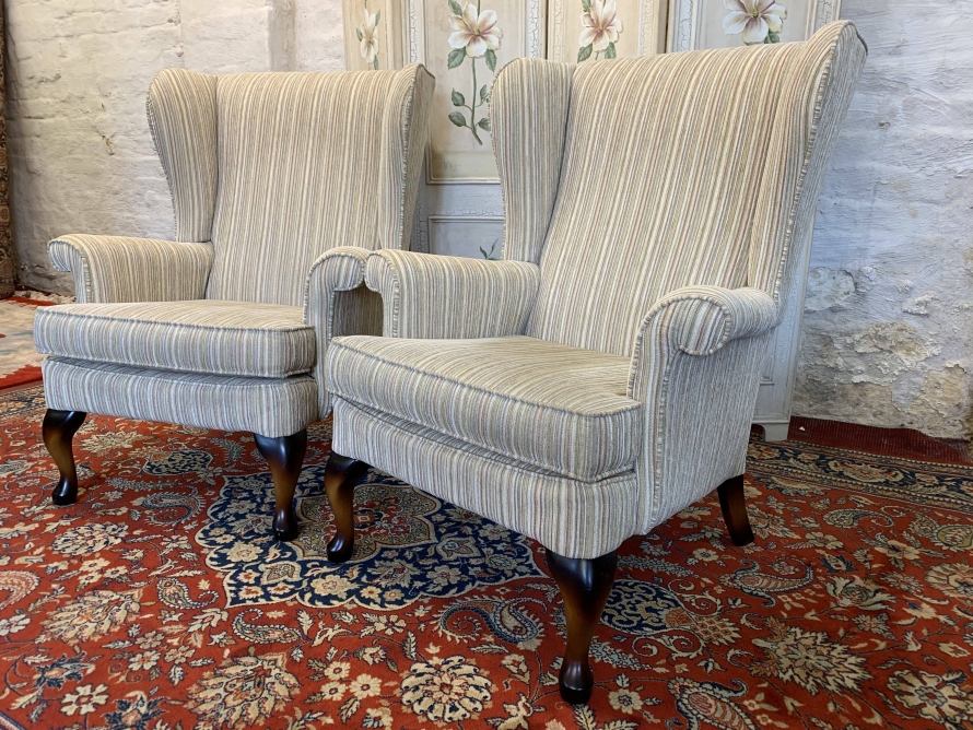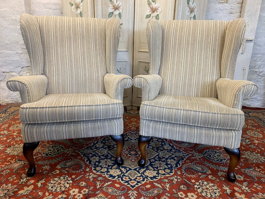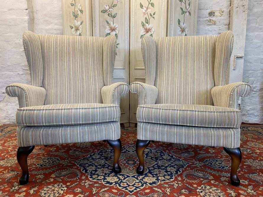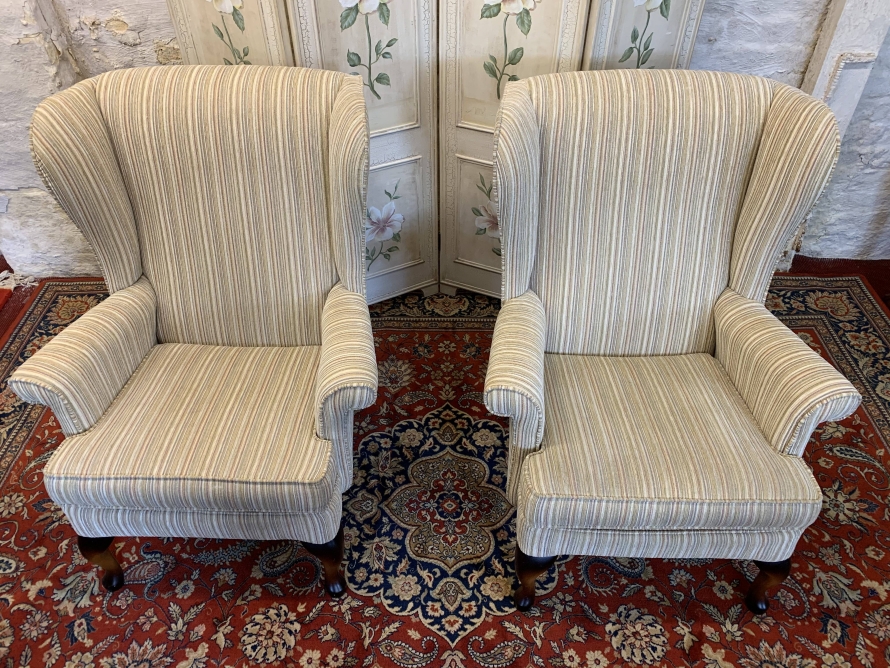 This great pair of armchairs are in excellent condition. Having a slightly sloping back, winged arms these chairs are extremely comfortable. Each arm having a removable arm cover and upholstered cushioned seat. The chairs sit on two cabriole shaped legs to the front.