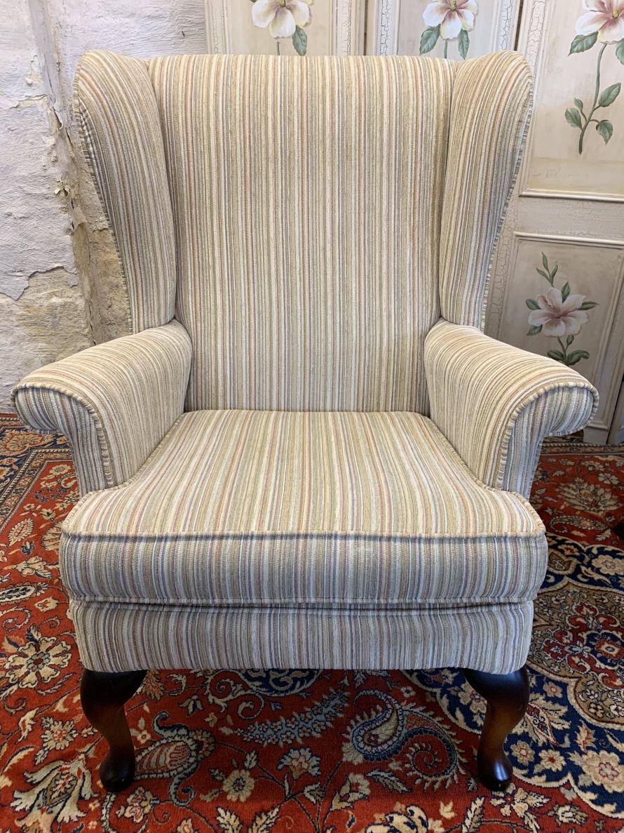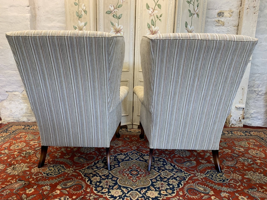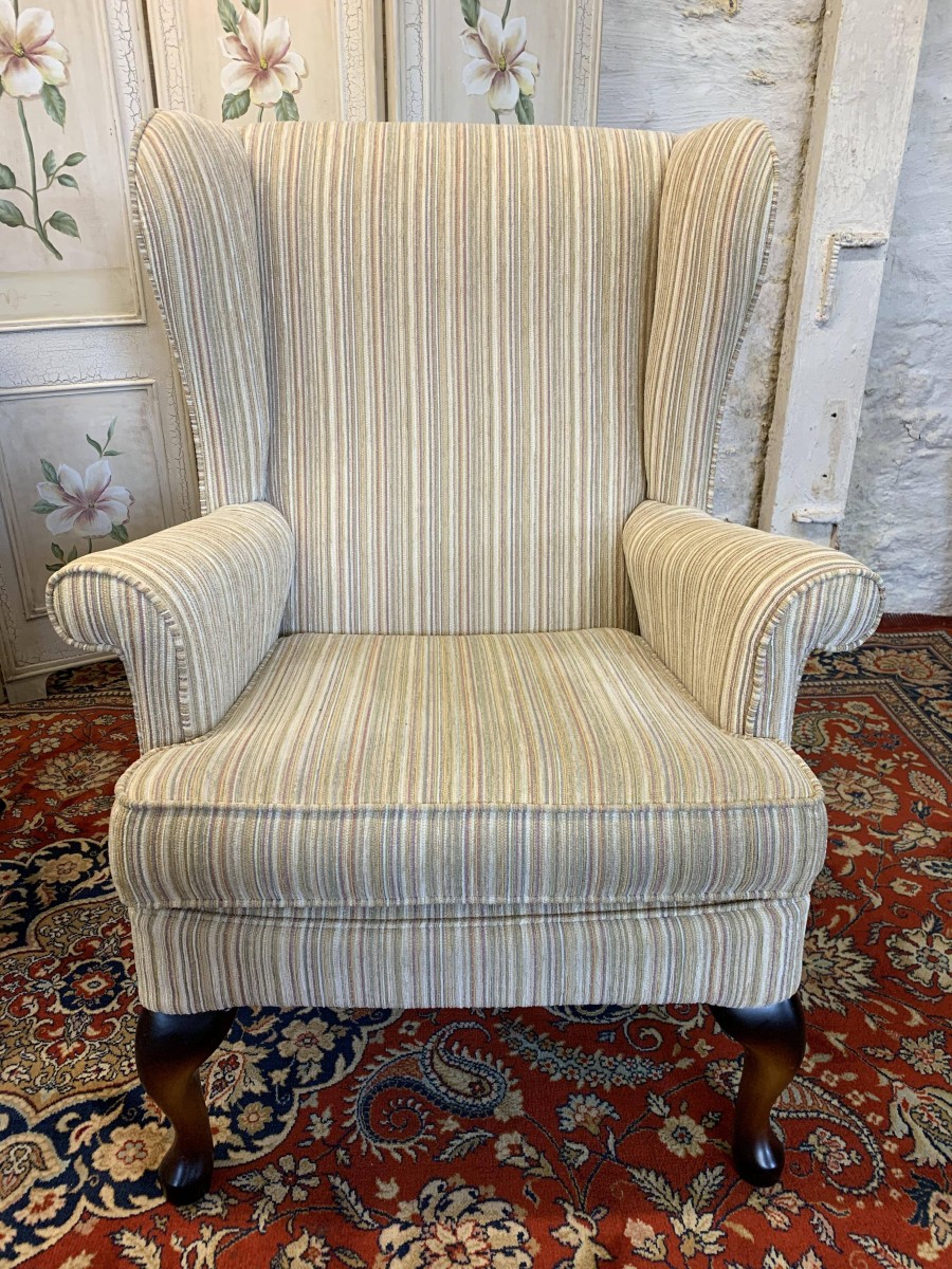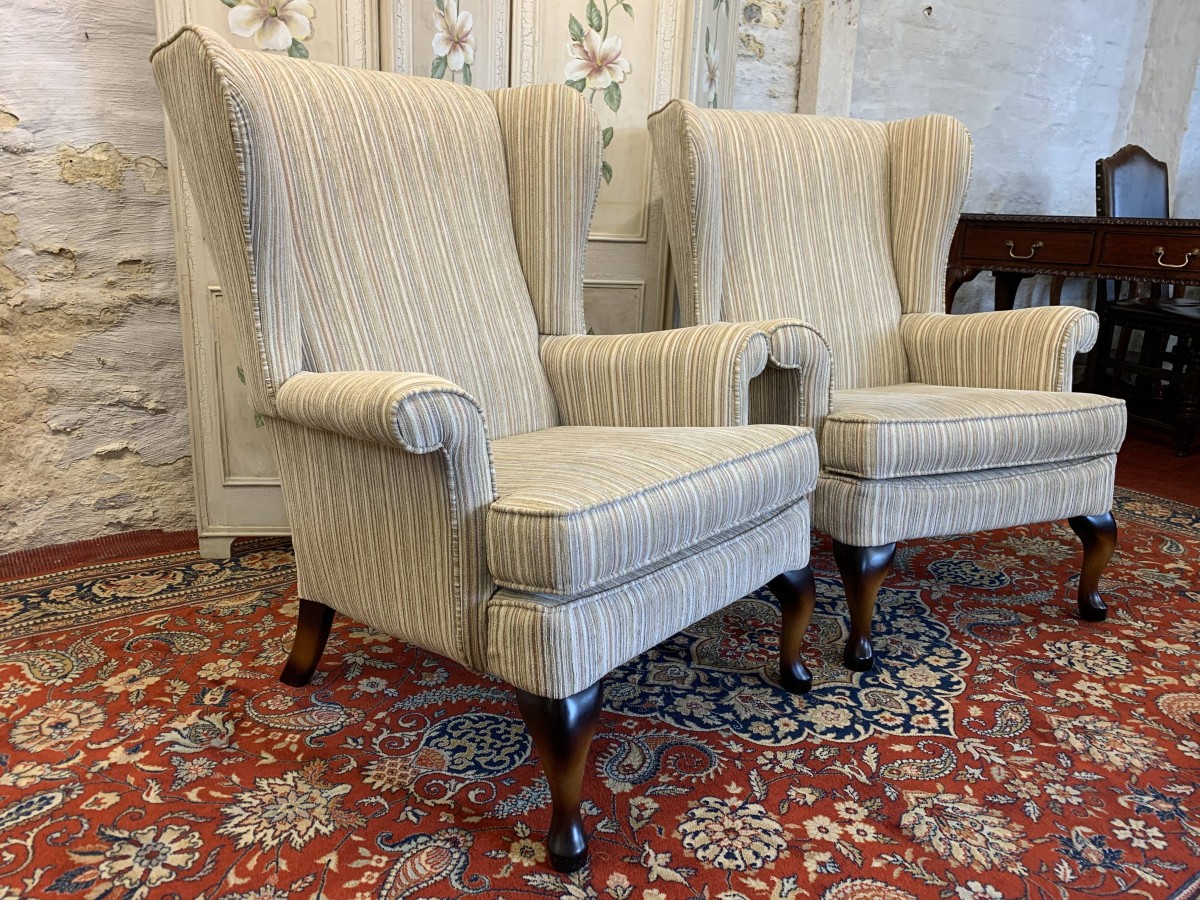 This great pair of armchairs are in excellent condition. Having a slightly sloping back, winged arms these chairs are extremely comfortable. Each arm having a removable arm cover and upholstered cushioned seat. The chairs sit on two cabriole shaped legs to the front.