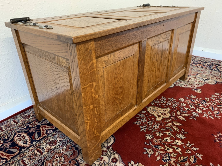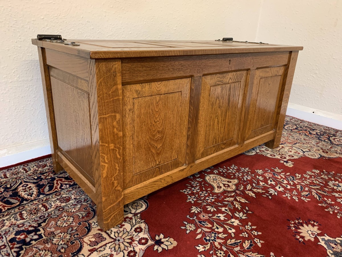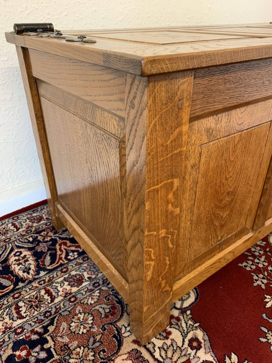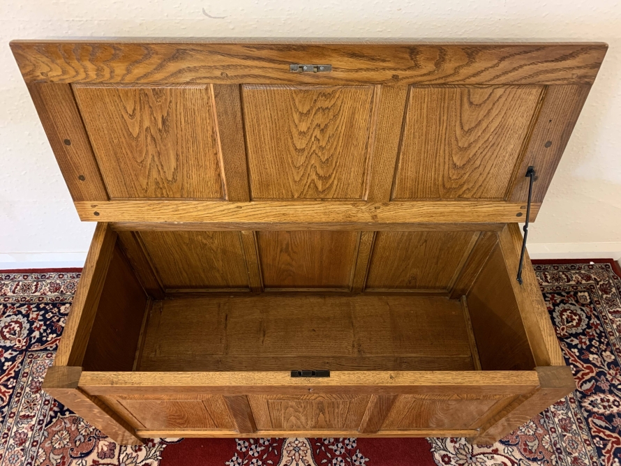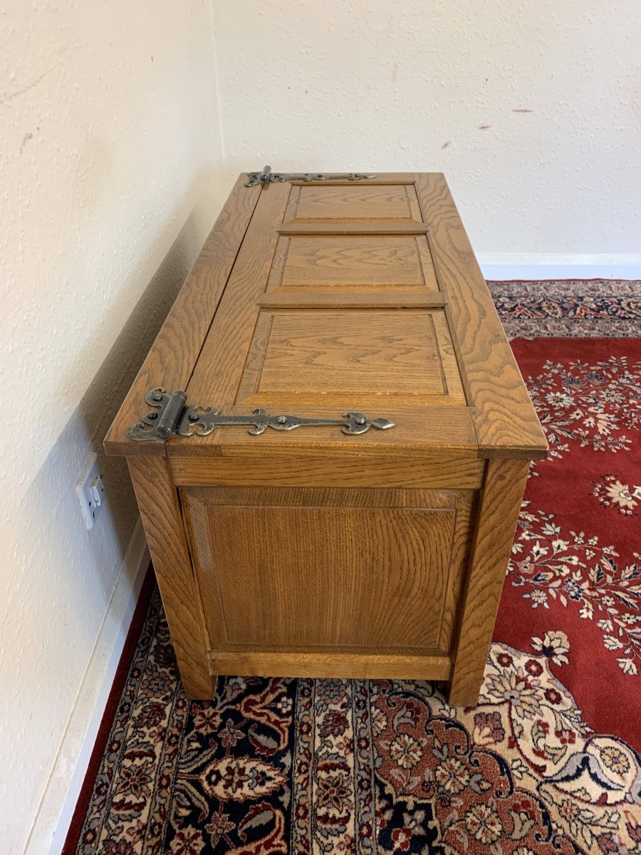 Made entirely of solid oak the lift up lid has three recessed panels and a pair of decorative hinges. Three panels to the front, panelled sides, this super item of oak furniture stands on four block feet