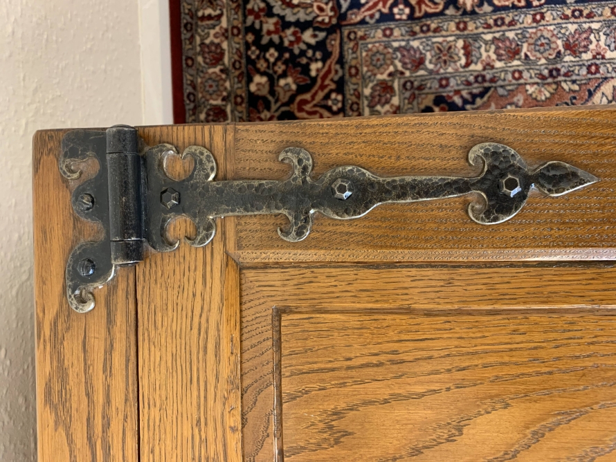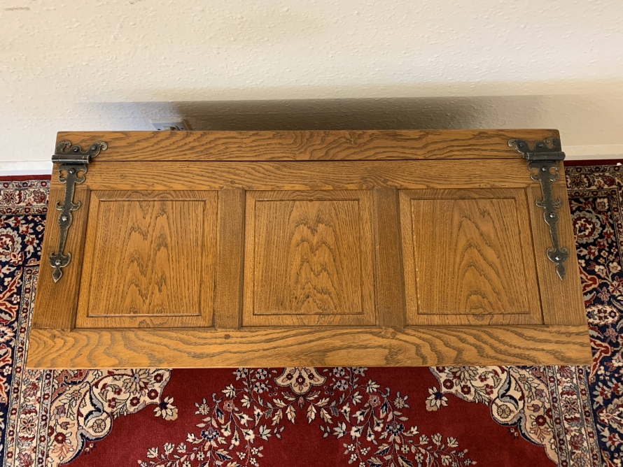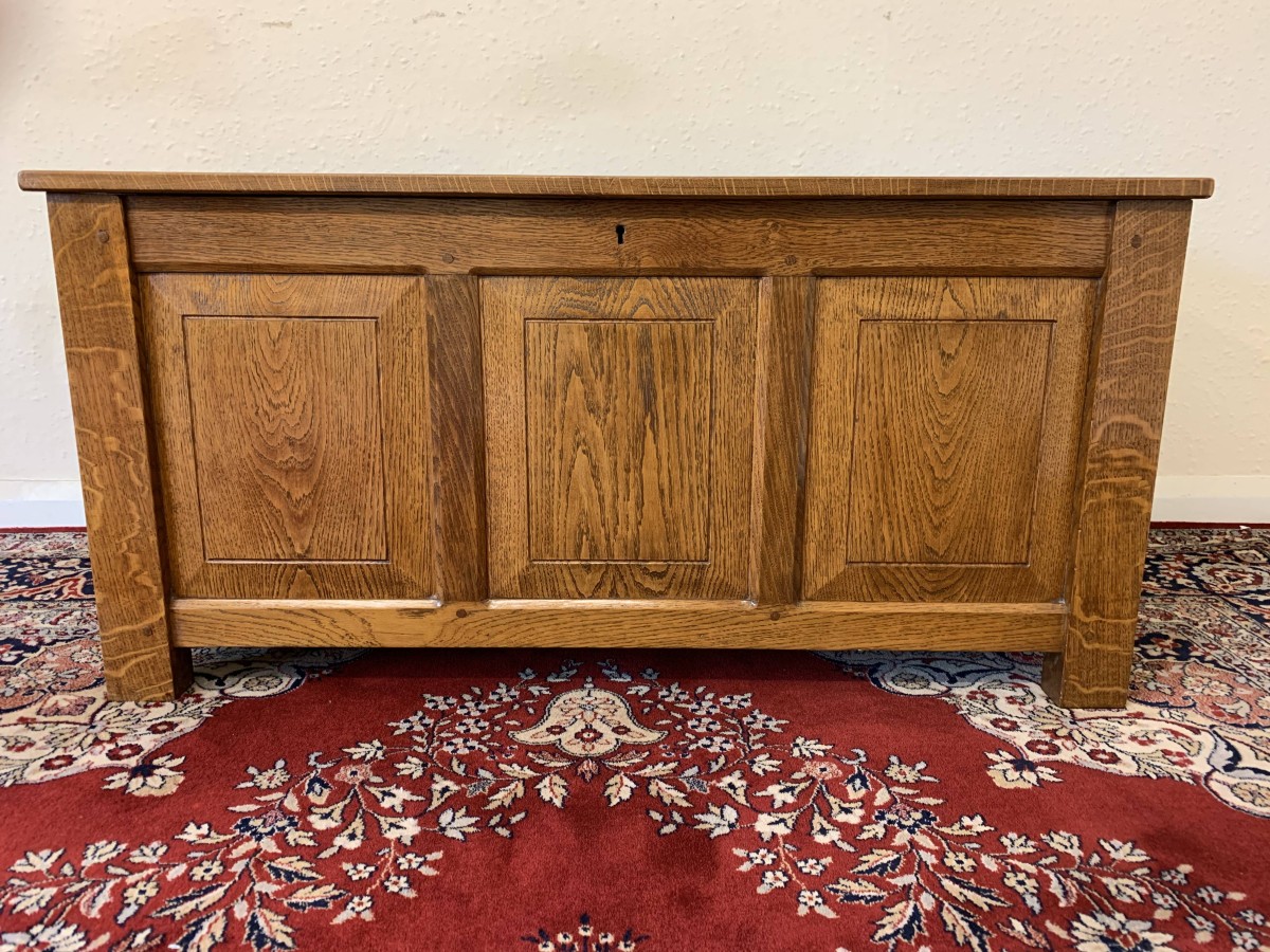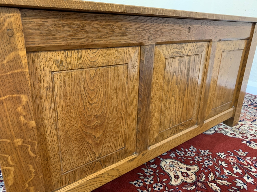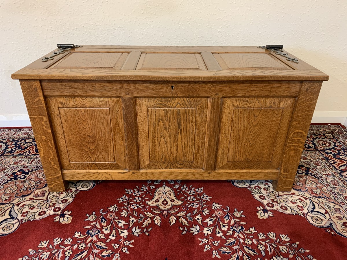 Made entirely of solid oak the lift up lid has three recessed panels and a pair of decorative hinges. Three panels to the front, panelled sides, this super item of oak furniture stands on four block feet