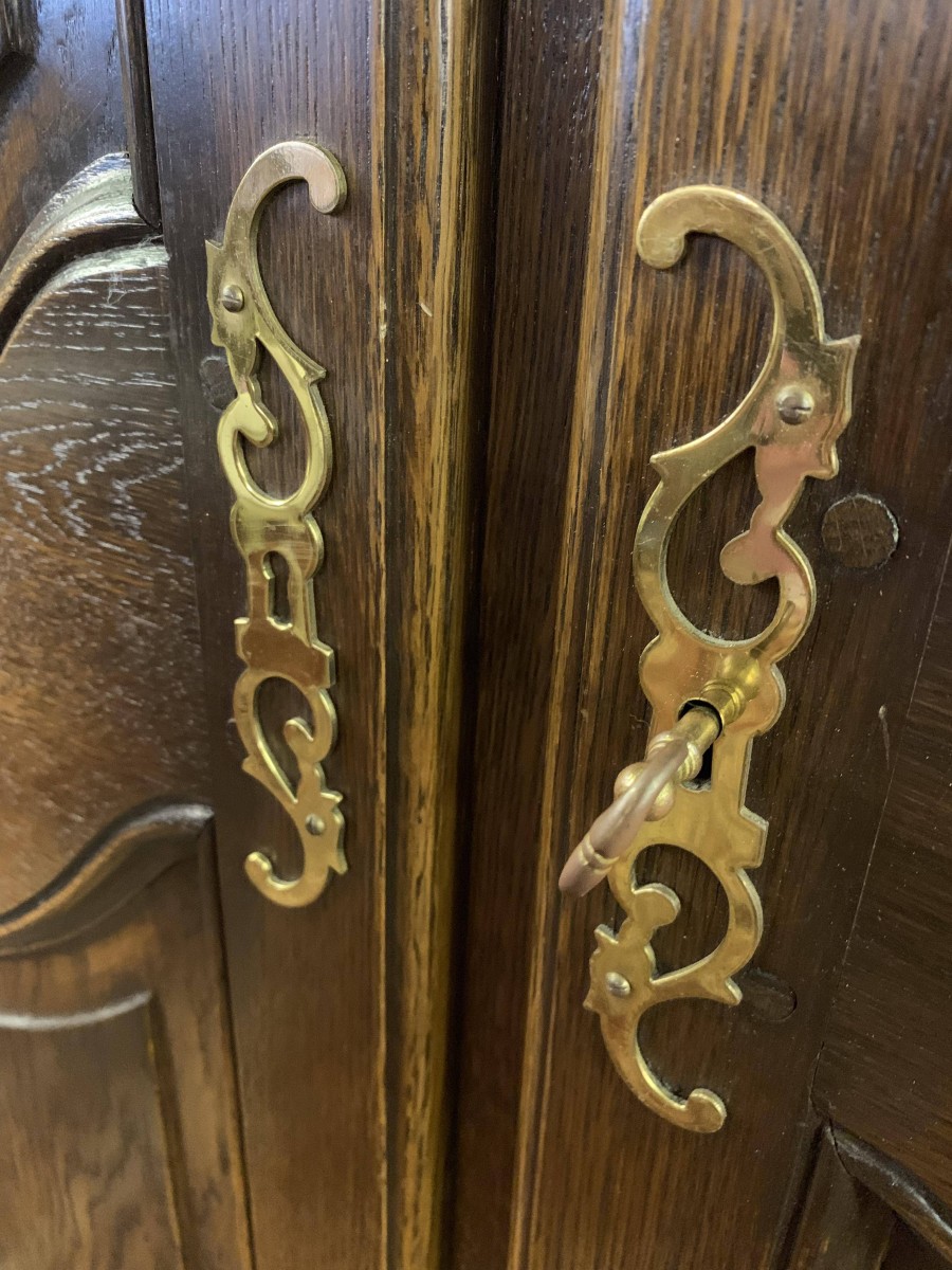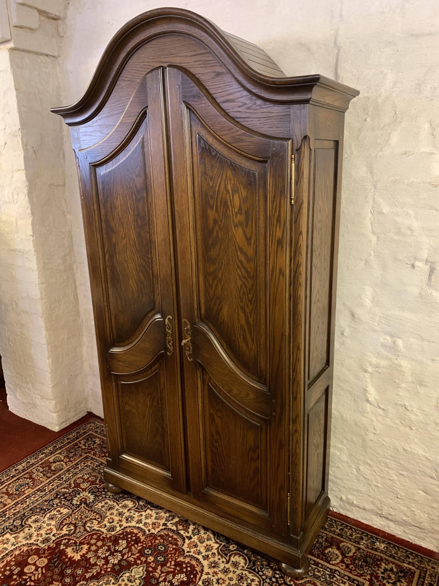 A stunning item of furniture made in solid oak and in pristine condition. The dome top sits above a pair of lockable recessed panelled doors, each door having brass hinges and decorative brass escutcheon. The doors open to reveal five hanging hooks and a brass hanging rail, recessed panelled sides. The cupboard sits on turned feet to the front.