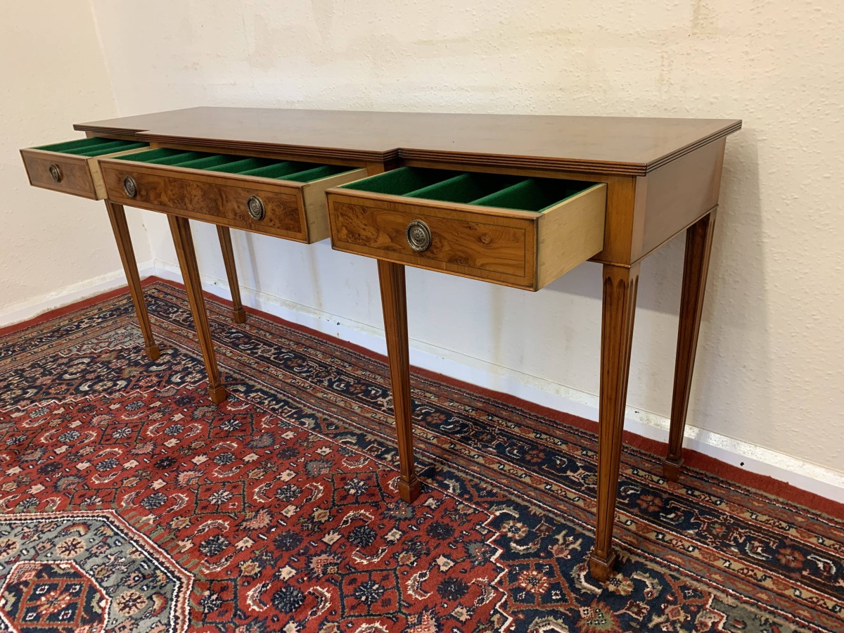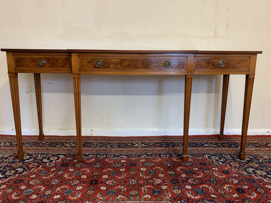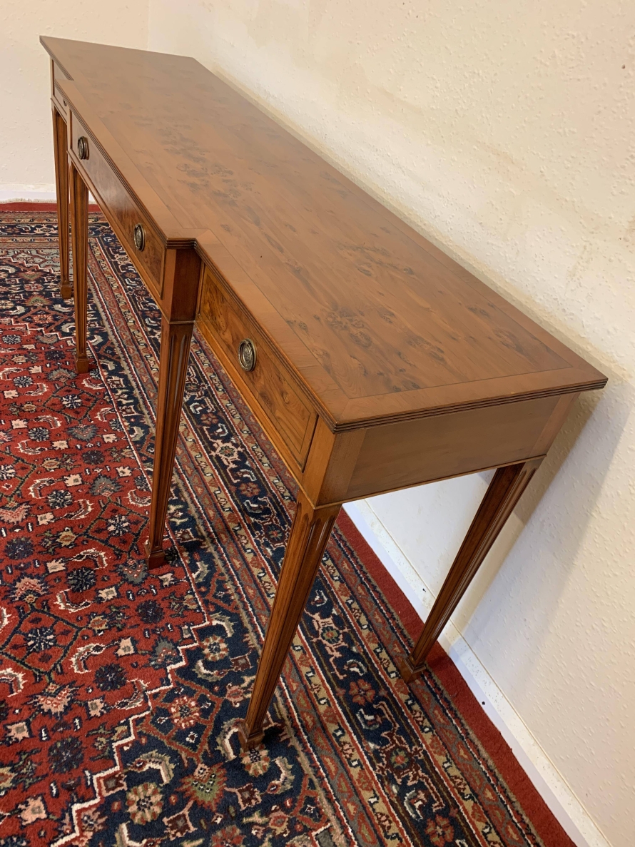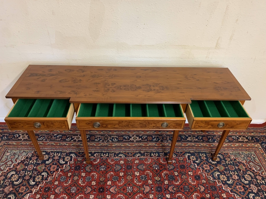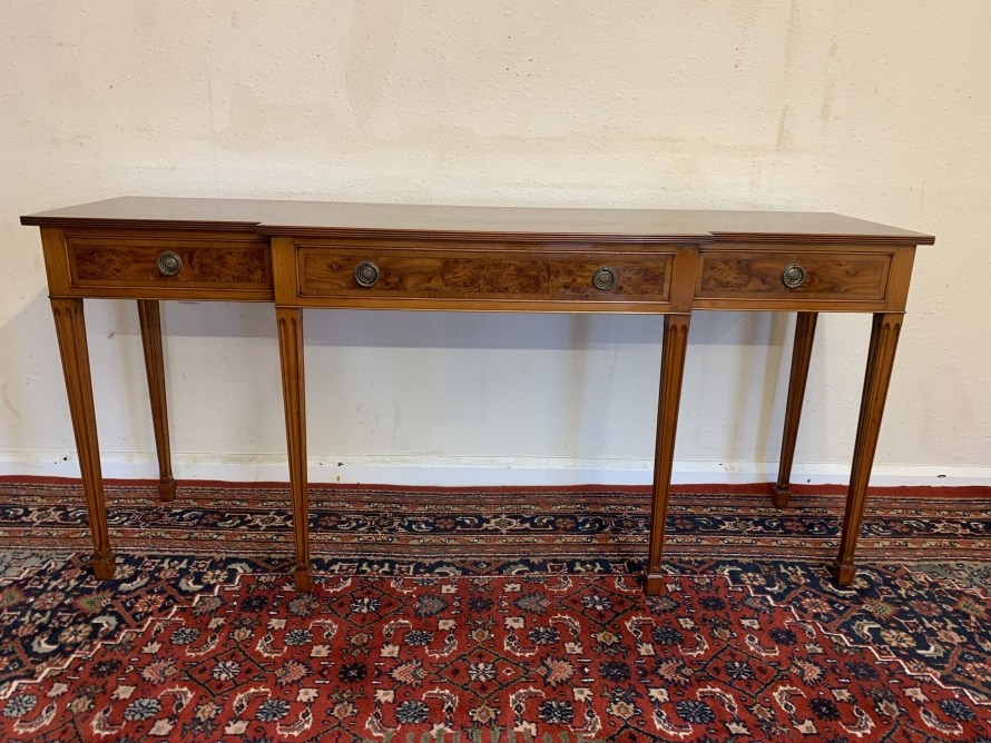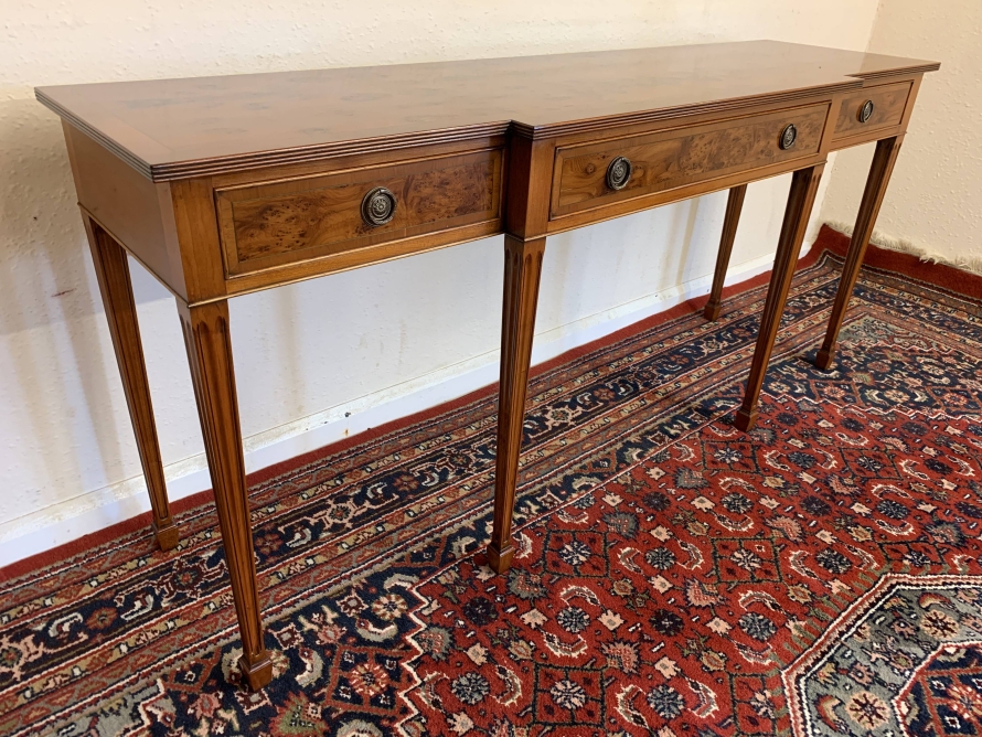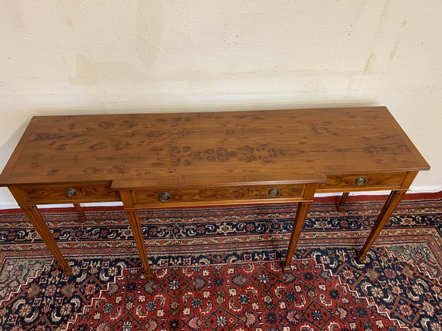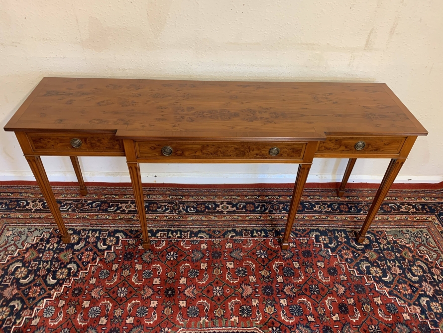 Made in beautiful yew wood and made by the renowned Rackstraw Furniture Company Of Droitwich England. The oversailing top has a string inlay border with reeded decoration to the front and sides. Having a central inlaid drawer, the drawer having a pair of ornate brass handles and flanked by a pair of drawers, each drawer having an ornate brass handle – this quality item stands proud on six reeded tapered legs with traditional block feet.
