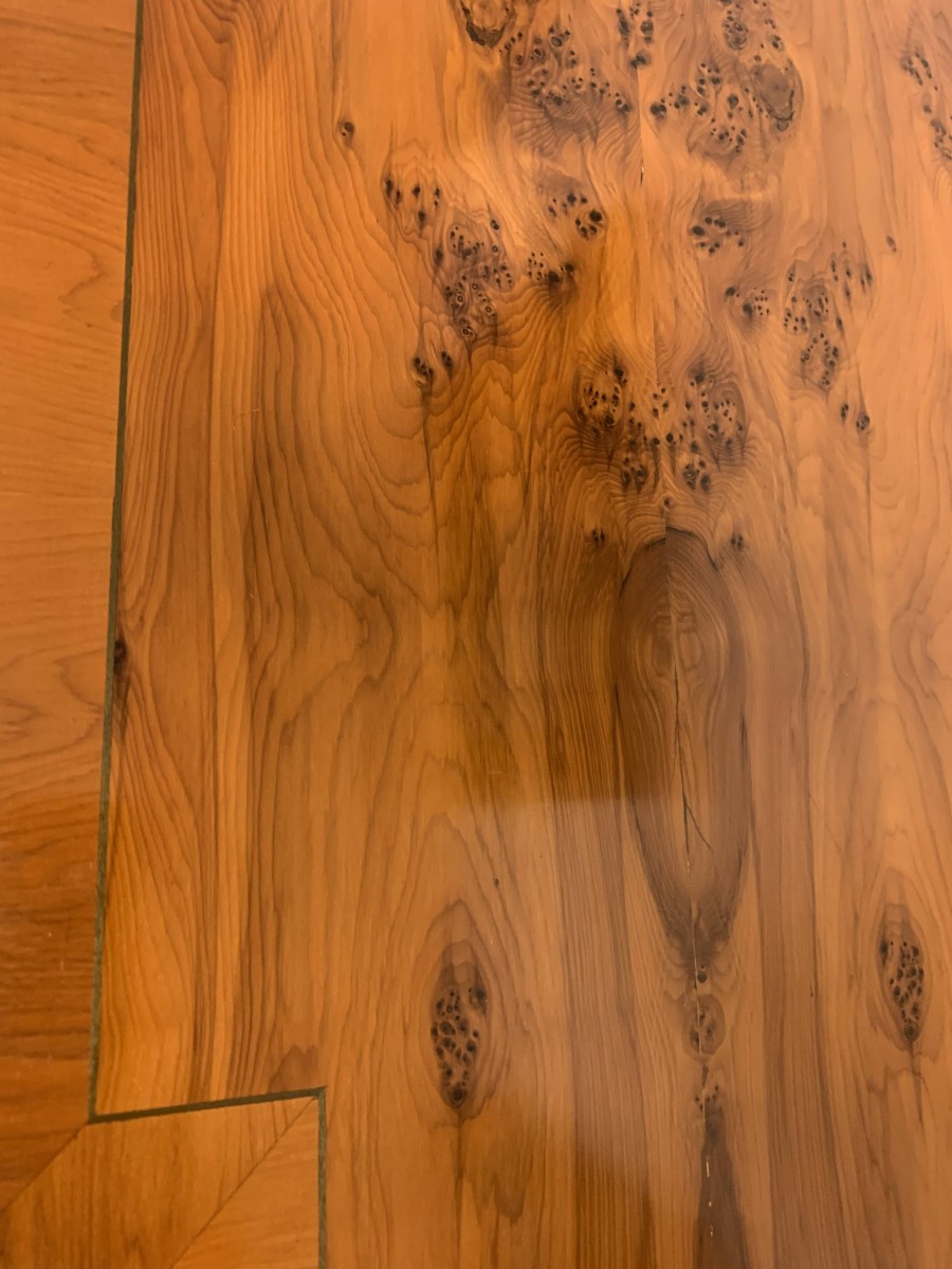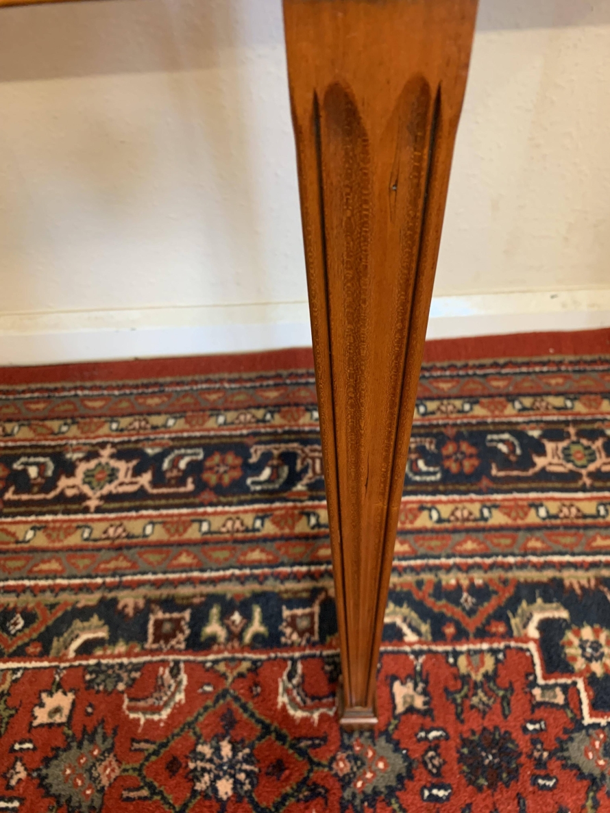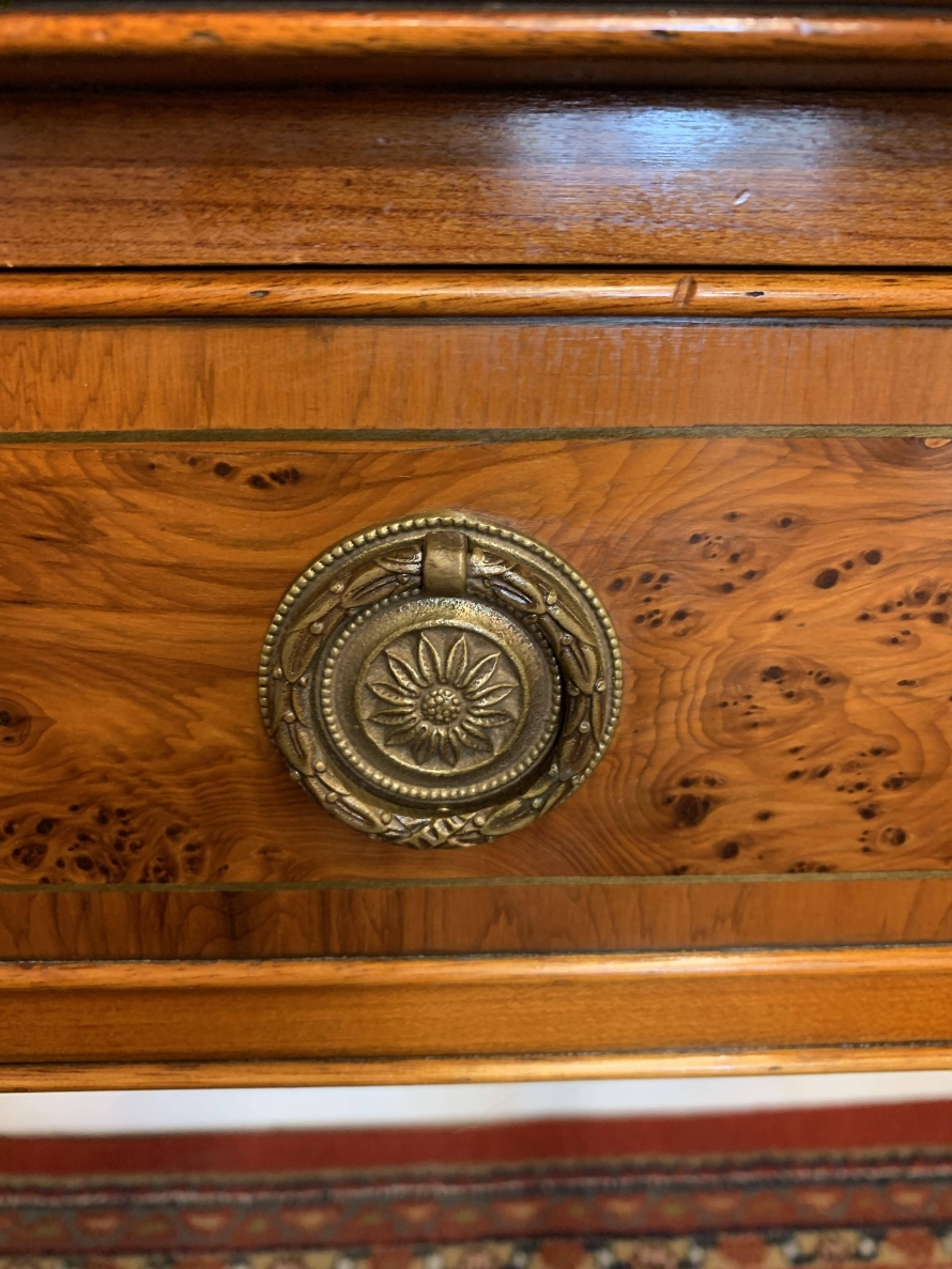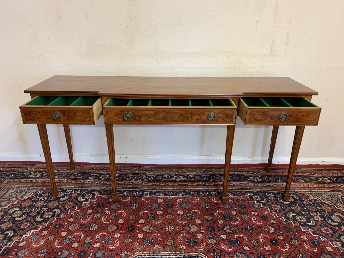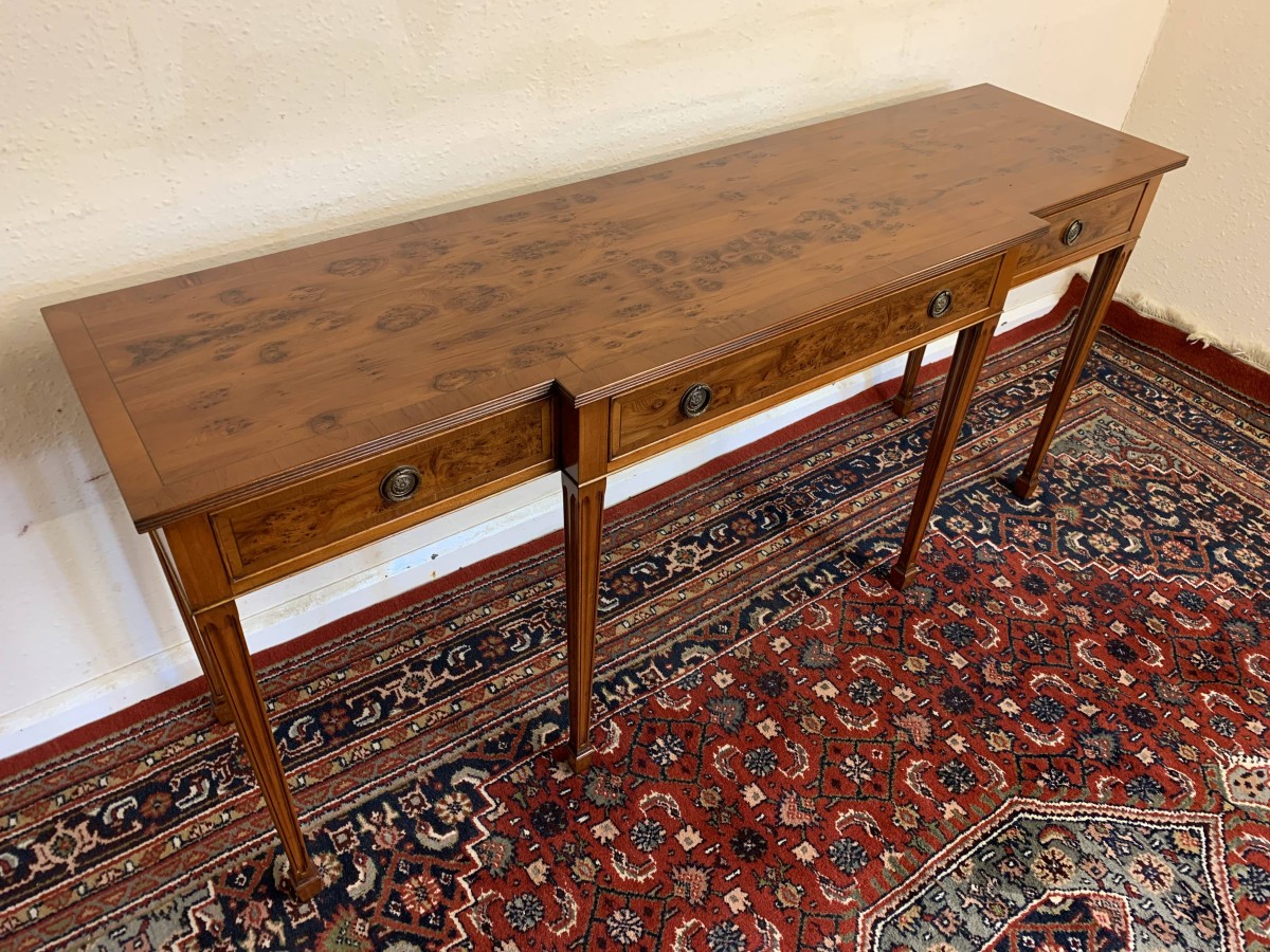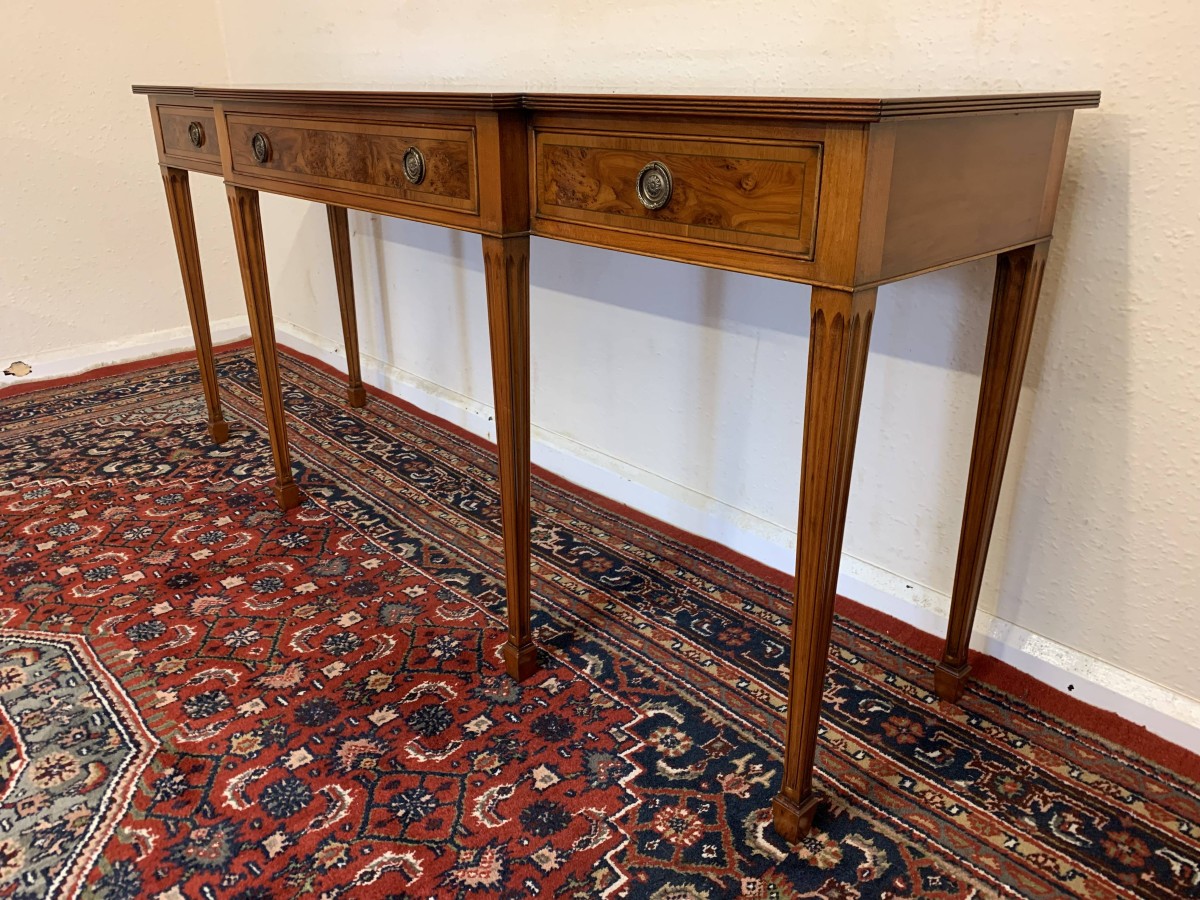 Made in beautiful yew wood and made by the renowned Rackstraw Furniture Company Of Droitwich England. The oversailing top has a string inlay border with reeded decoration to the front and sides. Having a central inlaid drawer, the drawer having a pair of ornate brass handles and flanked by a pair of drawers, each drawer having an ornate brass handle – this quality item stands proud on six reeded tapered legs with traditional block feet.