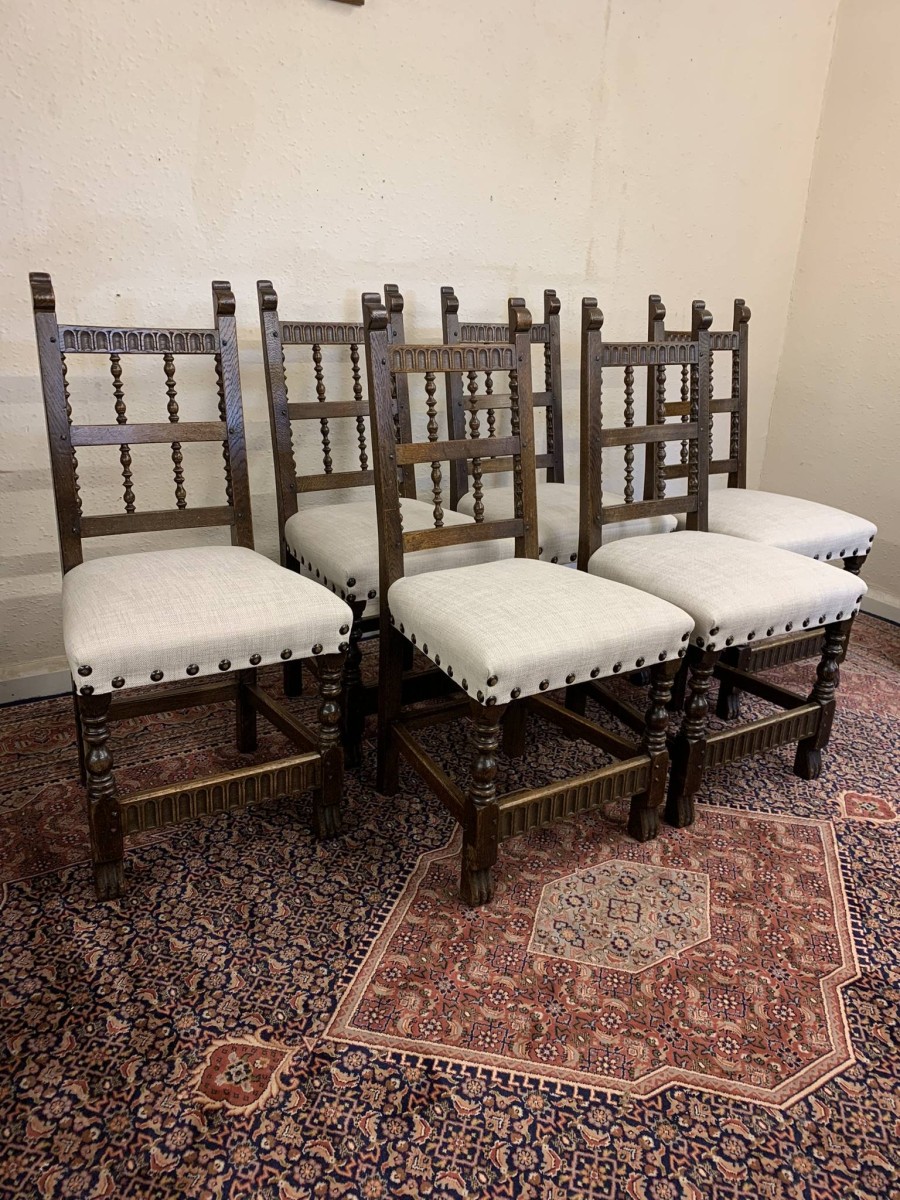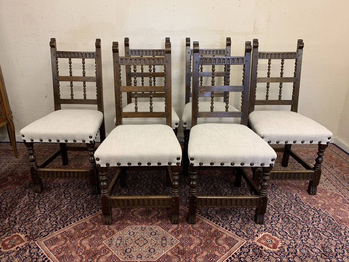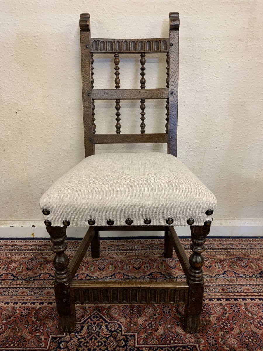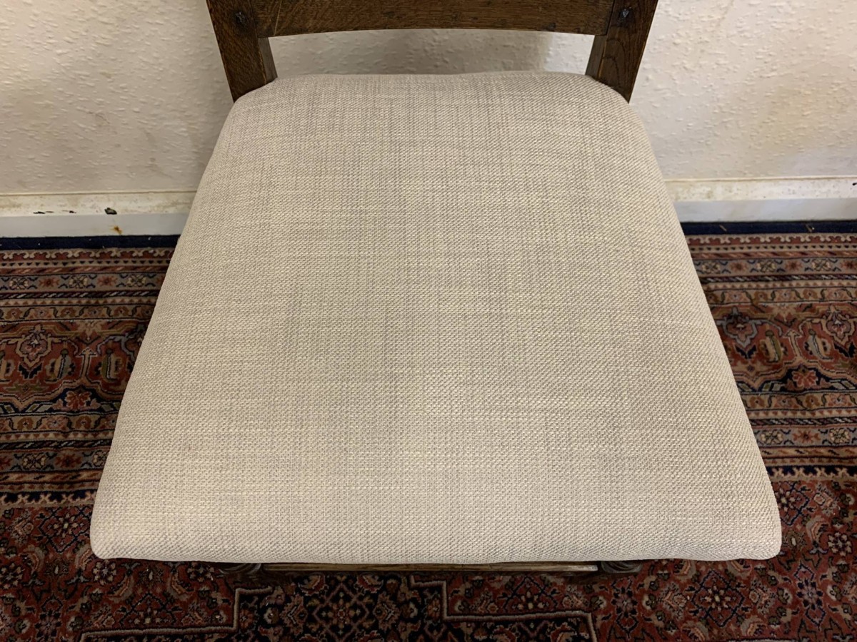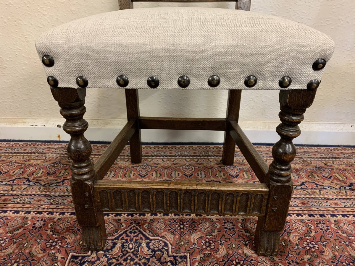 Made by the renowned Nigel Rupert Griffiths furniture company this set of six chairs are in excellent condition. The chairs are made in the monastic style and are all solid oak. The chairs have new upholstery in a neutral shade and have traditional brass studded decoration.
