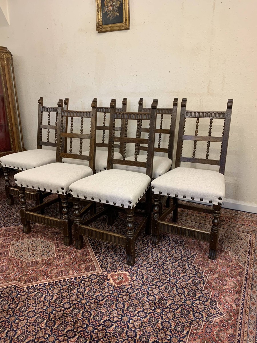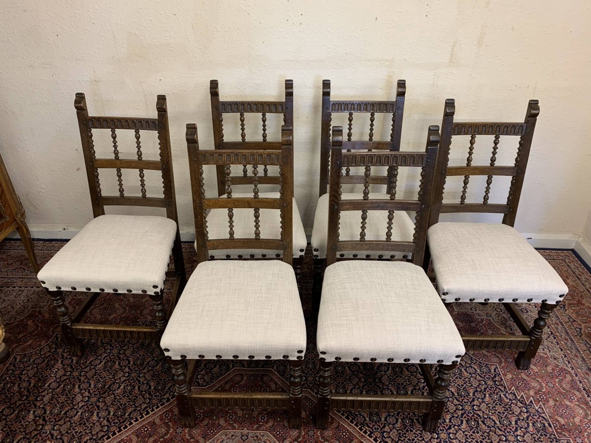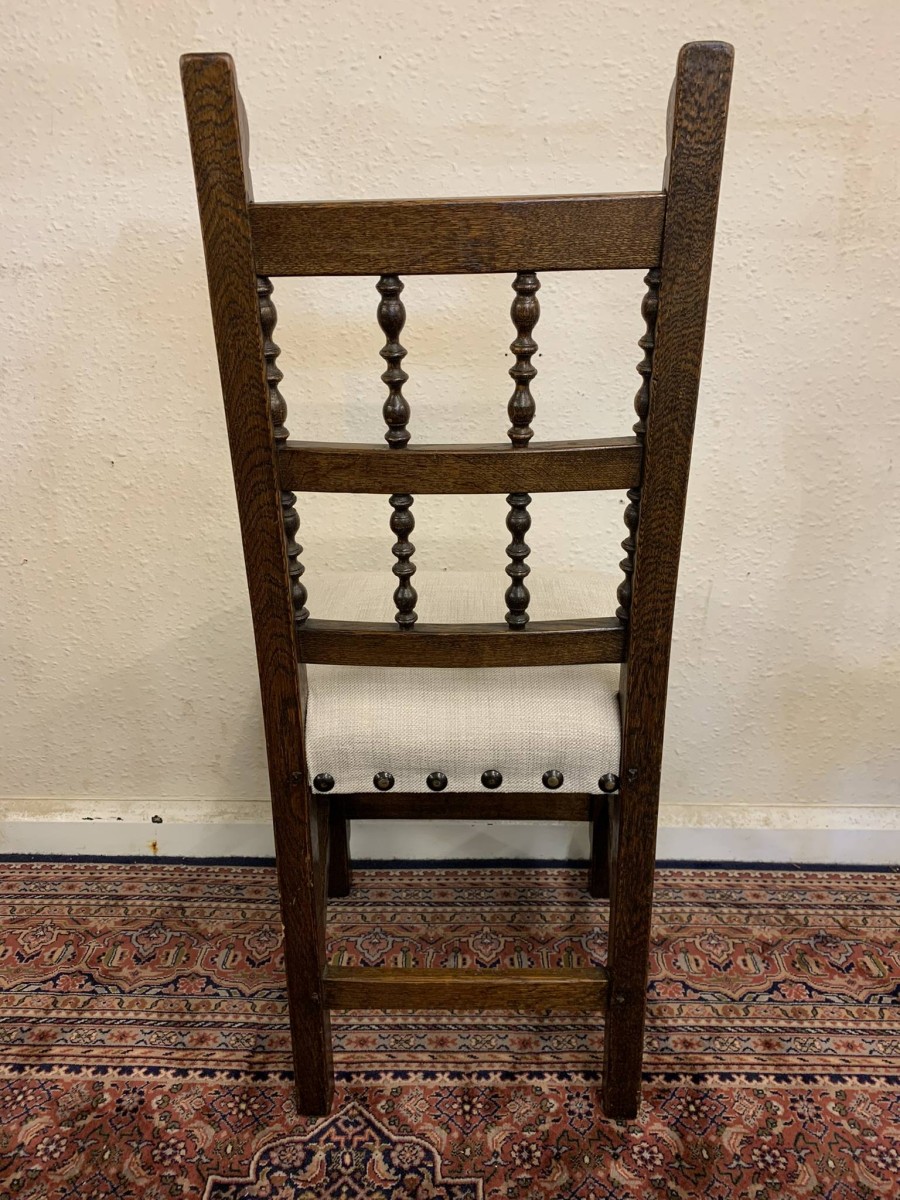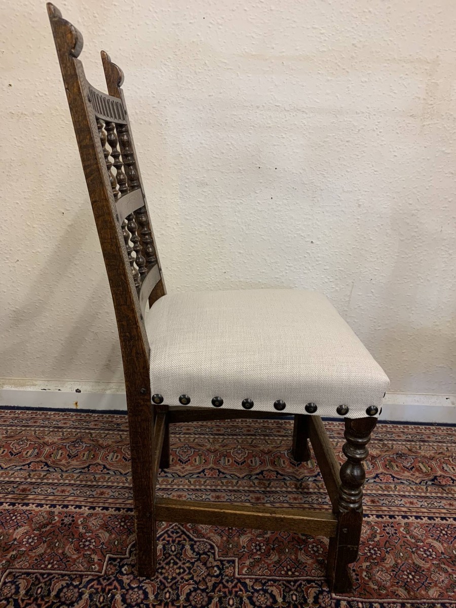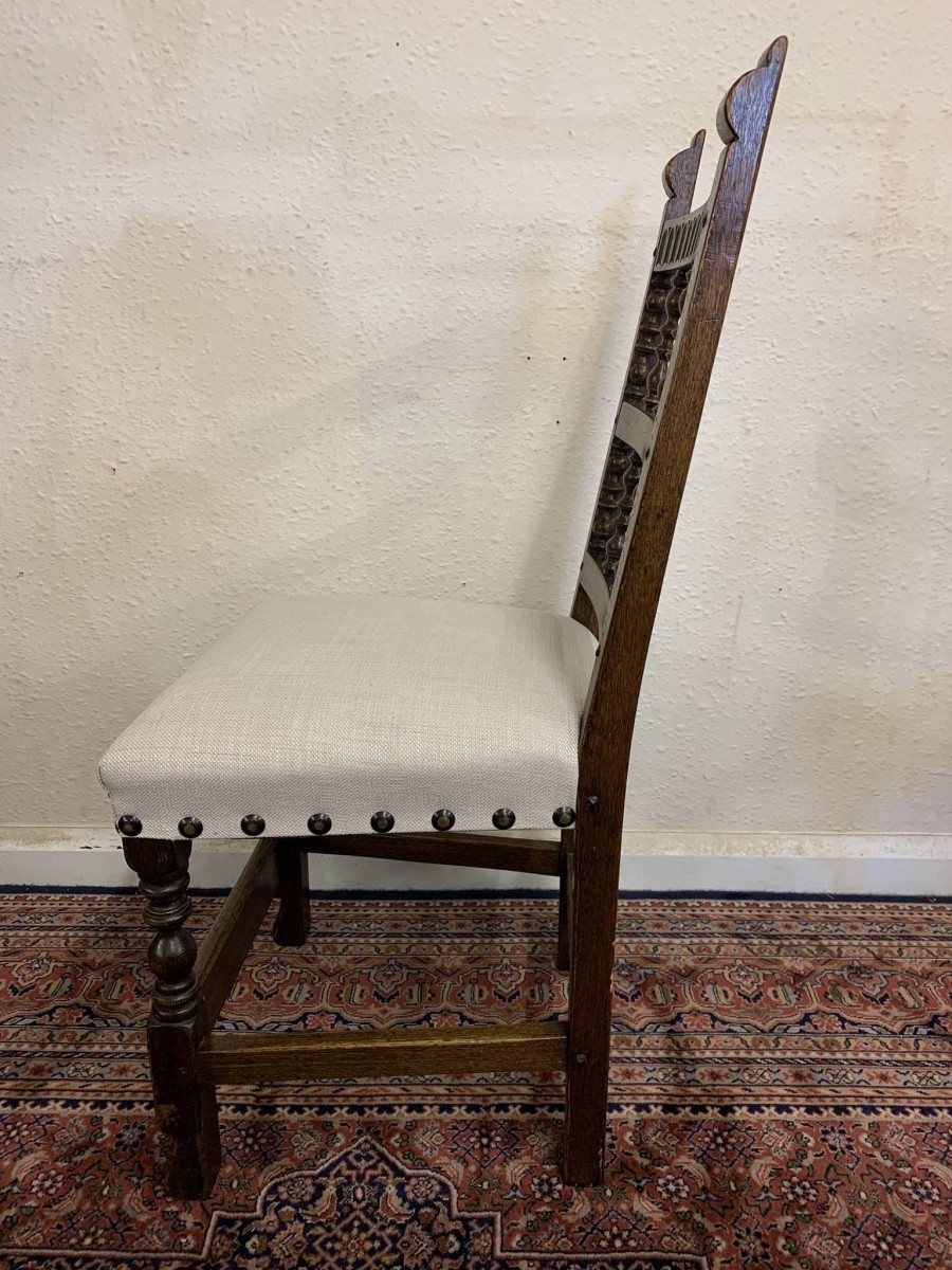 Made by the renowned Nigel Rupert Griffiths furniture company this set of six chairs are in excellent condition. The chairs are made in the monastic style and are all solid oak. The chairs have new upholstery in a neutral shade and have traditional brass studded decoration.