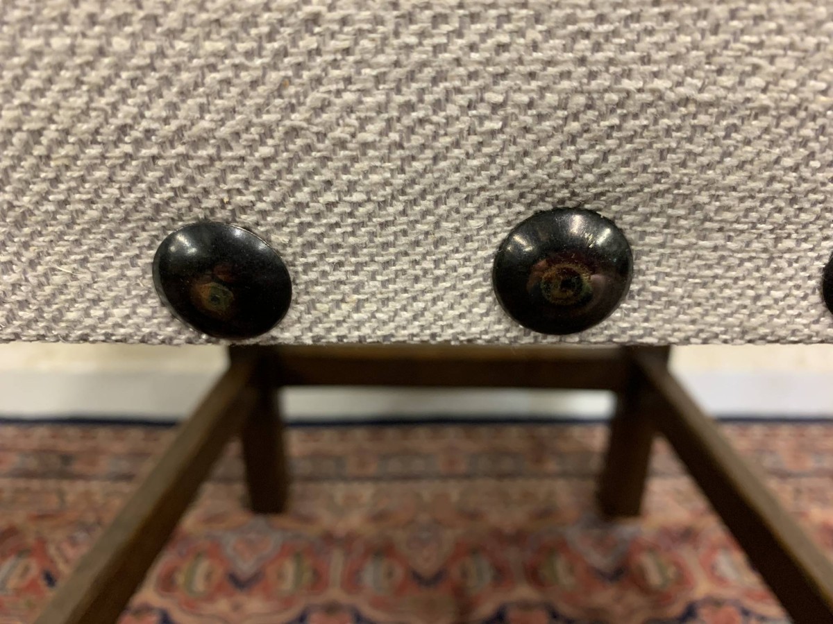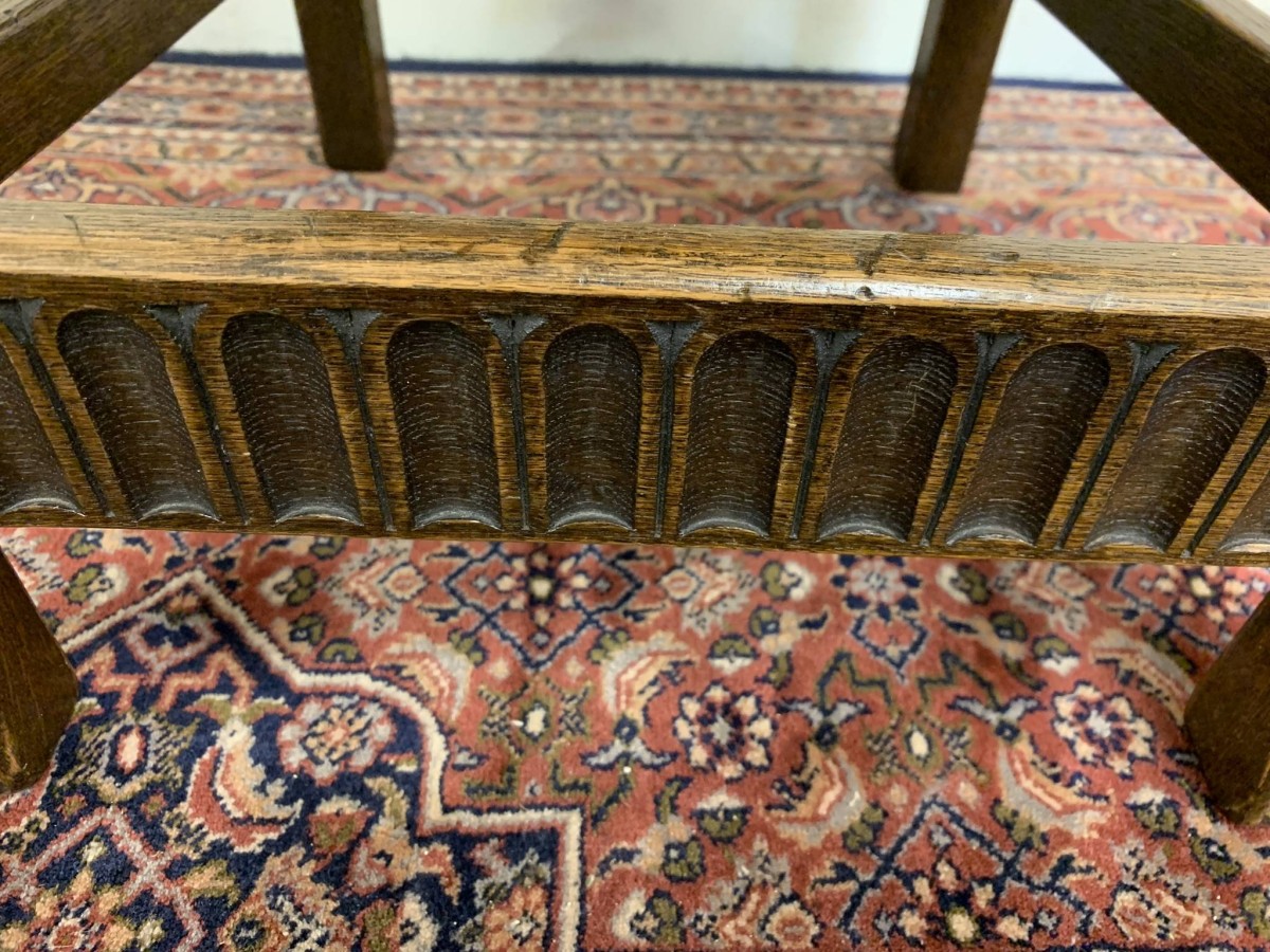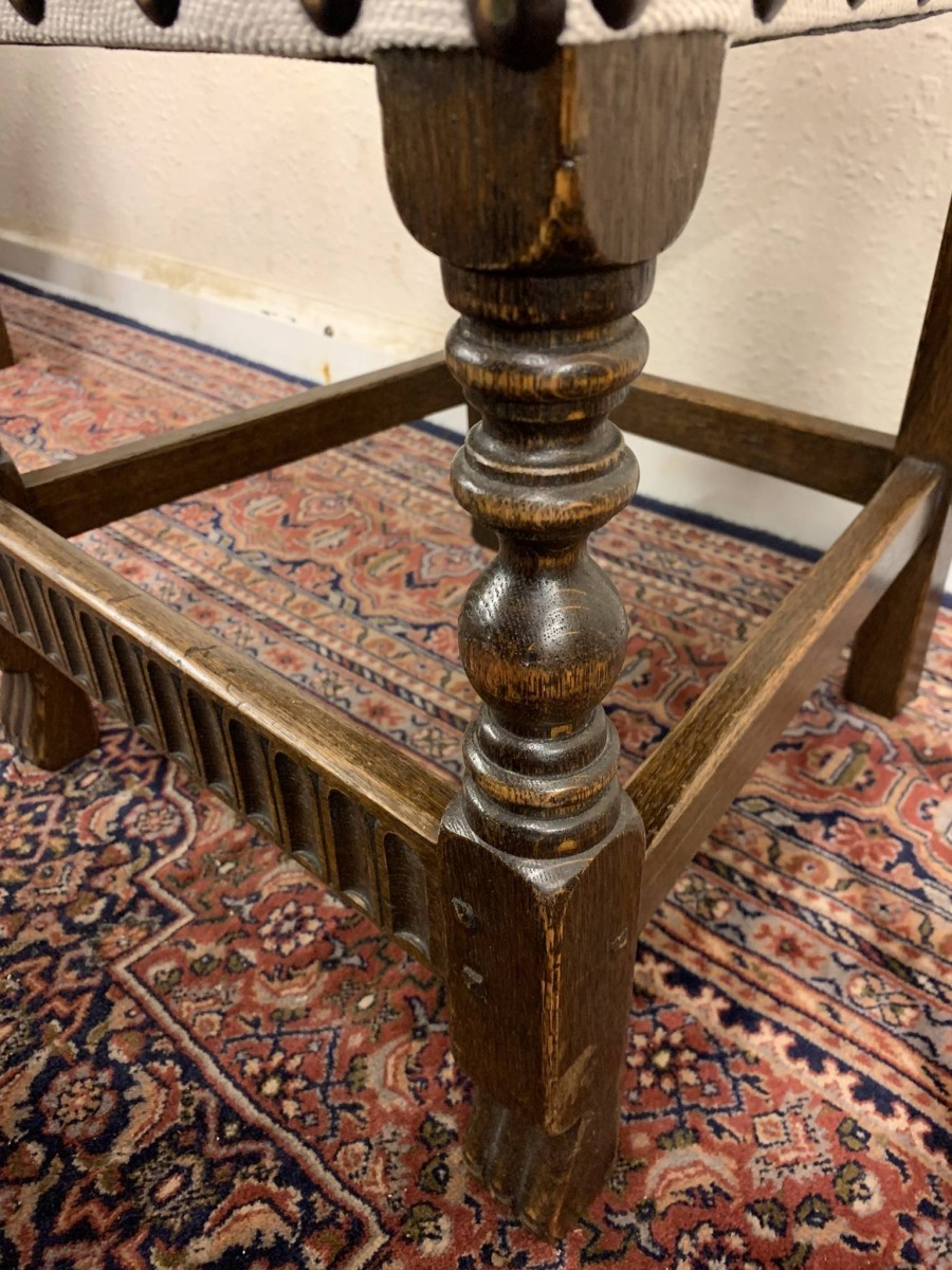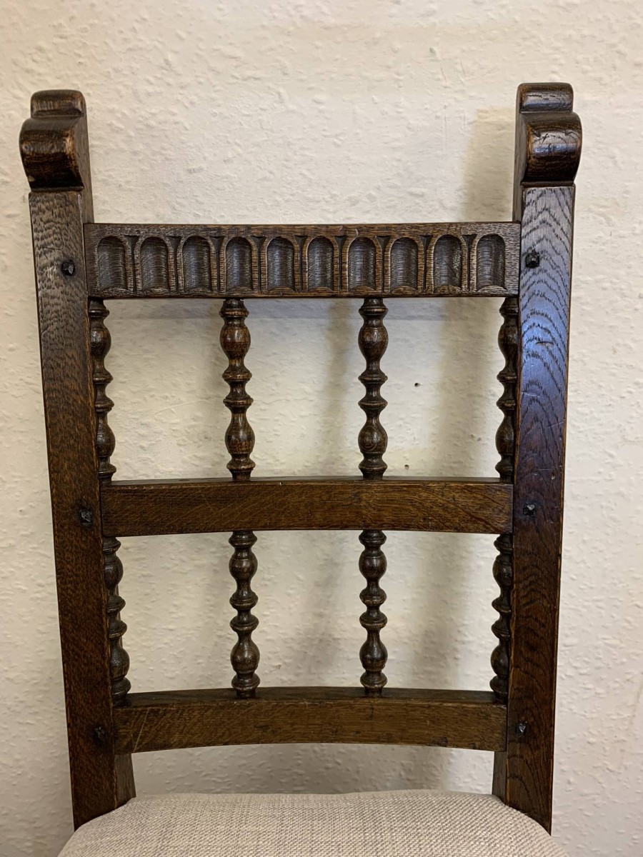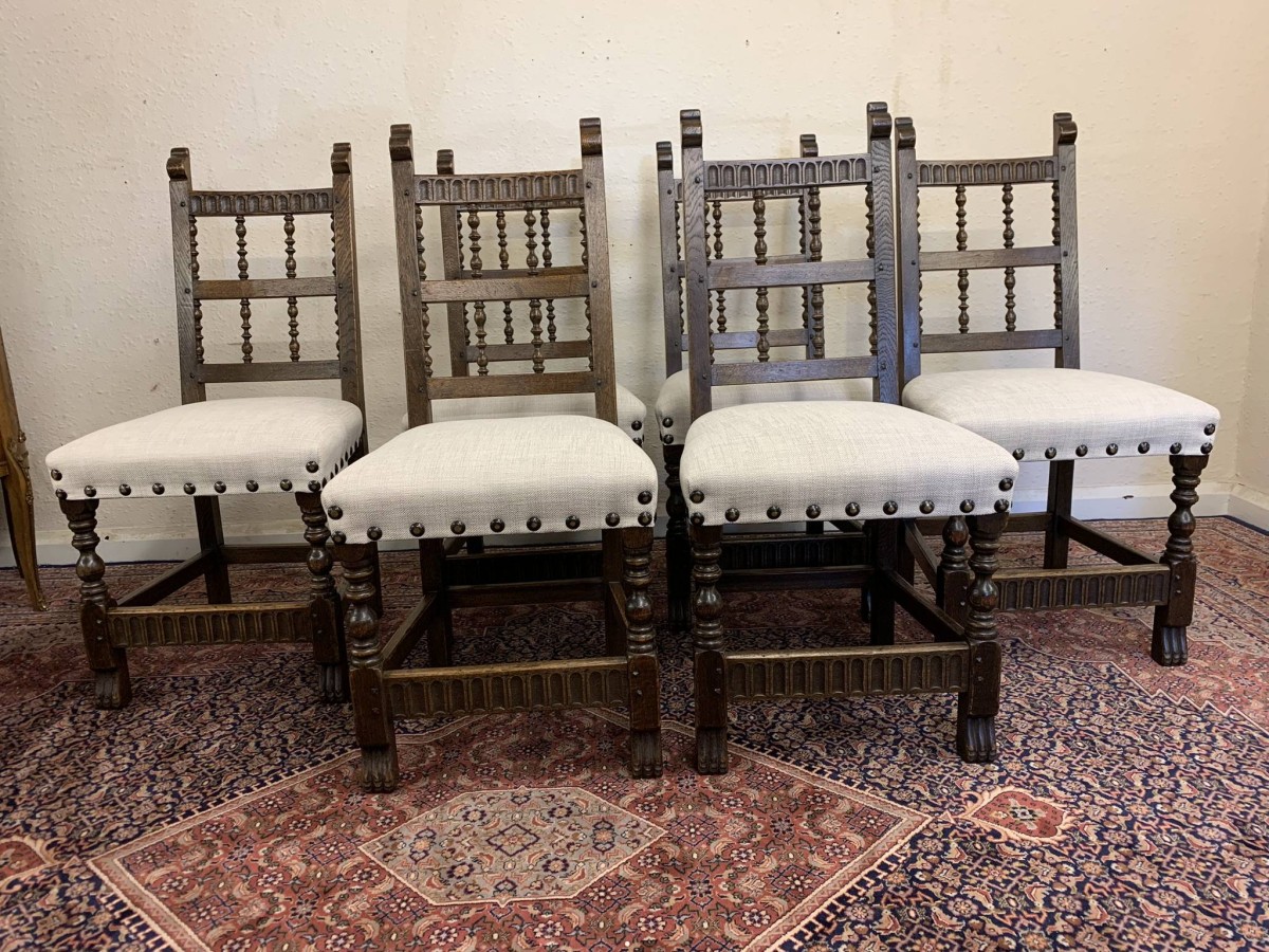 Made by the renowned Nigel Rupert Griffiths furniture company this set of six chairs are in excellent condition. The chairs are made in the monastic style and are all solid oak. The chairs have new upholstery in a neutral shade and have traditional brass studded decoration.