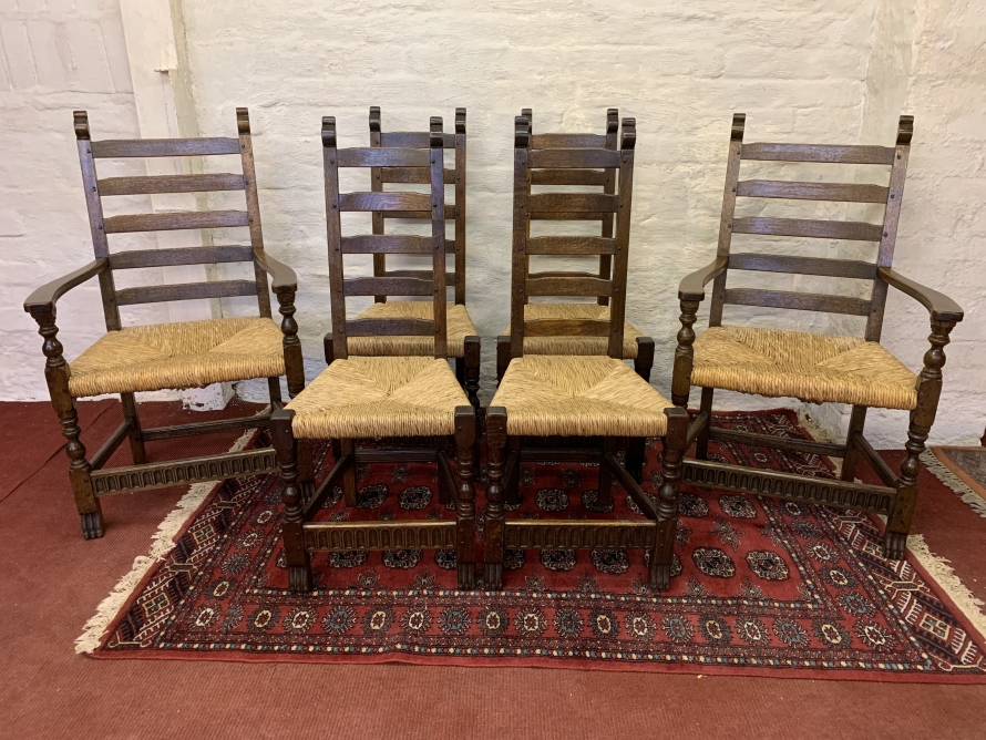 Made entirely of solid oak by the renowned Rupert Nigel Griffiths furniture makers. Individually crafted in glorious solid oak with a beautiful graining. There are two carver armchairs and four single chairs. Each chair having a shaped ladderback for added comfort and with visible peg joints throughout for extra strength. Turned legs to the front with a carved front stretcher the chairs stand on carved paw feet to the front. Each chair having a high quality rush seat.