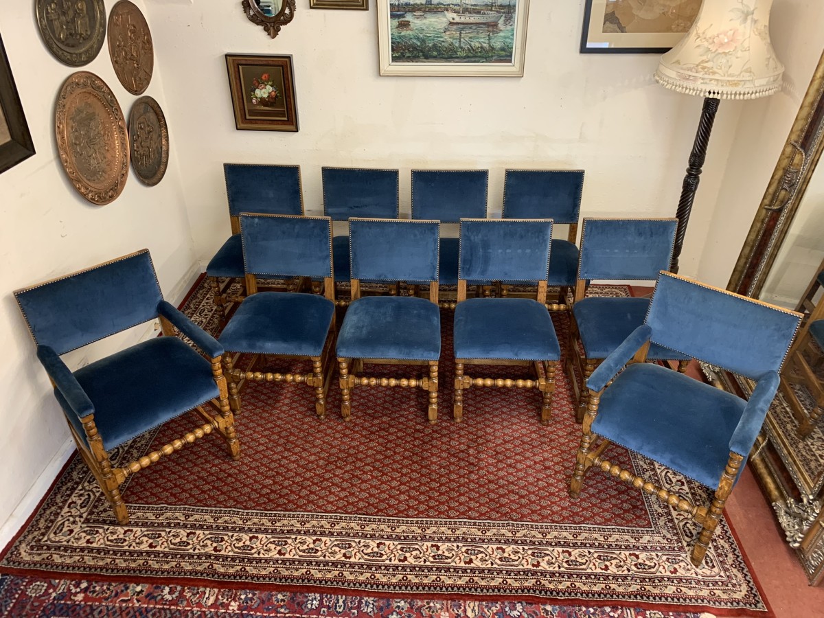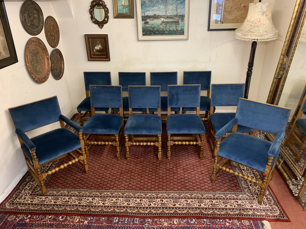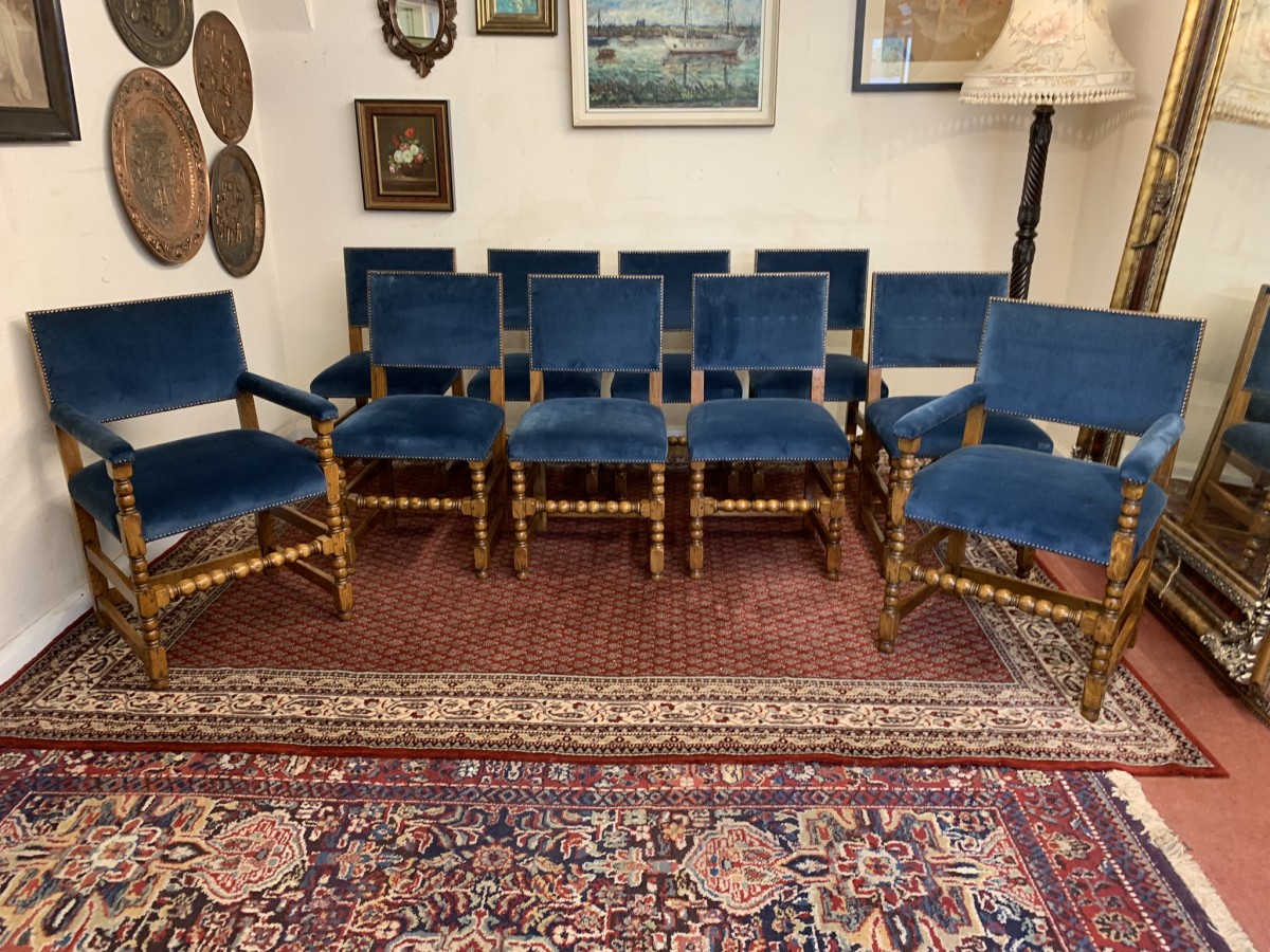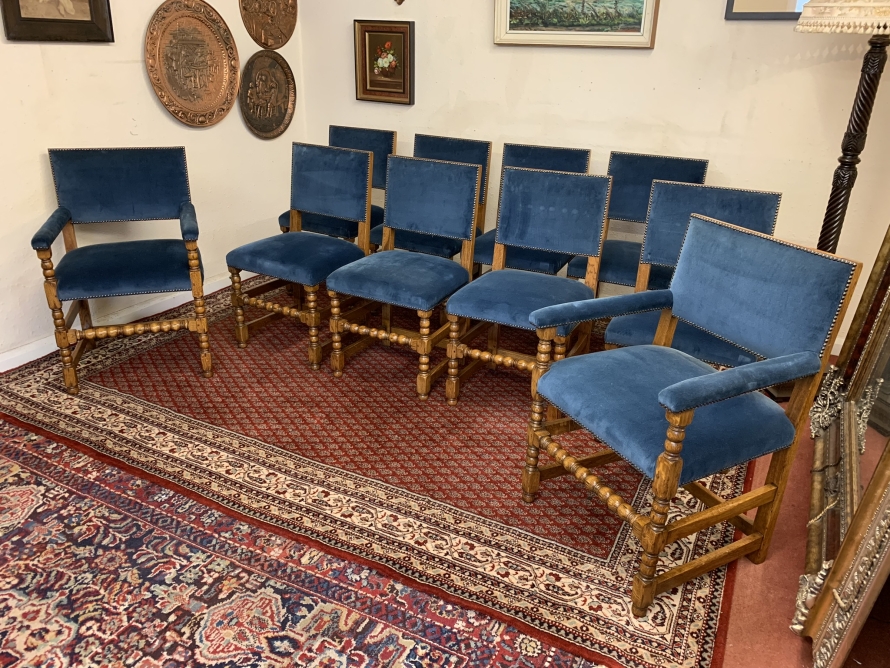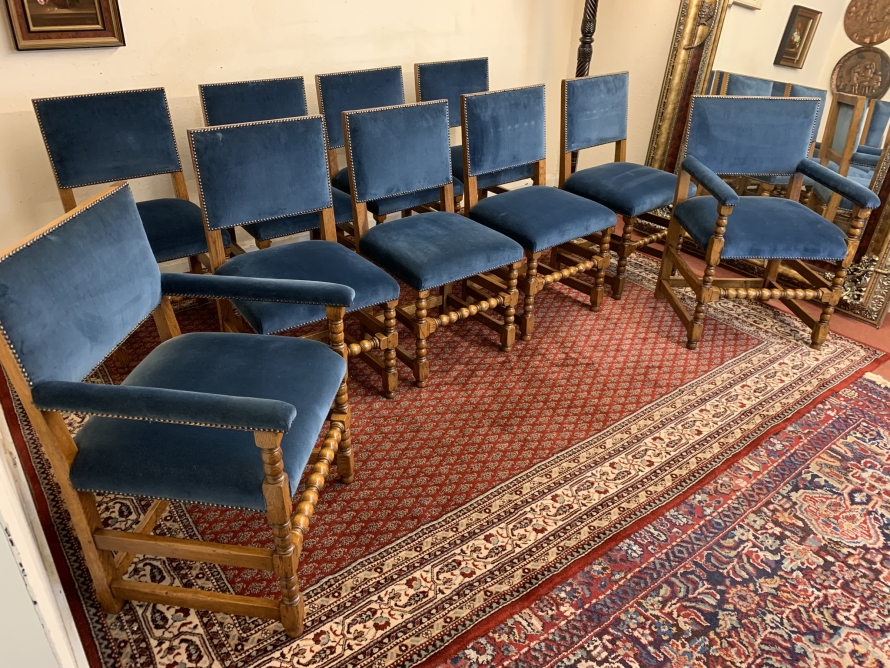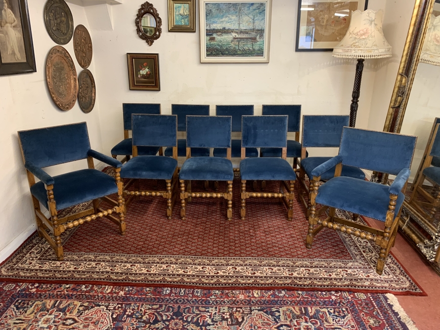 This fabulous set of ten dining chairs are made in glorious solid oak and are in excellent condition, they are sturdy chairs and extremely comfortable. The set of ten chairs consist of two carver arm chairs and eight single chairs. Each chair having back and seated blue cushioned upholstery with brass studded edging. Peg jointed throughout, bobbin front stretcher supports and legs the chairs stand on turned feet to the front. Please note also we are also listing is a matching country oak refectory table (as pictured)