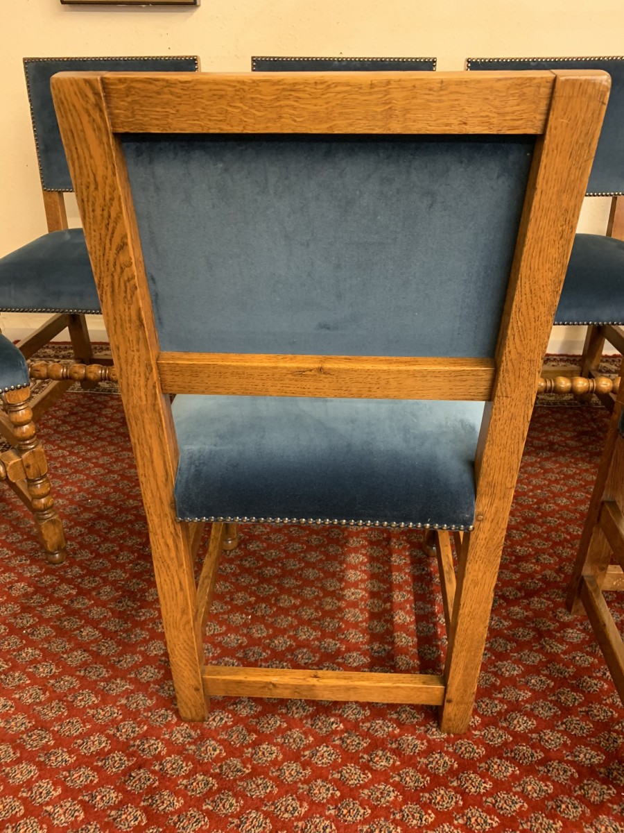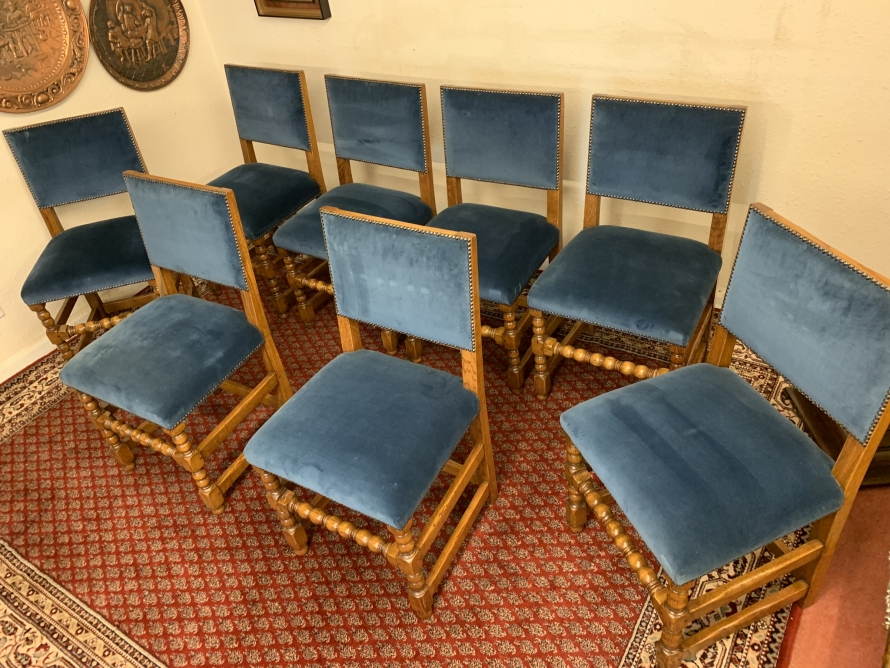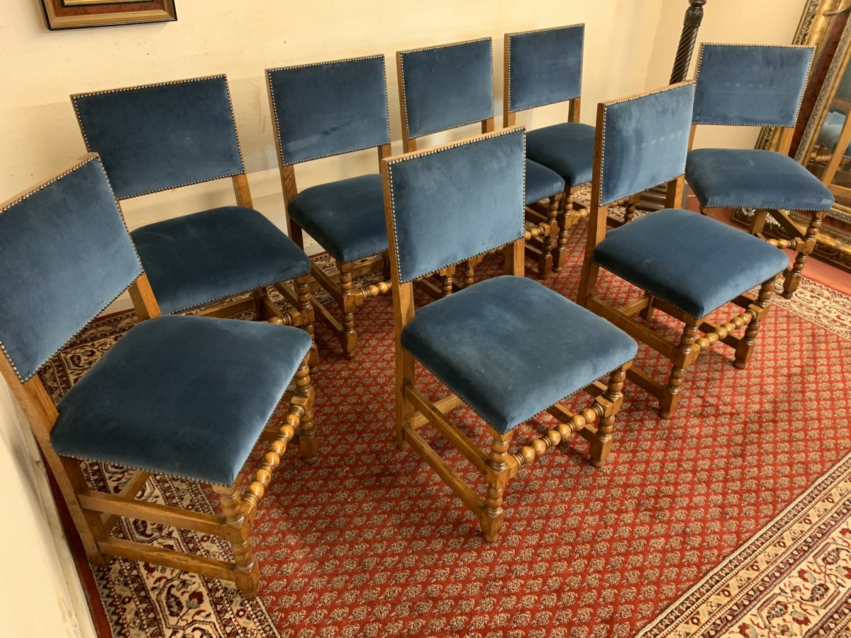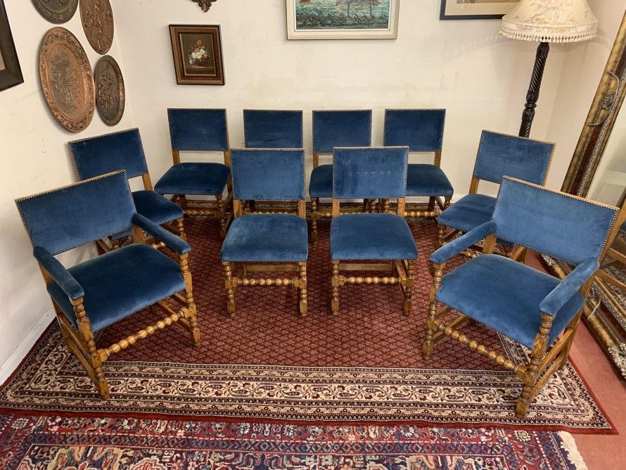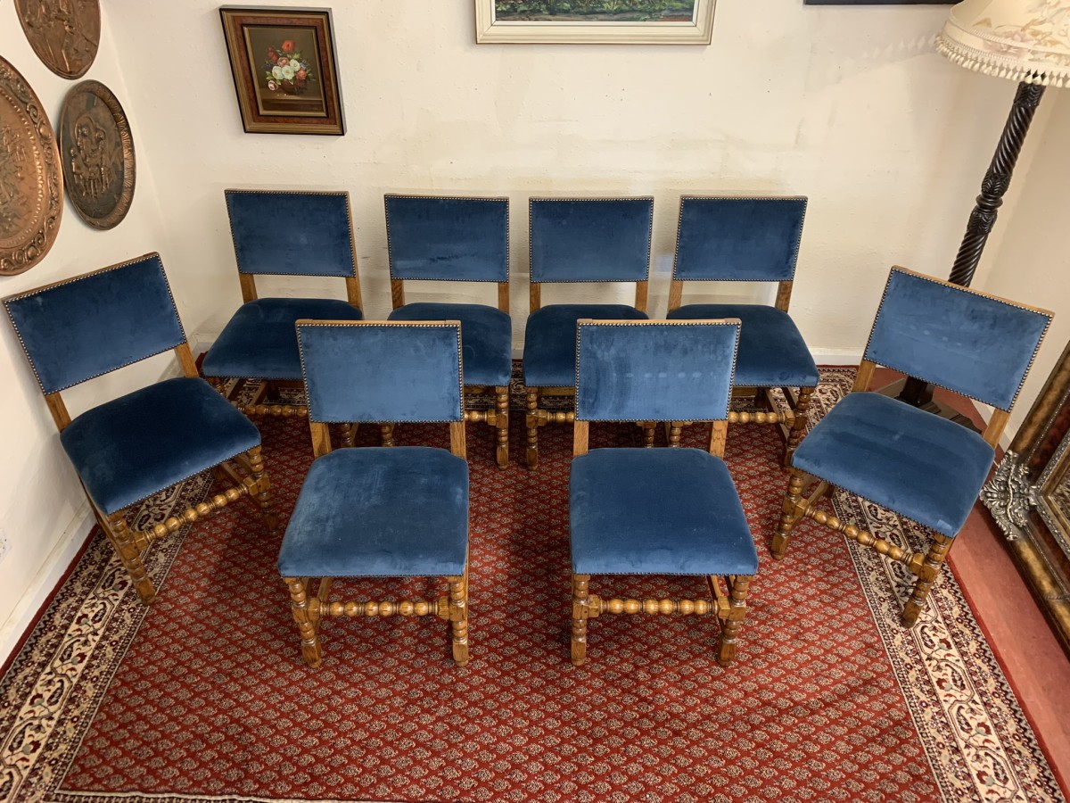 This fabulous set of ten dining chairs are made in glorious solid oak and are in excellent condition, they are sturdy chairs and extremely comfortable. The set of ten chairs consist of two carver arm chairs and eight single chairs. Each chair having back and seated blue cushioned upholstery with brass studded edging. Peg jointed throughout, bobbin front stretcher supports and legs the chairs stand on turned feet to the front. Please note also we are also listing is a matching country oak refectory table (as pictured)