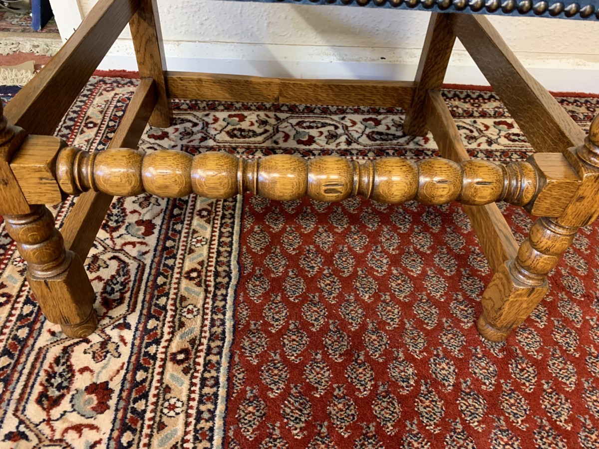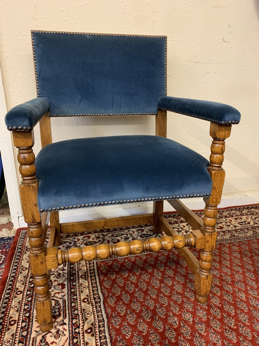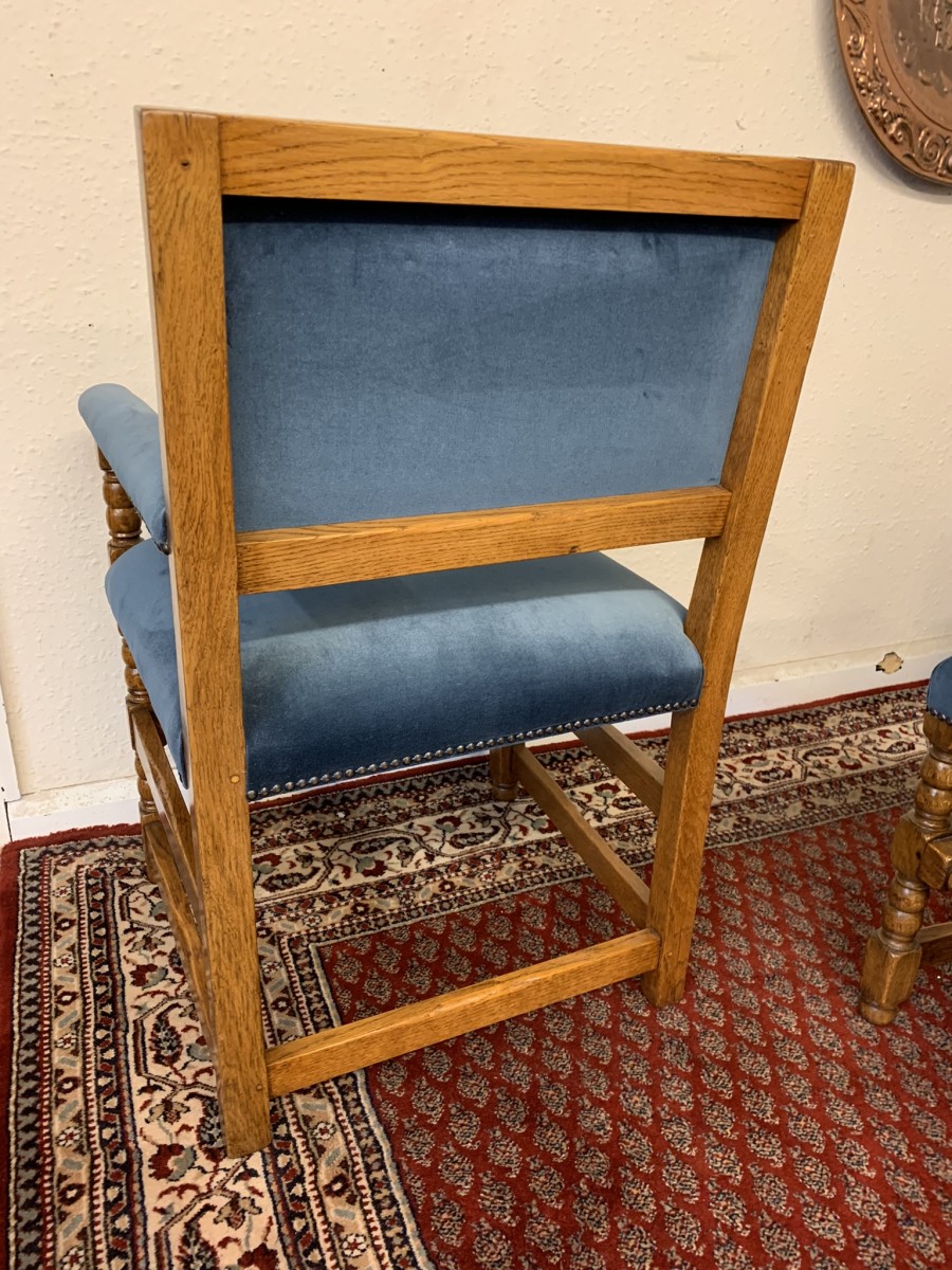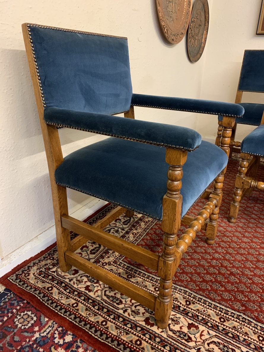 This fabulous set of ten dining chairs are made in glorious solid oak and are in excellent condition, they are sturdy chairs and extremely comfortable. The set of ten chairs consist of two carver arm chairs and eight single chairs. Each chair having back and seated blue cushioned upholstery with brass studded edging. Peg jointed throughout, bobbin front stretcher supports and legs the chairs stand on turned feet to the front. Please note also we are also listing is a matching country oak refectory table (as pictured)