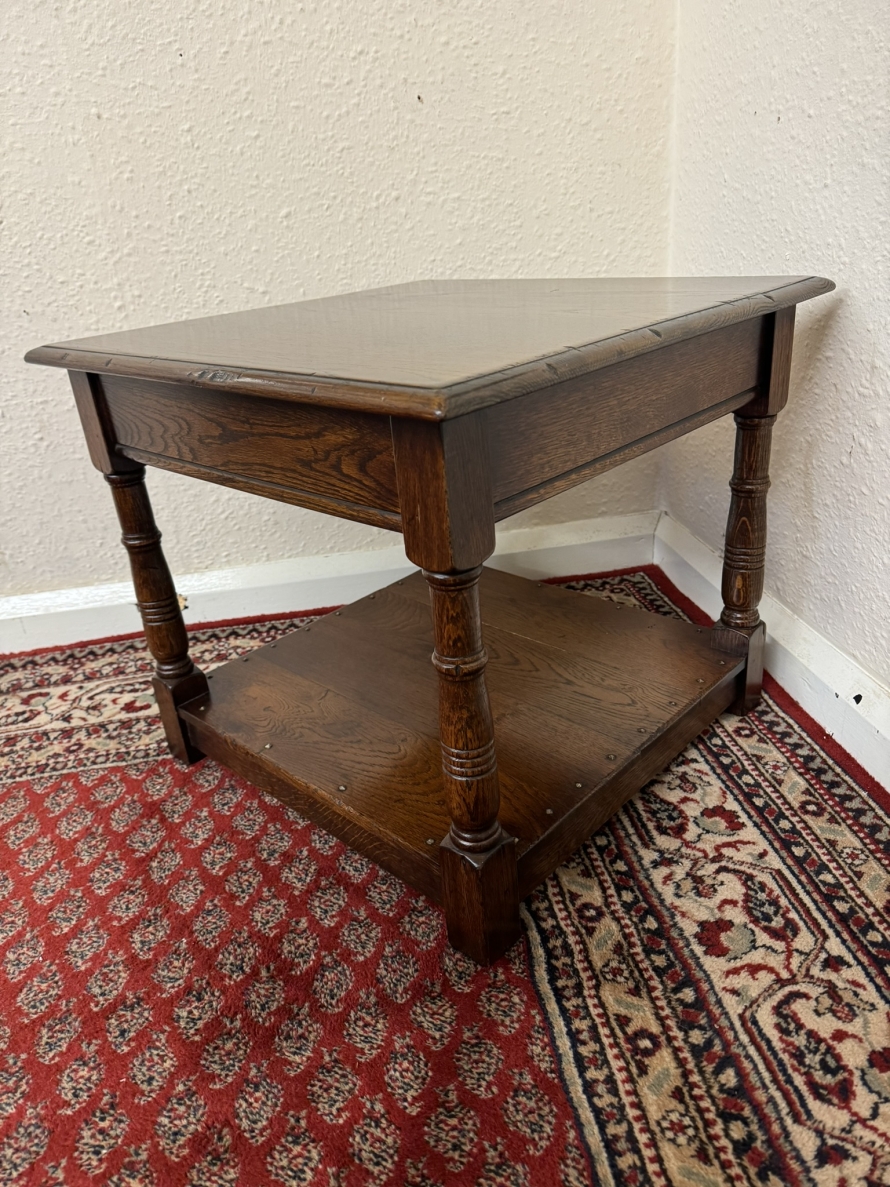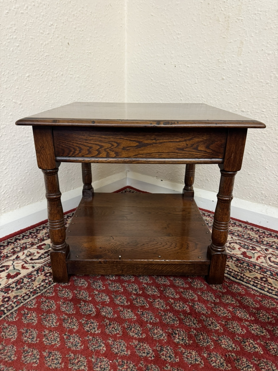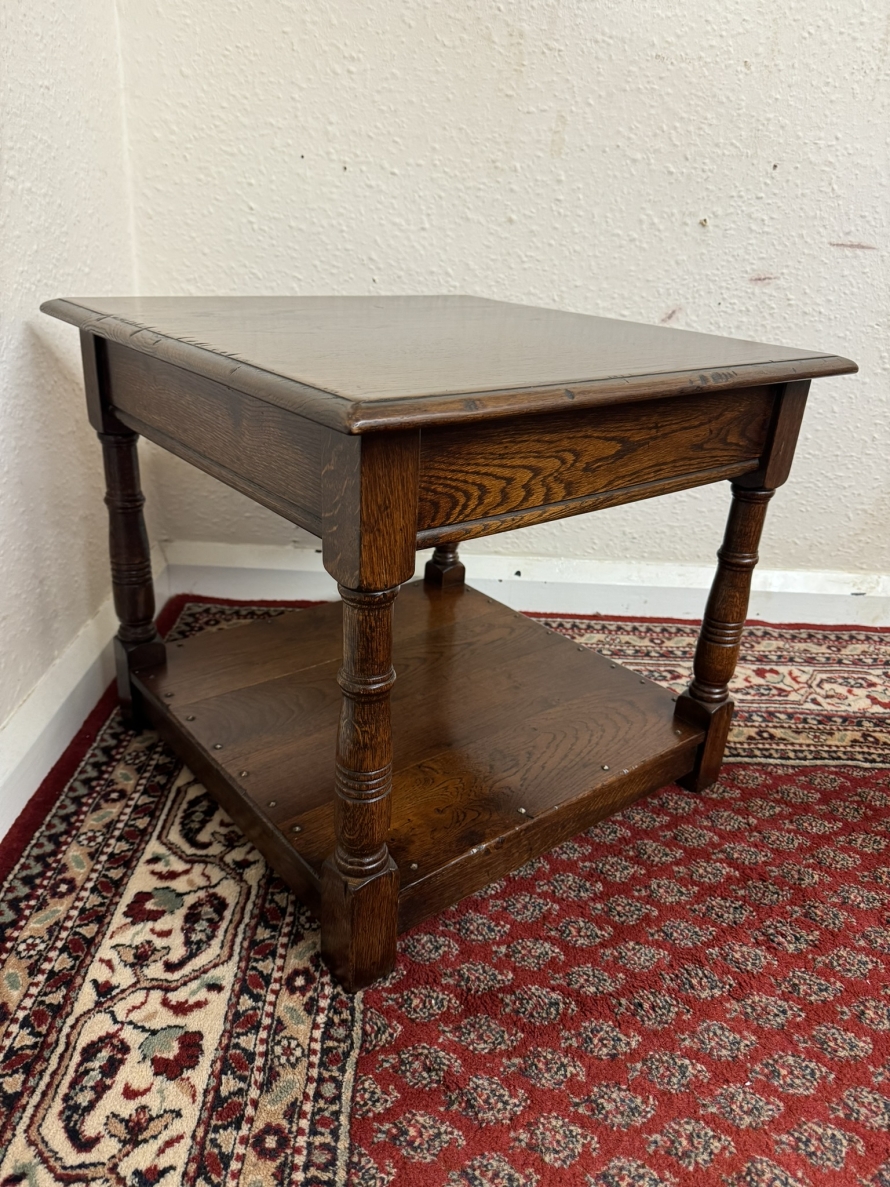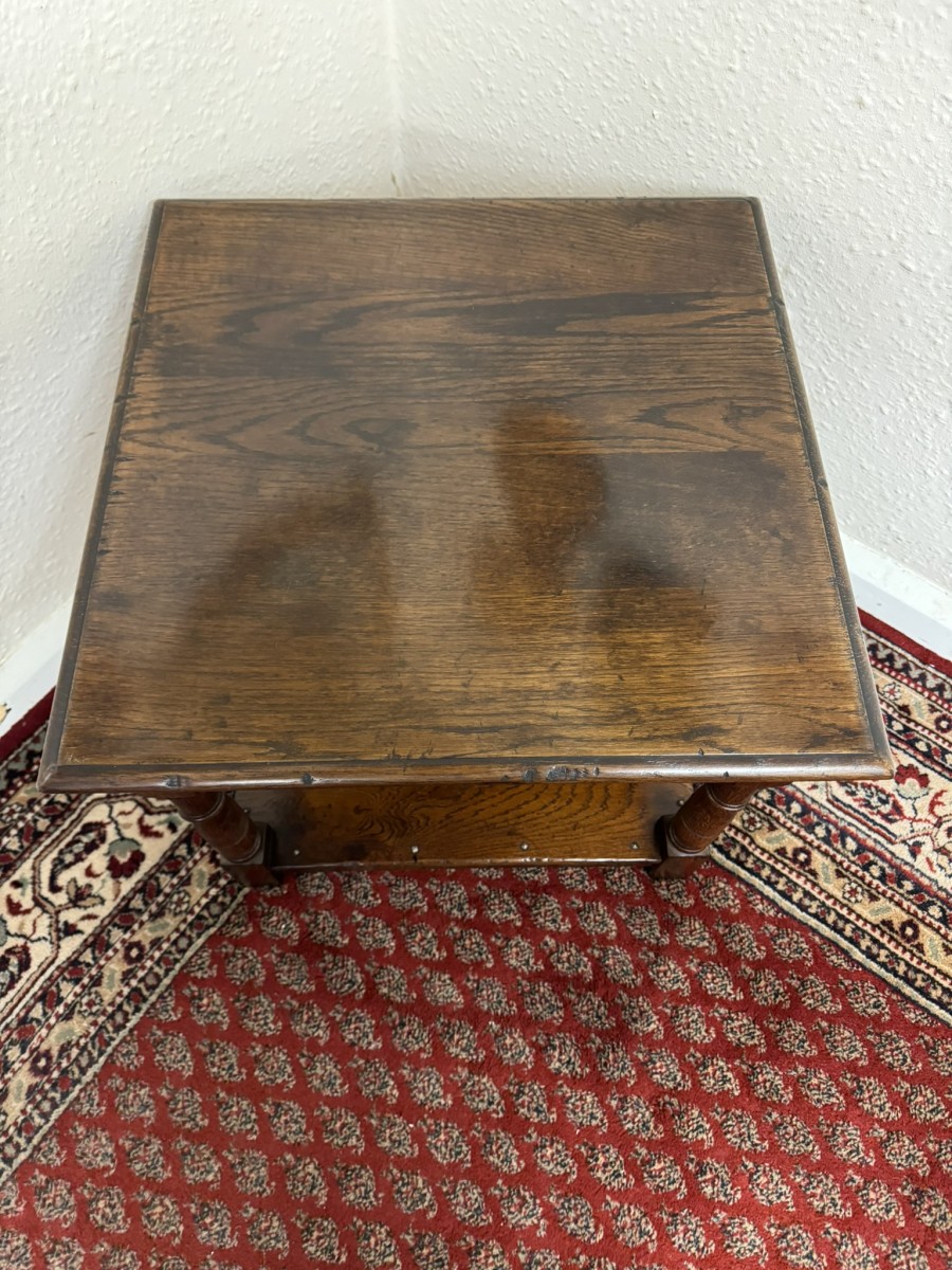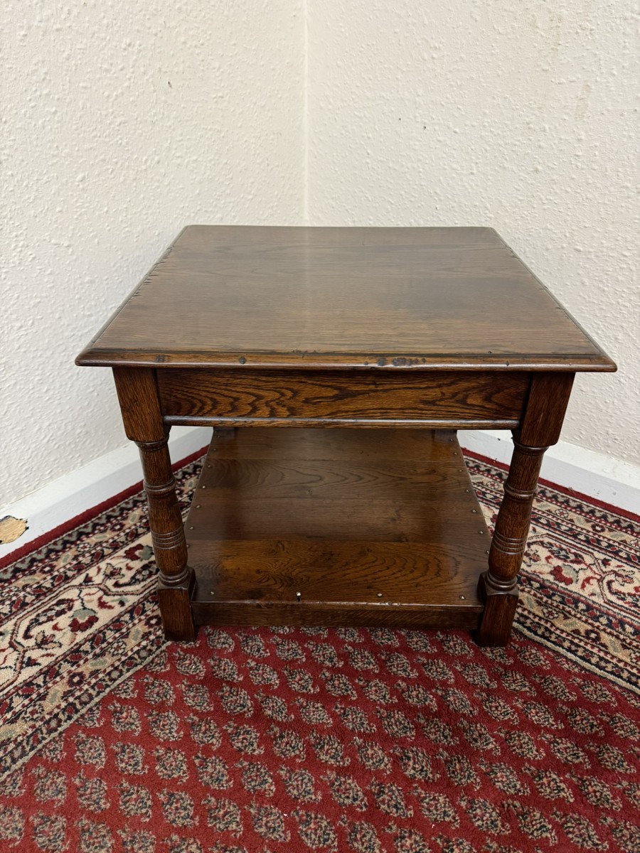 Made in glorious solid oak and in excellent condition the patina of the oak is striking. The square top sits on four turned legs with a boarded shelf and standing on traditional block feet.