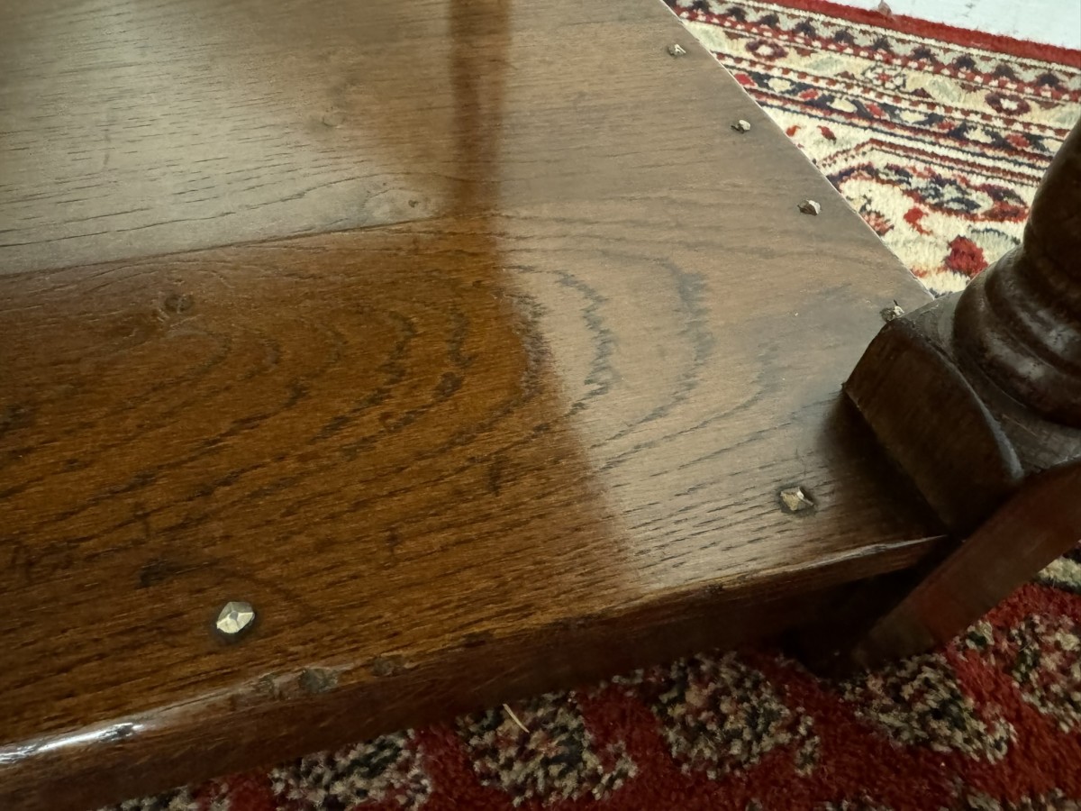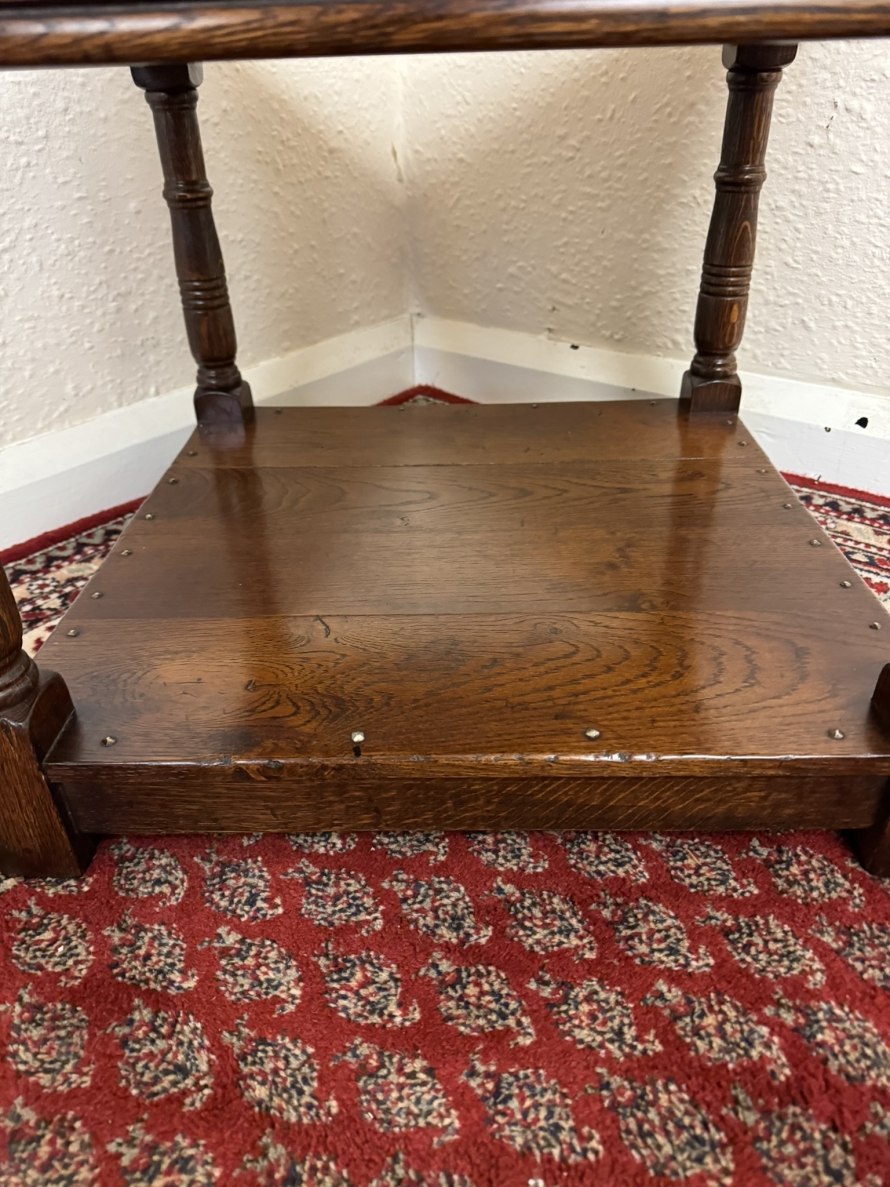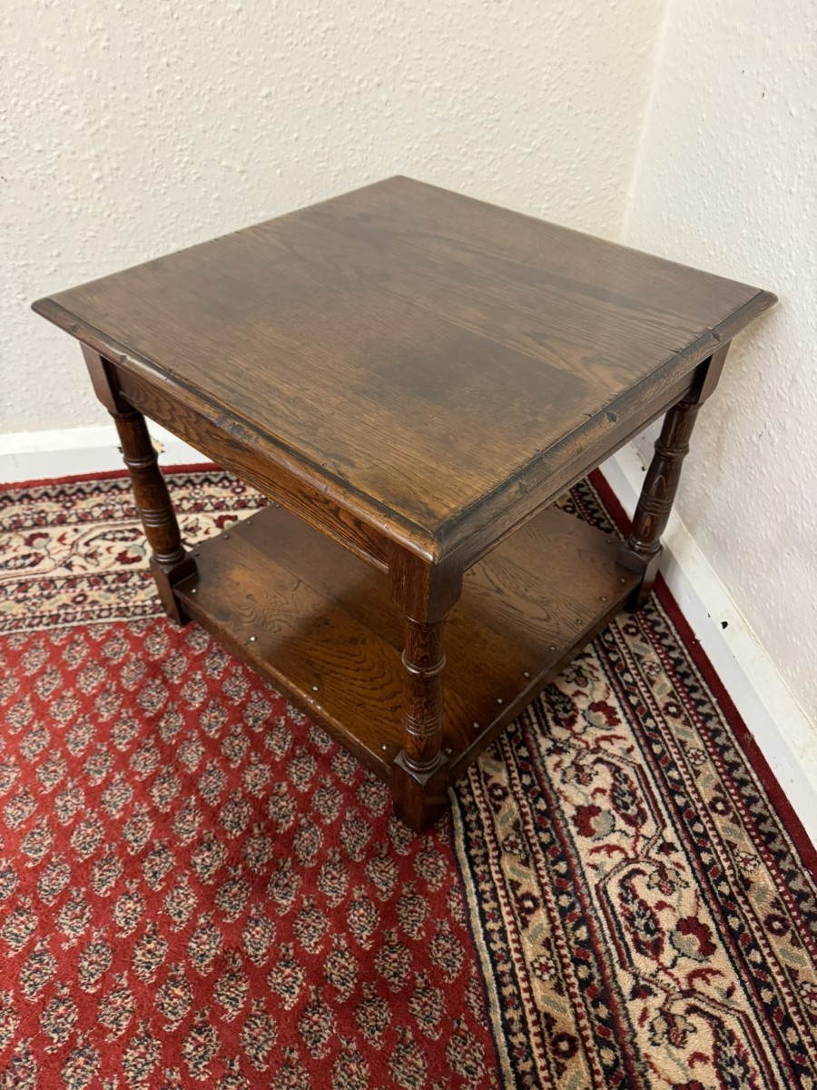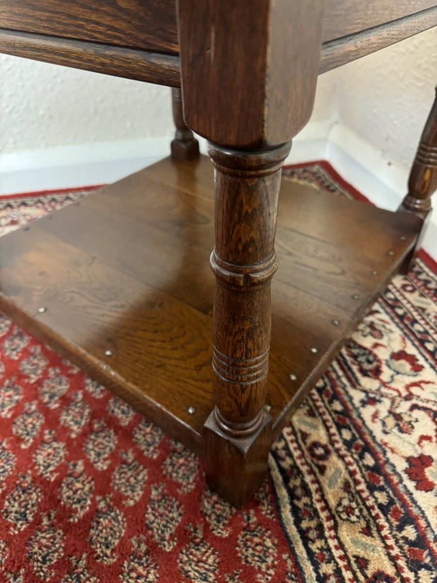 Made in glorious solid oak and in excellent condition the patina of the oak is striking. The square top sits on four turned legs with a boarded shelf and standing on traditional block feet.