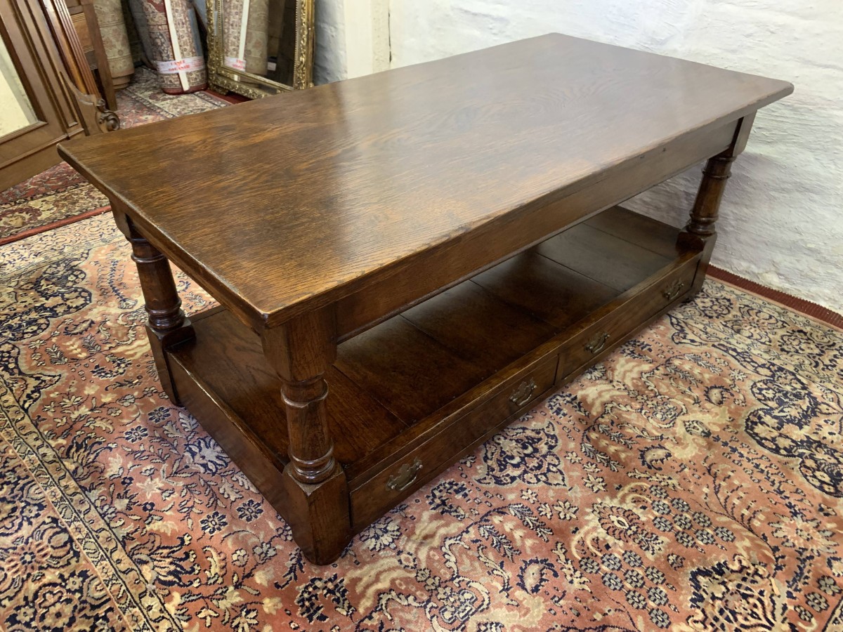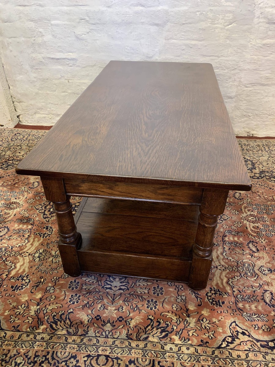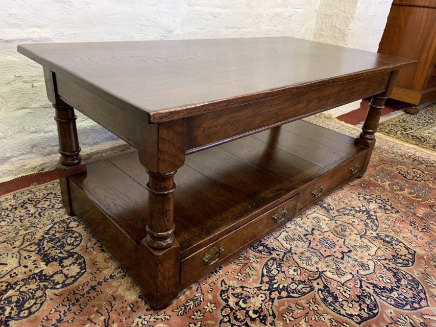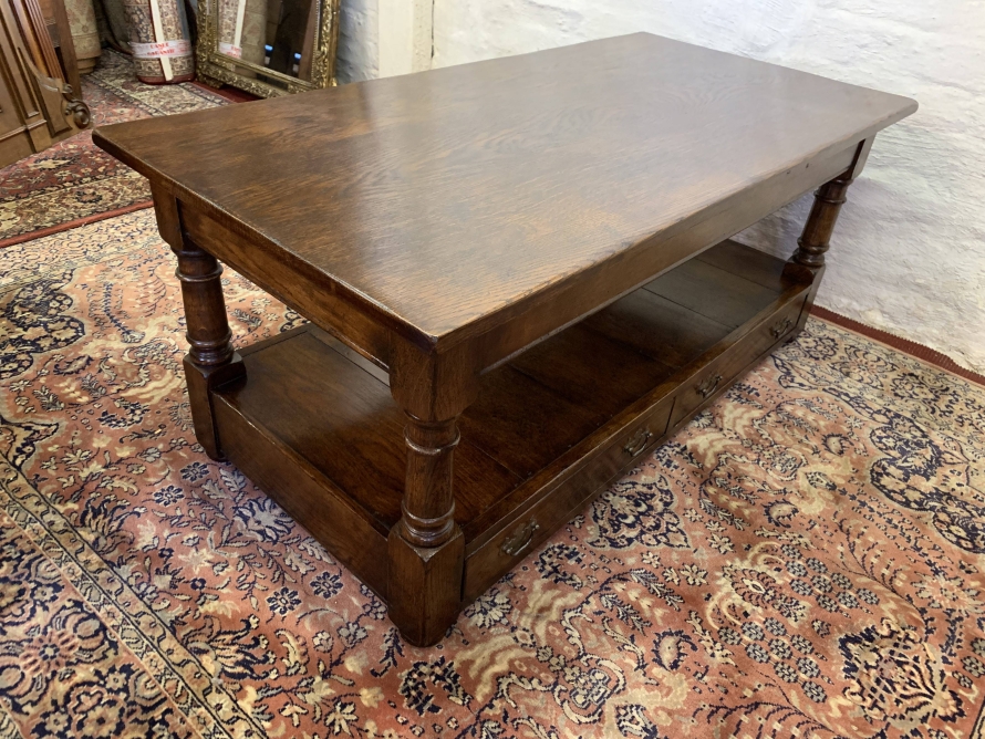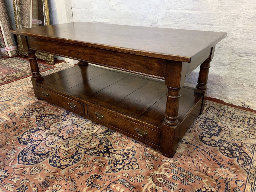 This coffee table is made entirely from glorious solid oak and is in excellent condition. The oversailing top sits above a panelled shelf, below are a pair of drawers which can be opened from either side. This fabulous oak coffee table sits on four turned column supports.