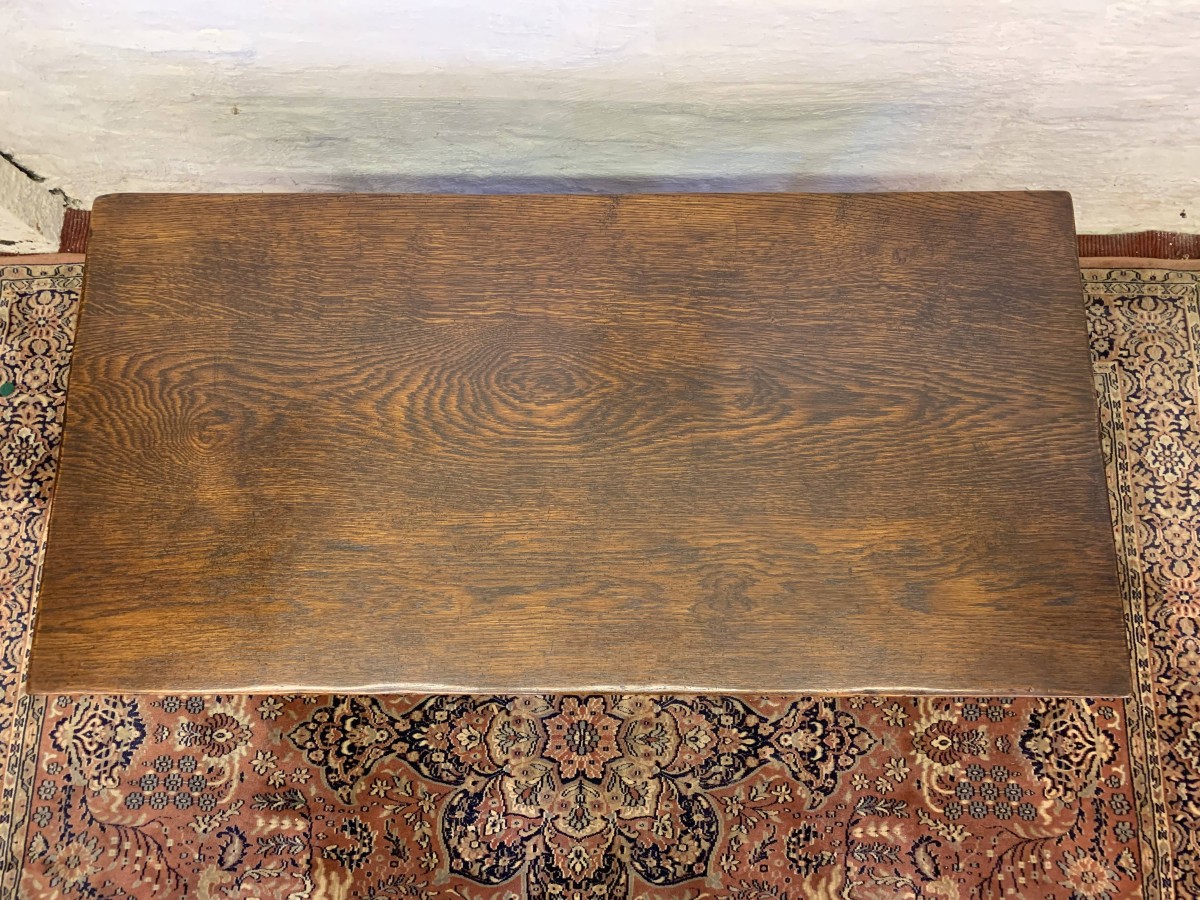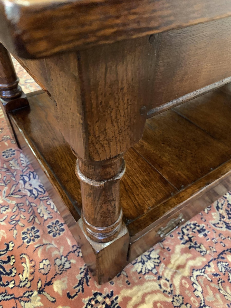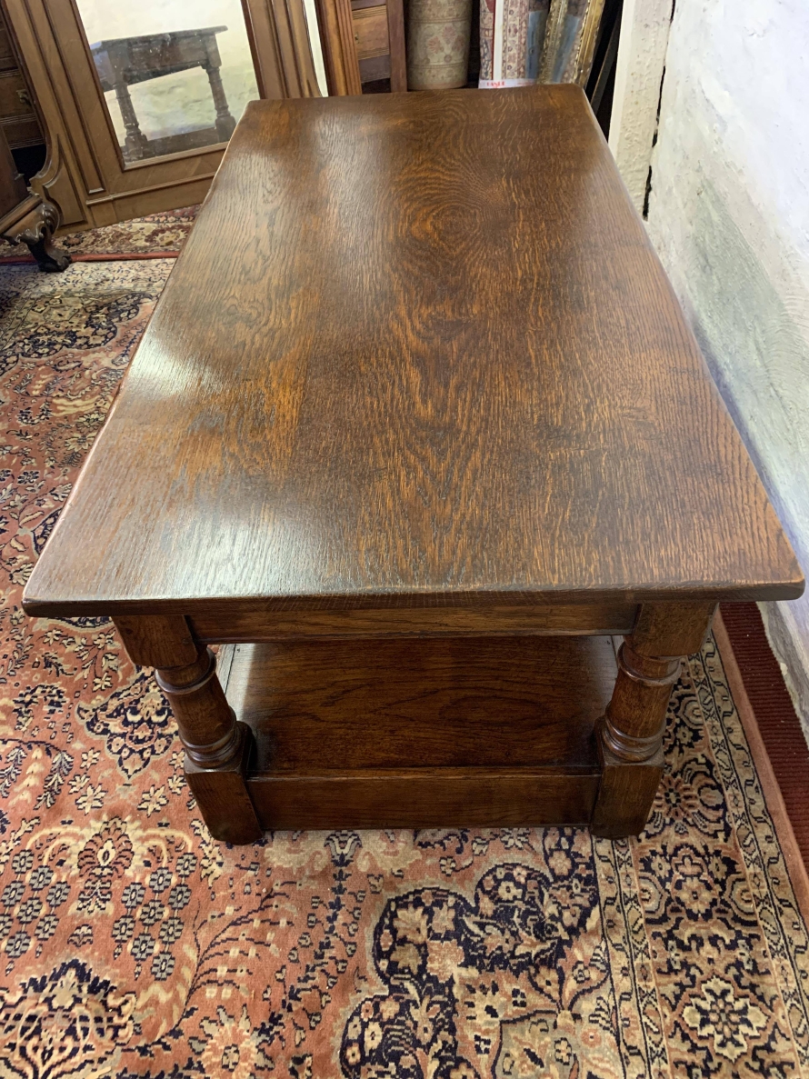 This coffee table is made entirely from glorious solid oak and is in excellent condition. The oversailing top sits above a panelled shelf, below are a pair of drawers which can be opened from either side. This fabulous oak coffee table sits on four turned column supports.