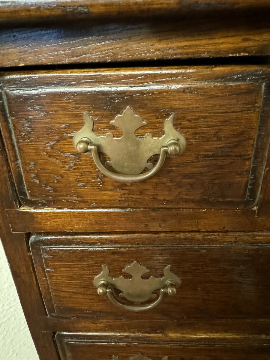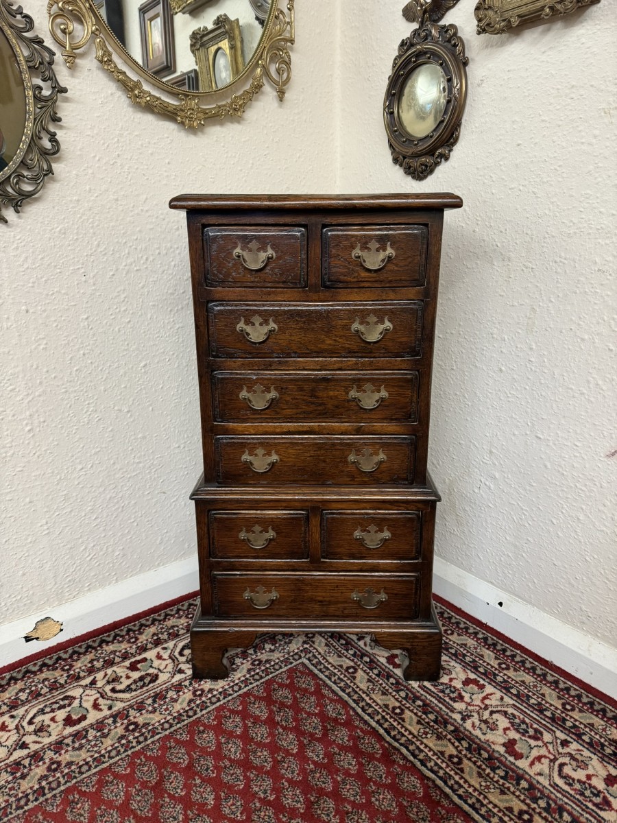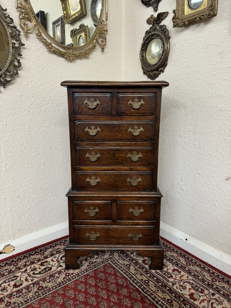 Made in glorious solid oak and in excellent condition. The oversailing top sits above two short drawers, each drawer with a brass drop handle. These two drawers sit above three long drawers, each drawer having a pair of drop handles. The base section having a pair of short drawers, each with brass drop handle which sit above a long drawer, this drawer having a pair of brass handles. The chest on chest sits on four bracket feet.
