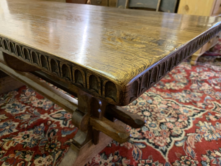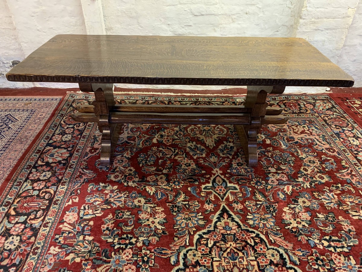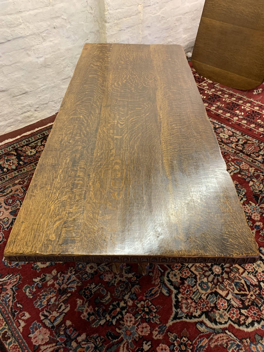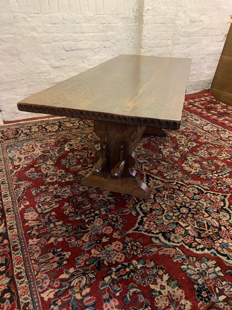 This fabulous table made by the renowned Nigel Rupert Griffiths furniture company is made entirely in solid oak and is in excellent condition. The thick oak top has a carved edge. Standing on carved shaped supports with chanfered stretcher supports.
