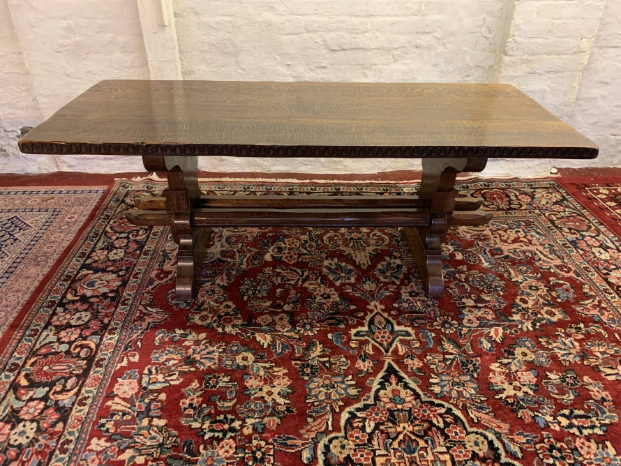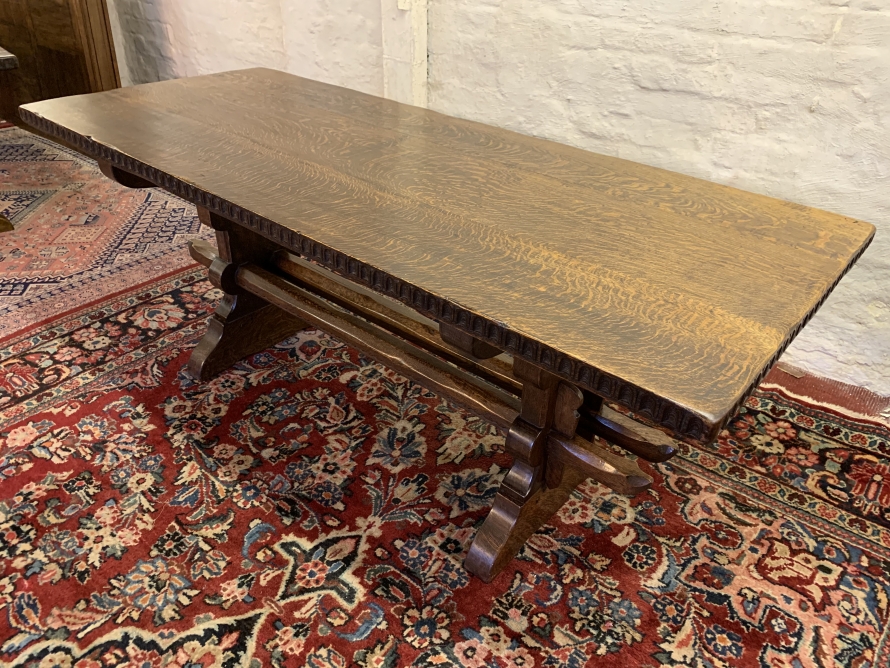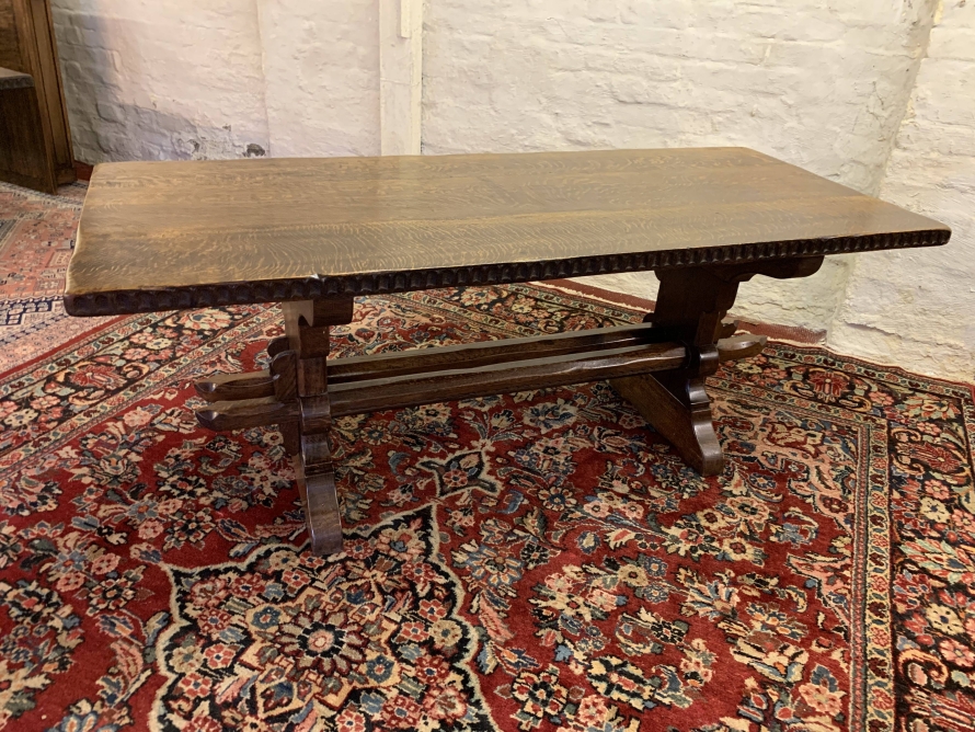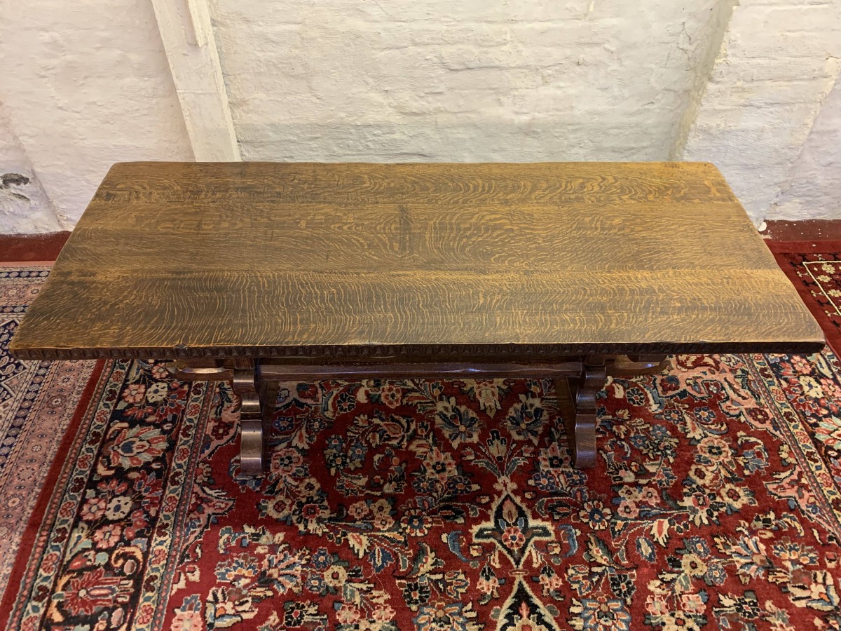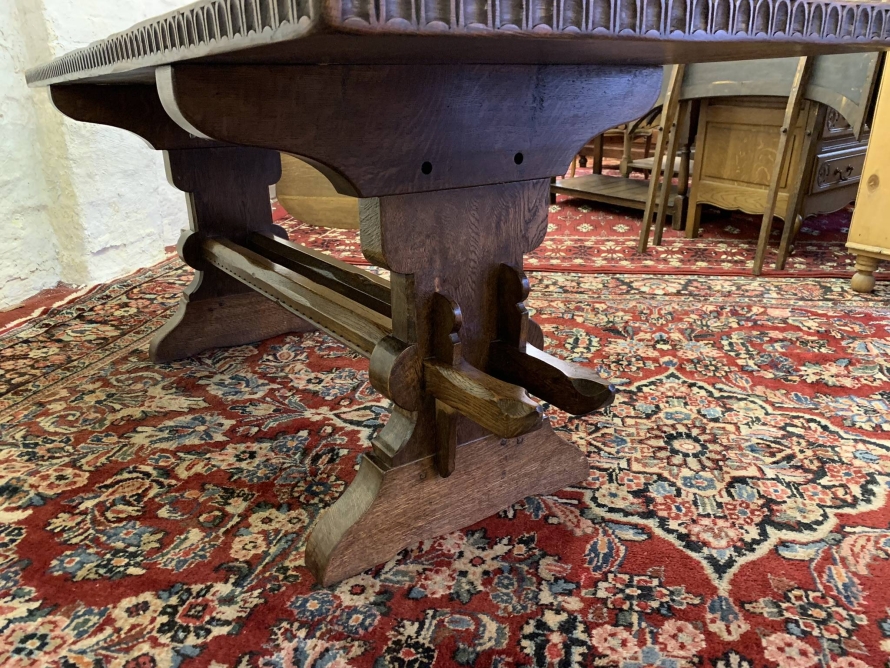 This fabulous table made by the renowned Nigel Rupert Griffiths furniture company is made entirely in solid oak and is in excellent condition. The thick oak top has a carved edge. Standing on carved shaped supports with chanfered stretcher supports.