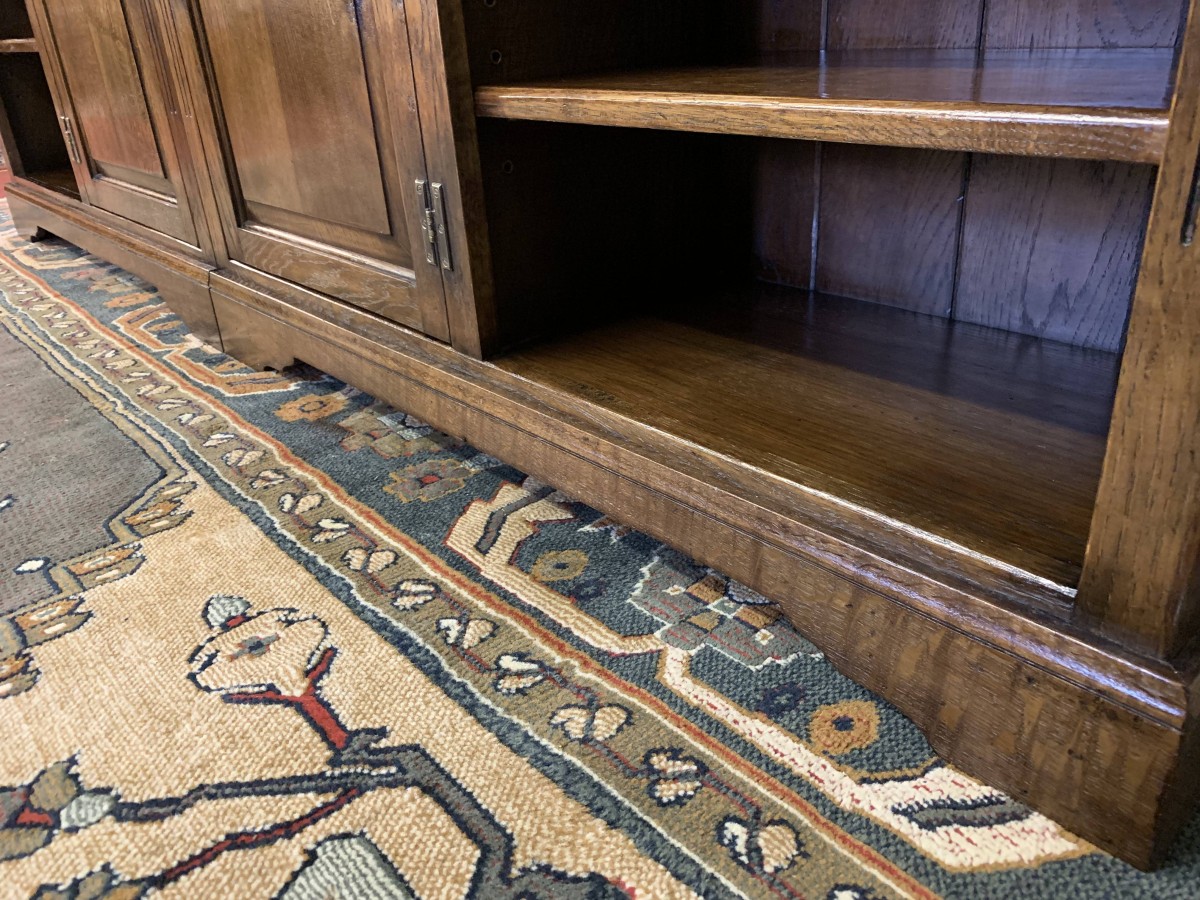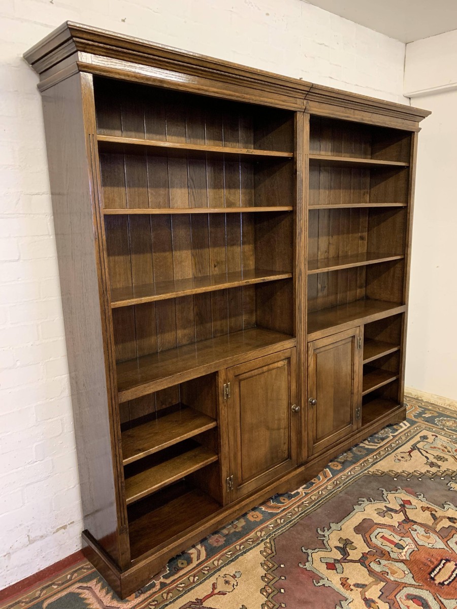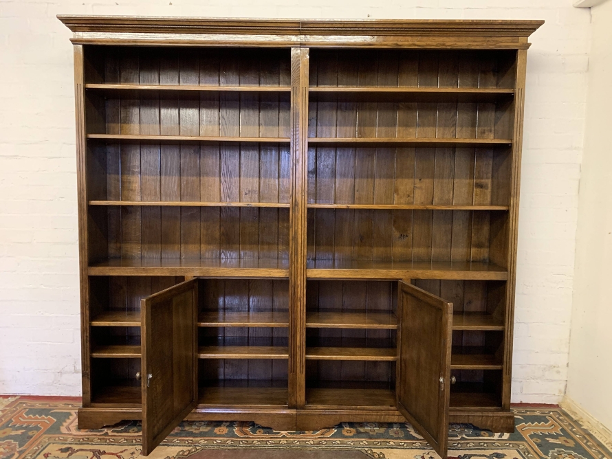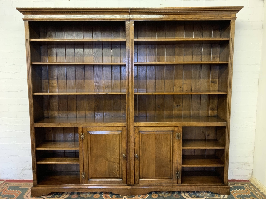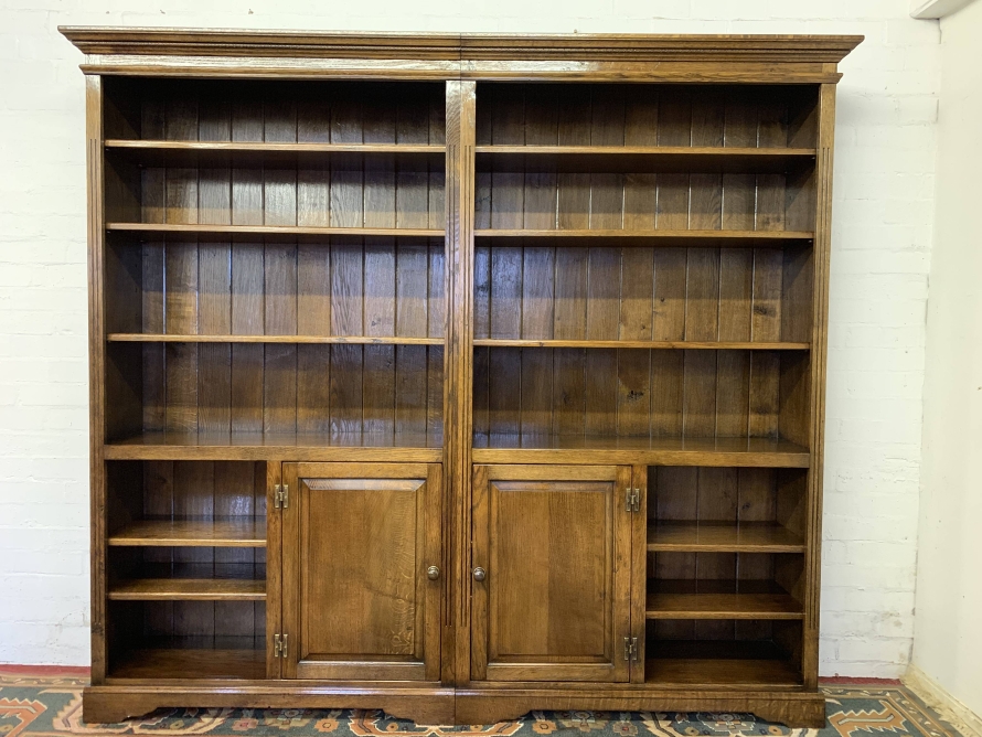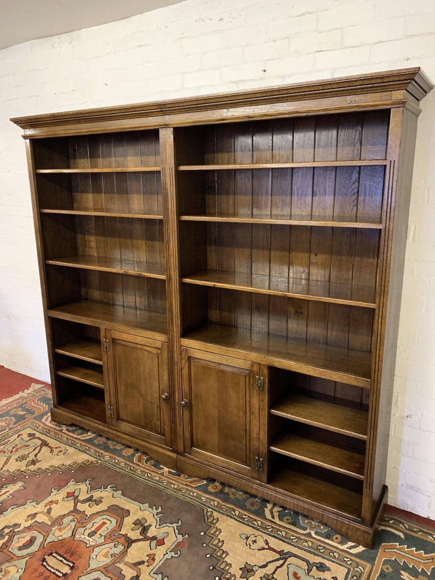 We are delighted to offer this two sectional bookcase which is made entirely of solid oak, the two sections attach together to provide an impressive/extensive bookcase. The over sailing top sits above three removable and adjustable shelves. Below is a cupboard door, having a pair of H hinges and brass turned knob handle. The door opens to reveal a pair of adjustable and removable shelves. To the sides of the cupboard doors are a pair of adjustable and removable shelves outstanding quality bookcase made entirely of solid oak.