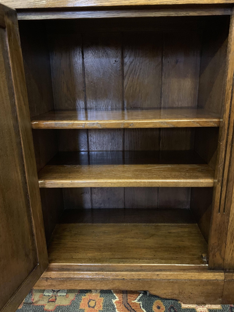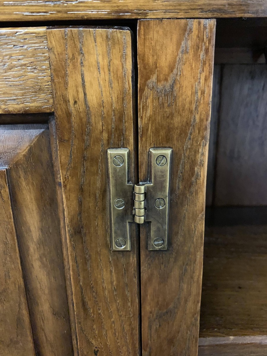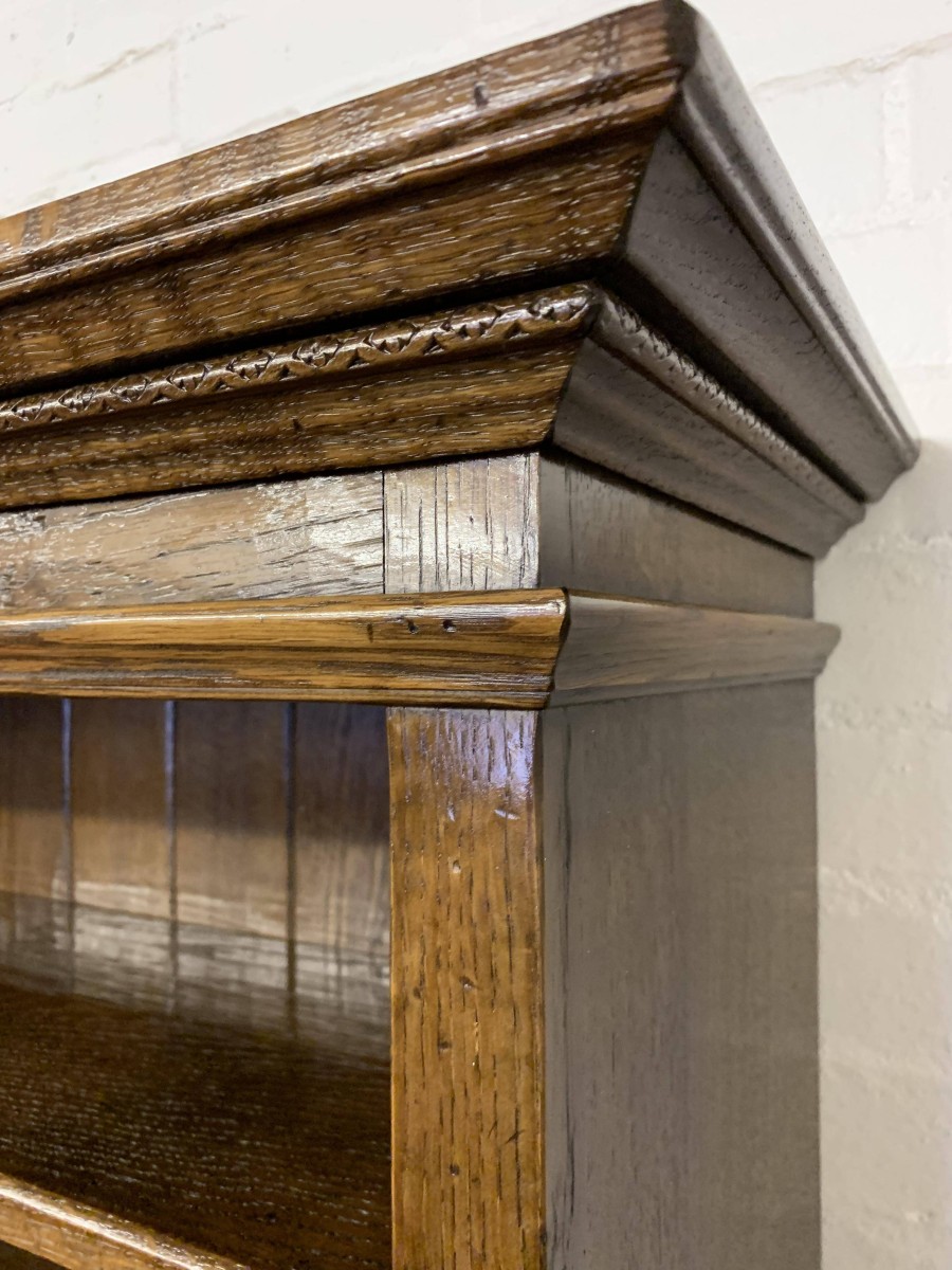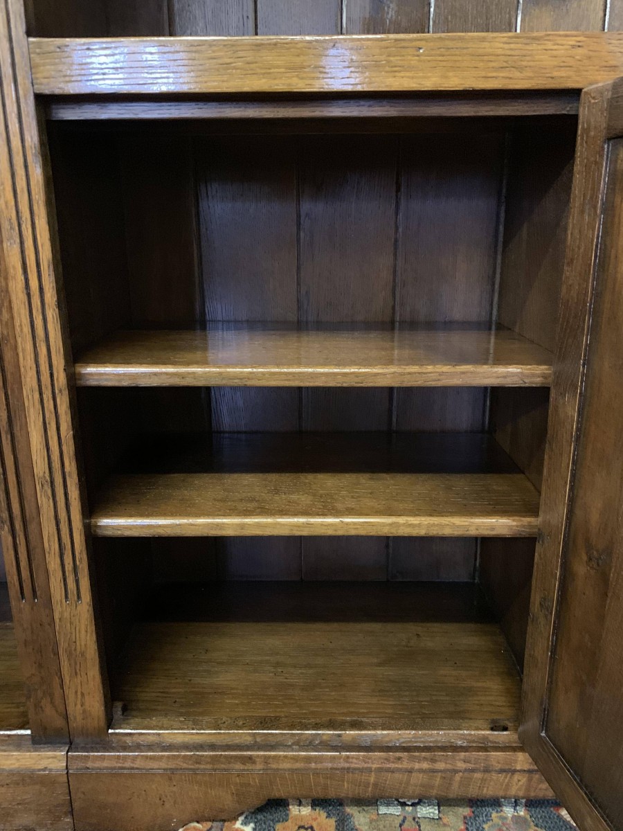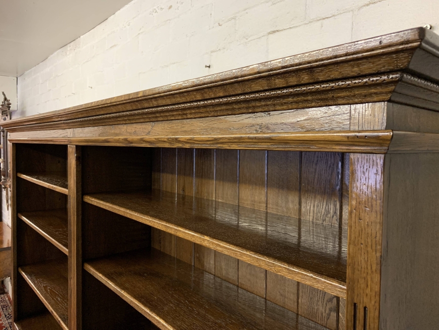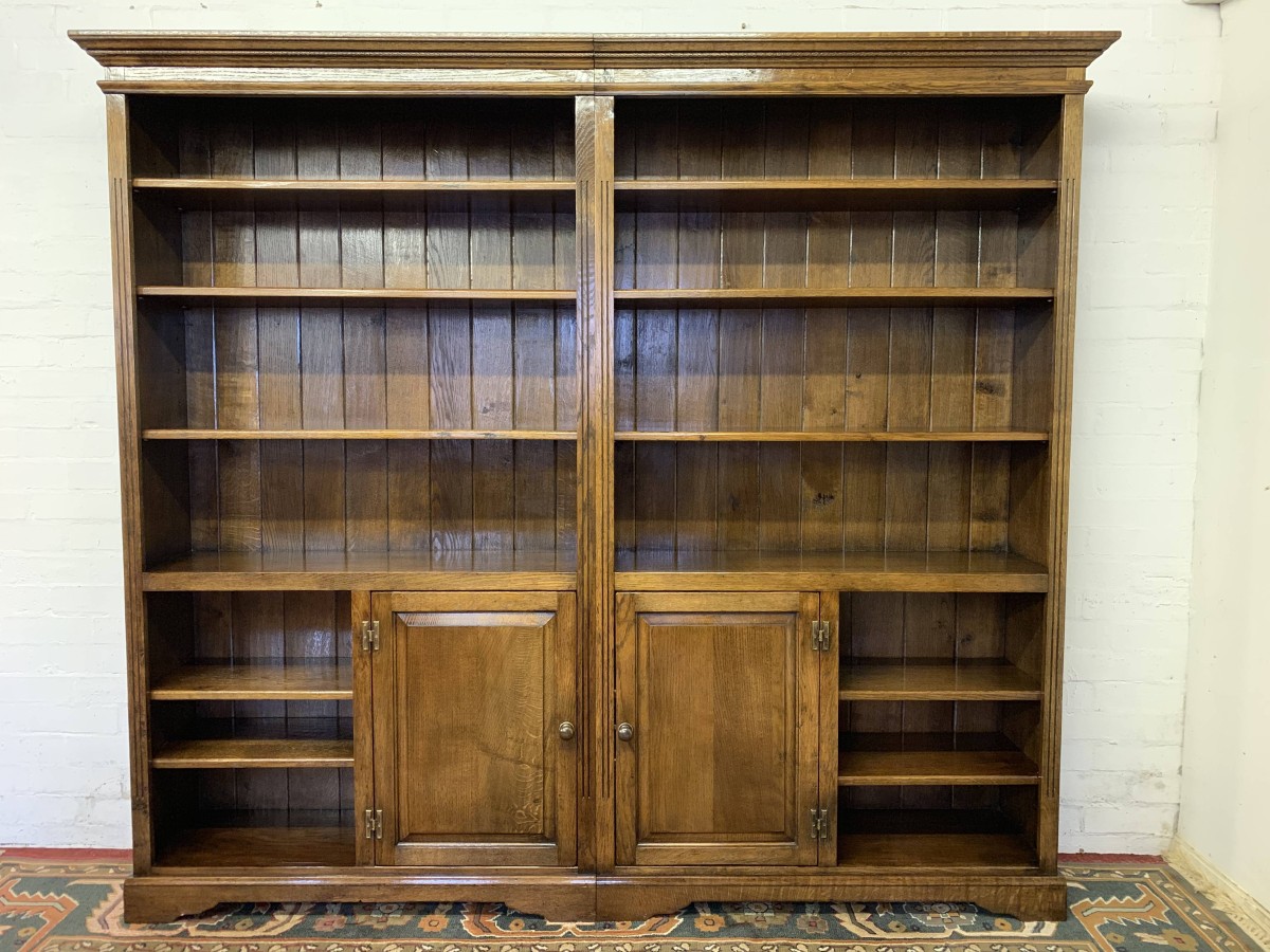 We are delighted to offer this two sectional bookcase which is made entirely of solid oak, the two sections attach together to provide an impressive/extensive bookcase. The over sailing top sits above three removable and adjustable shelves. Below is a cupboard door, having a pair of H hinges and brass turned knob handle. The door opens to reveal a pair of adjustable and removable shelves. To the sides of the cupboard doors are a pair of adjustable and removable shelves outstanding quality bookcase made entirely of solid oak.