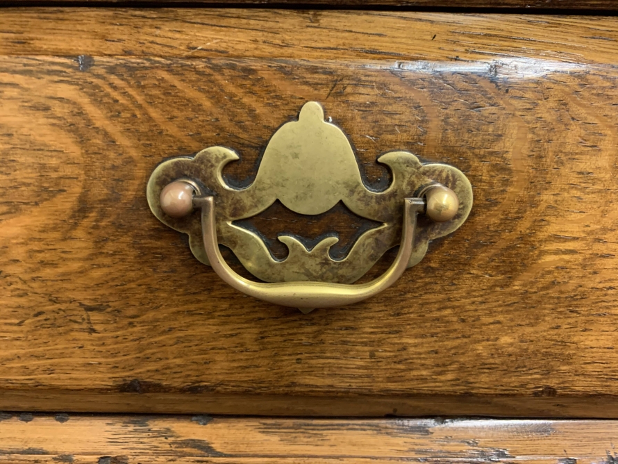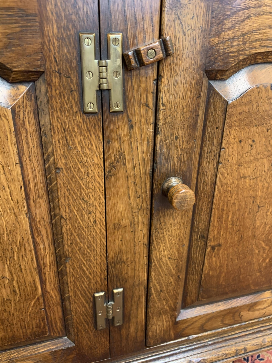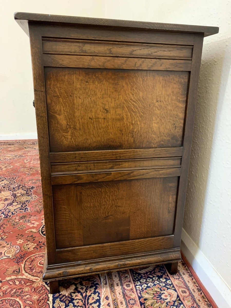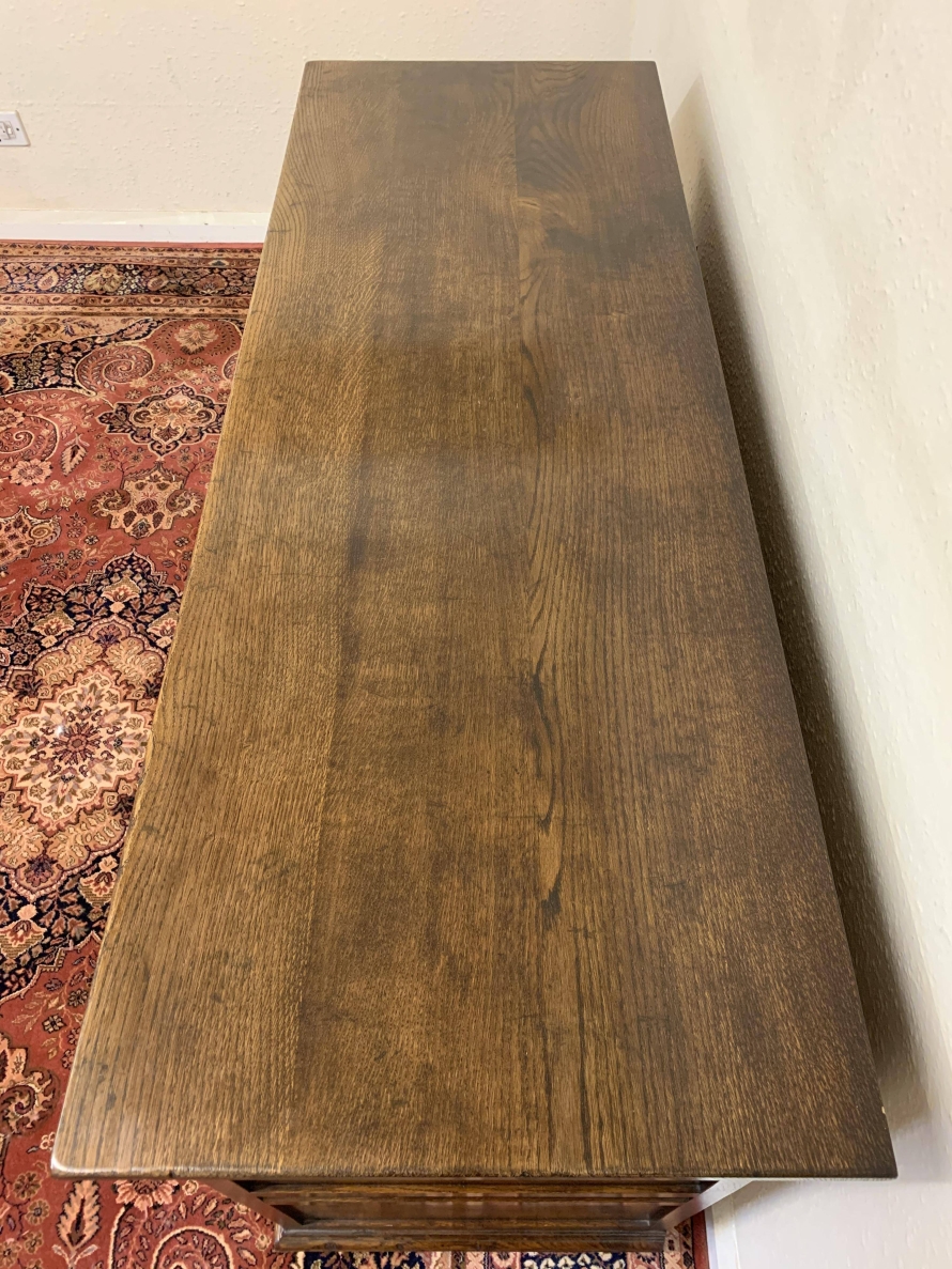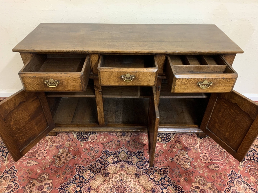 A superb oak dresser which is in excellent condition. The oversailing top sits above three drawers, below are three fielded panelled doors each with wooden knob handle and wooden locking latch. Recessed panelled sides, this gorgeous dresser stands on traditional block feet. Please note that the platina is striking.