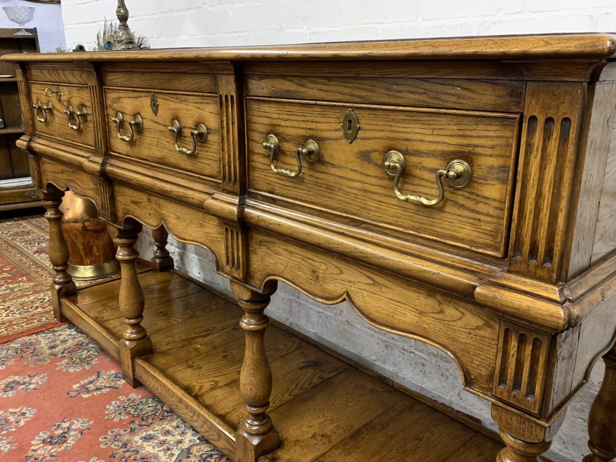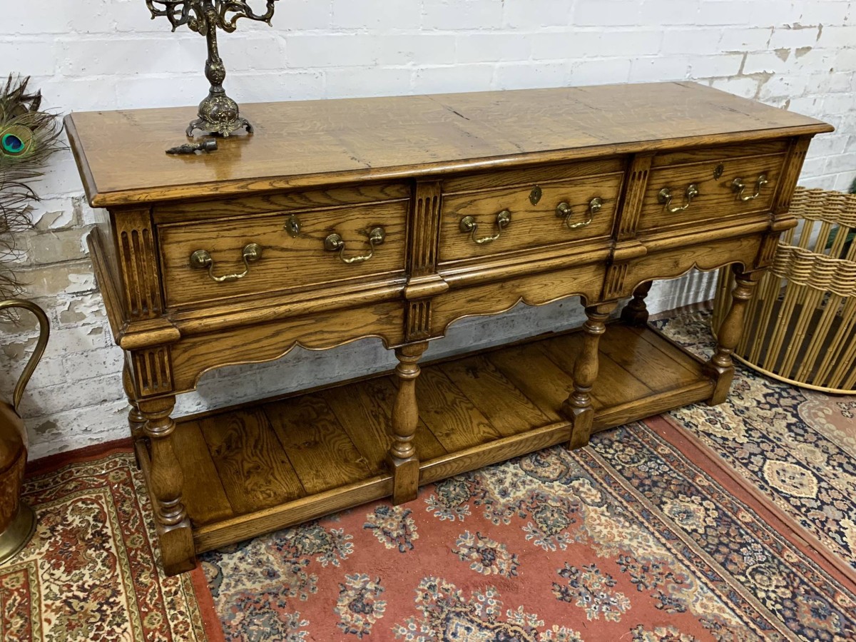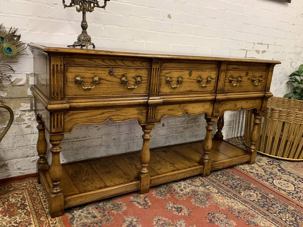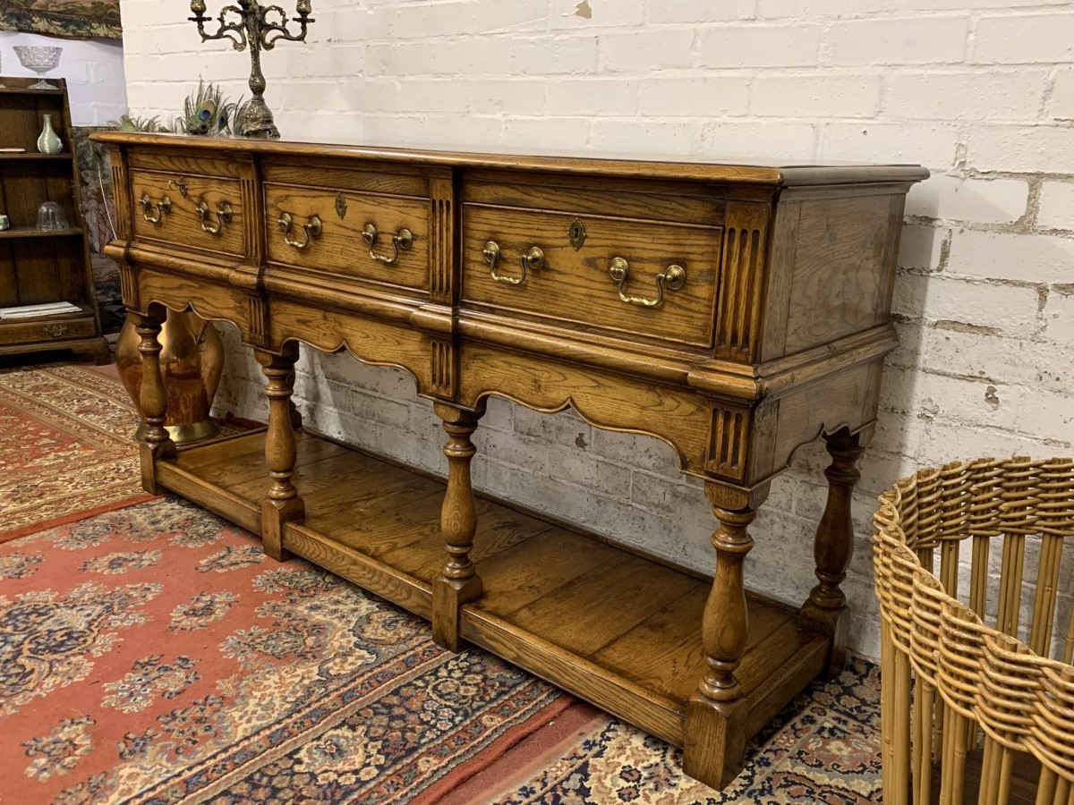 Made in glorious solid oak this stunning dresser is in excellent condition. The oversailing top sits above three lockable drawers, each drawer having a pair of drop brass handles. With a wavy apron below, pot board panelled base this fabulous oak dresser stands on six turned legs on traditional block feet.