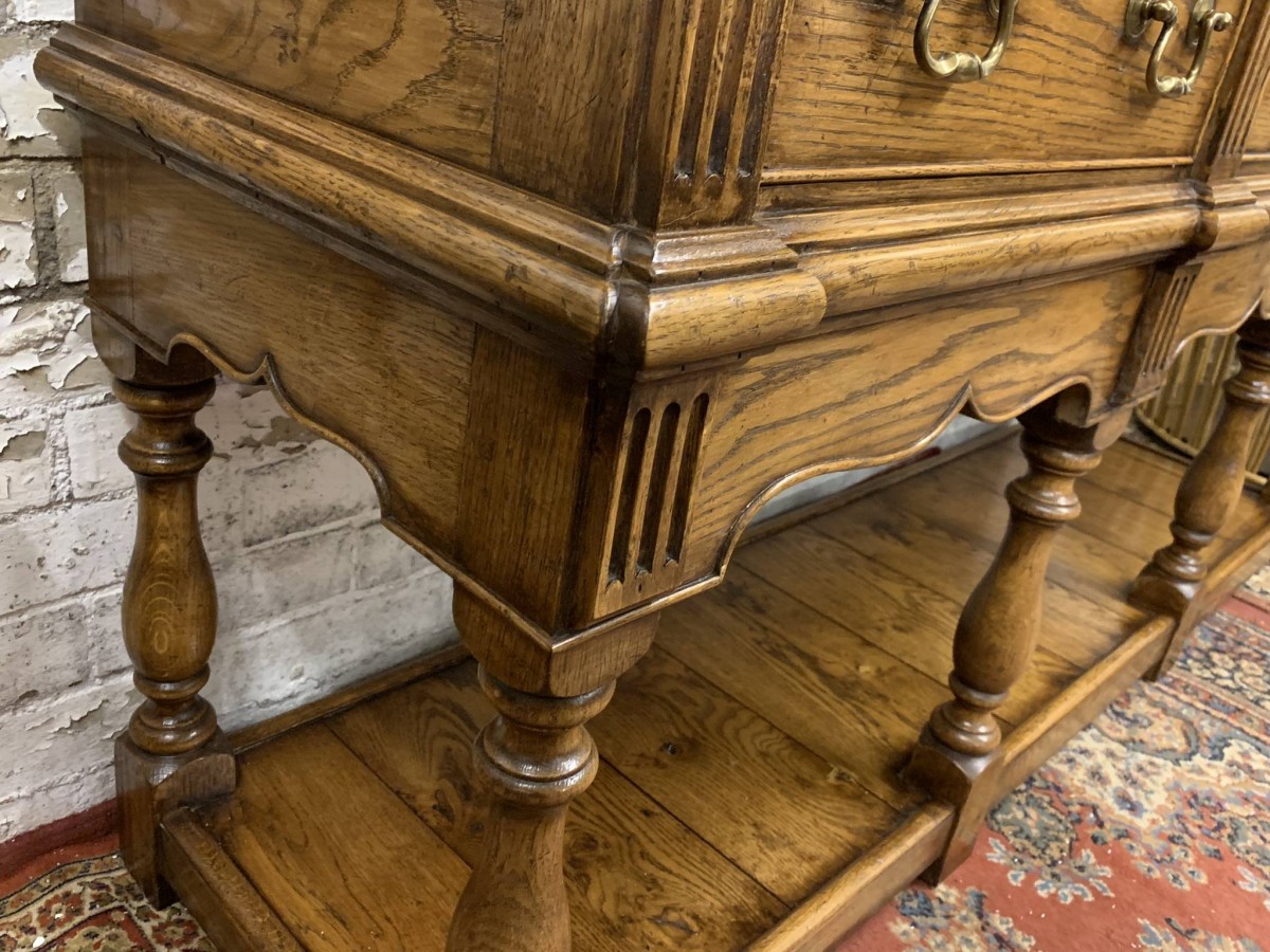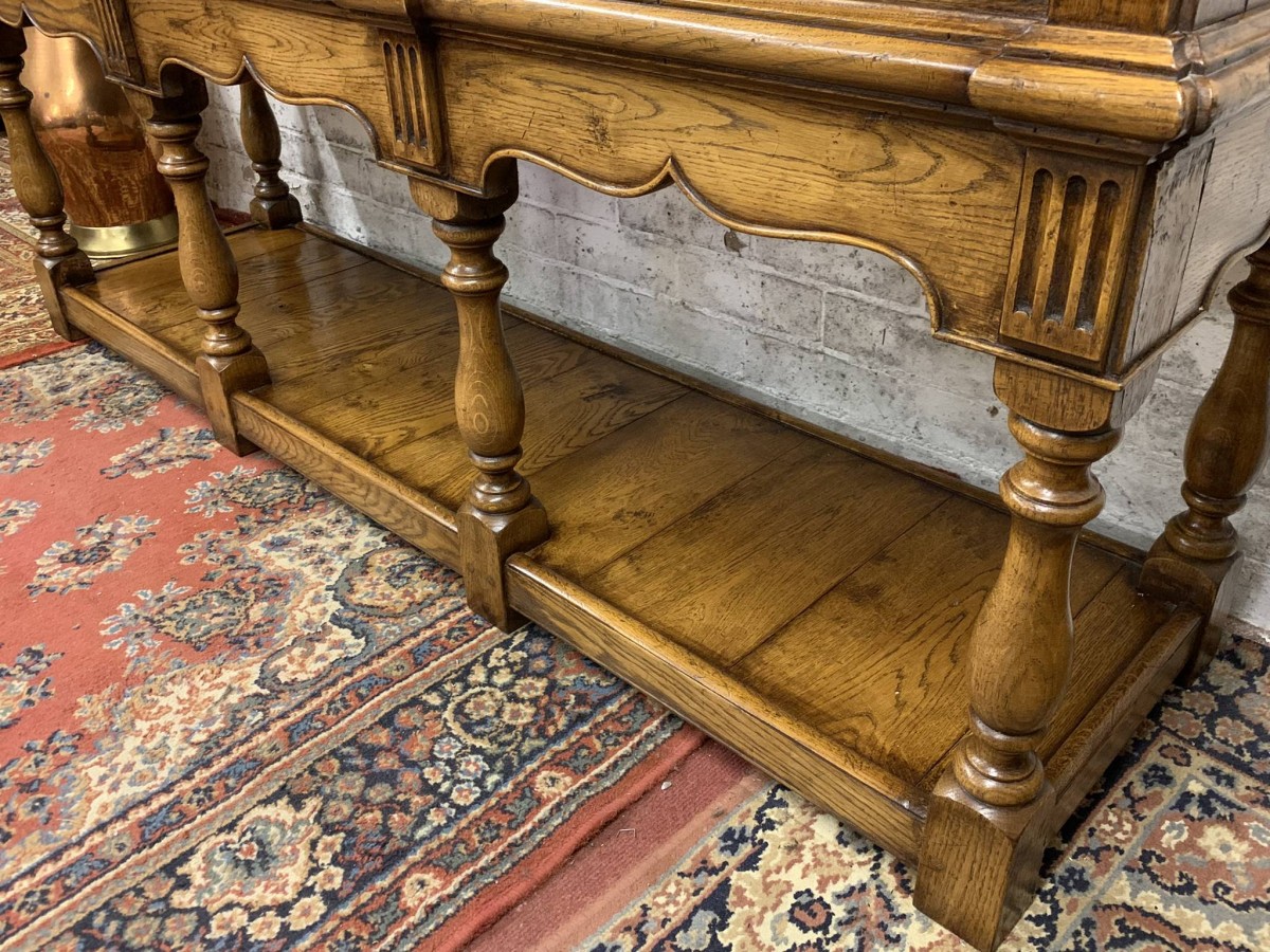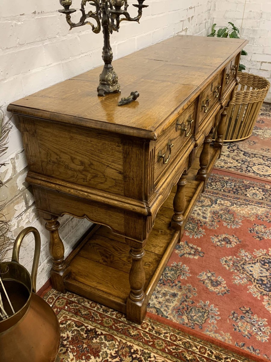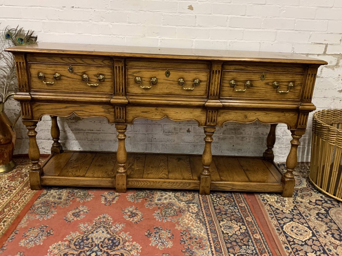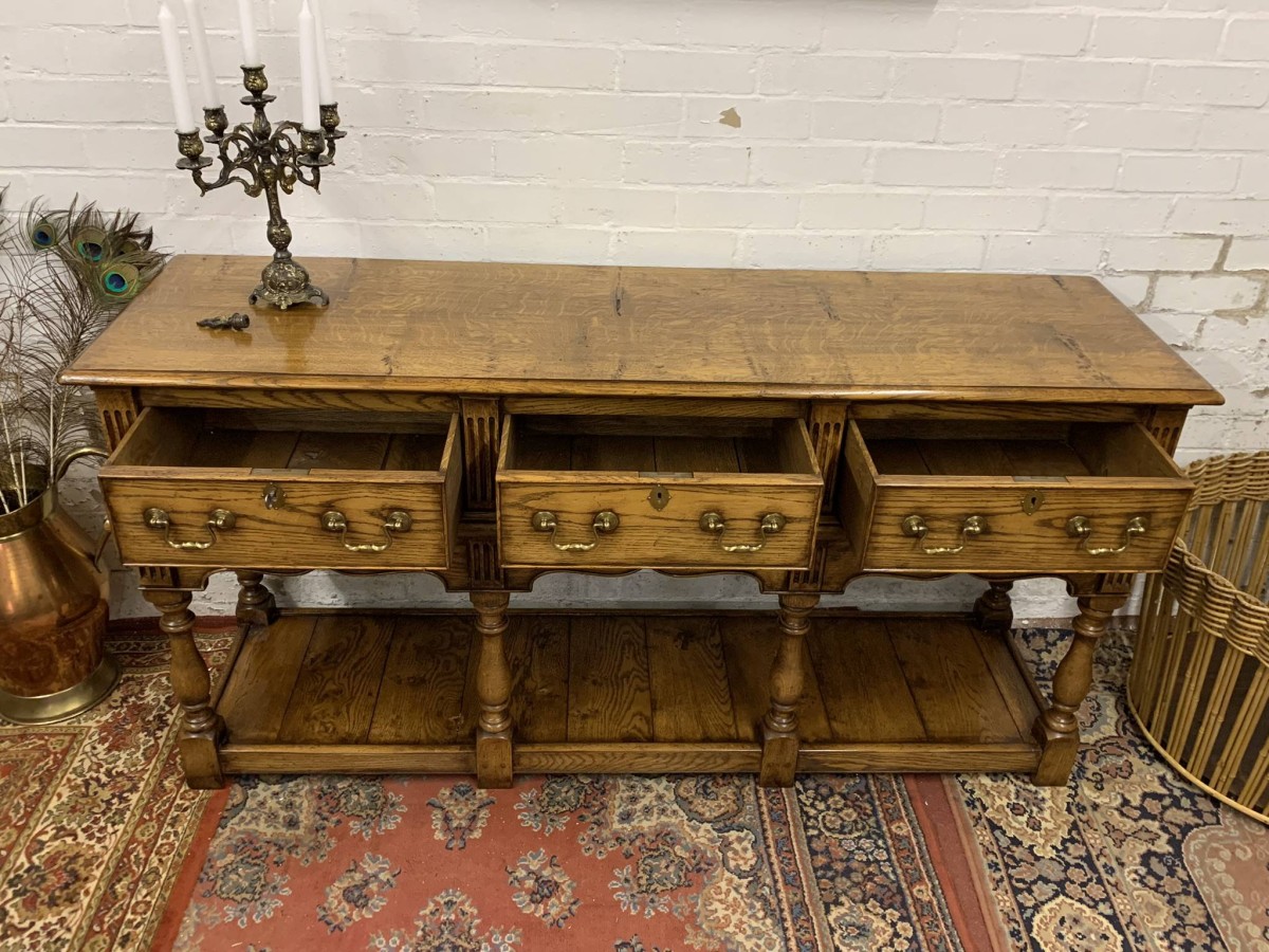 Made in glorious solid oak this stunning dresser is in excellent condition. The oversailing top sits above three lockable drawers, each drawer having a pair of drop brass handles. With a wavy apron below, pot board panelled base this fabulous oak dresser stands on six turned legs on traditional block feet.