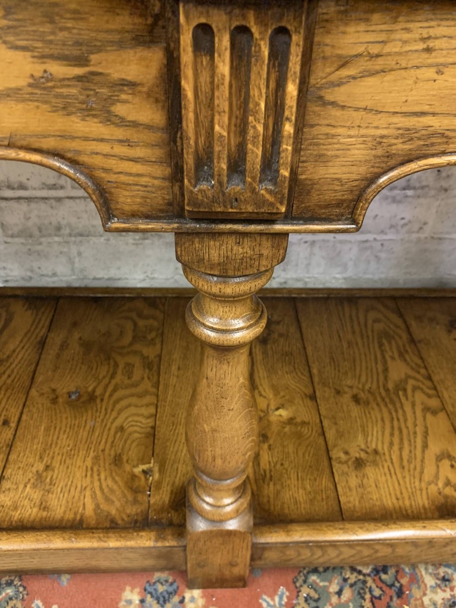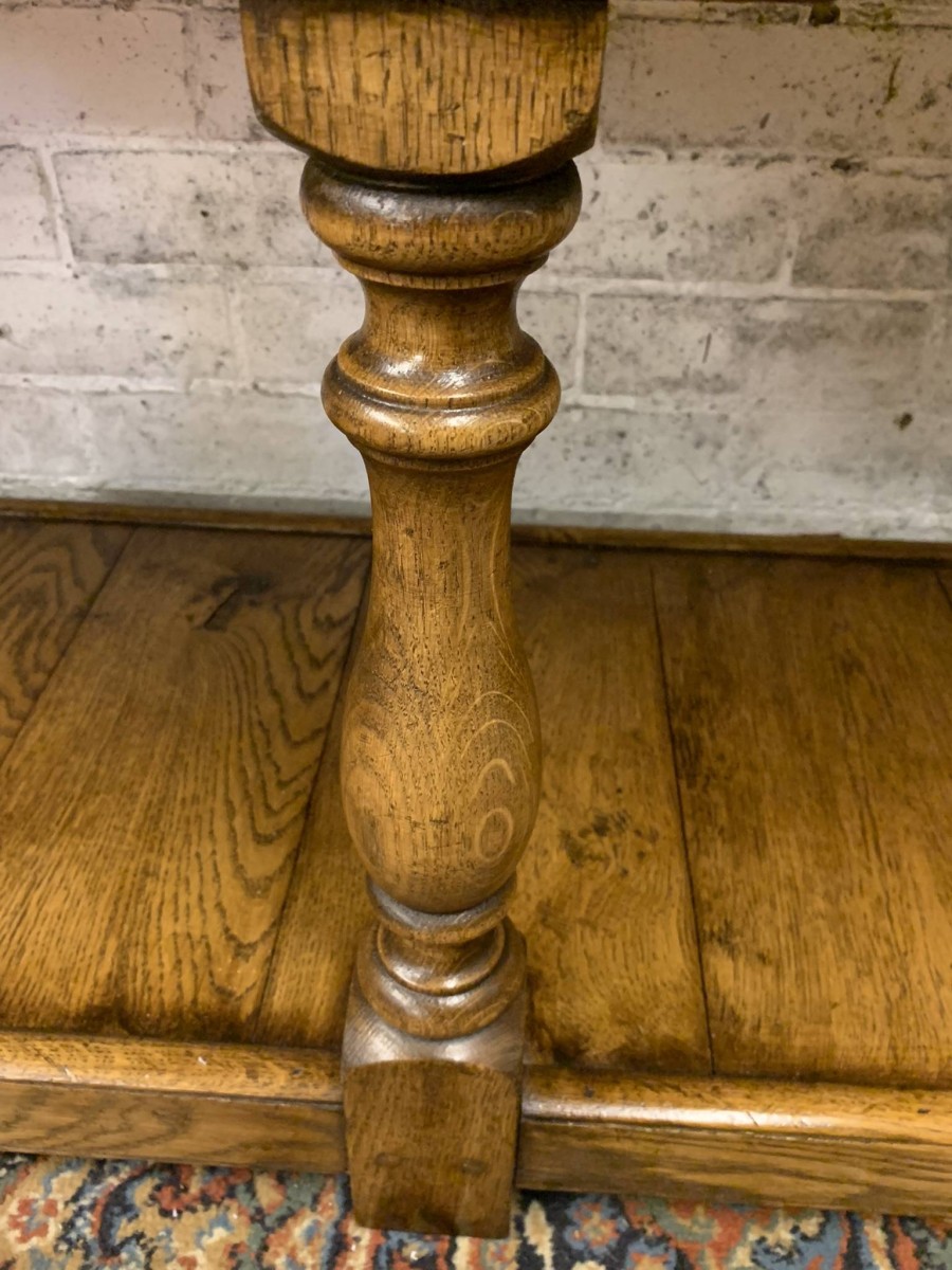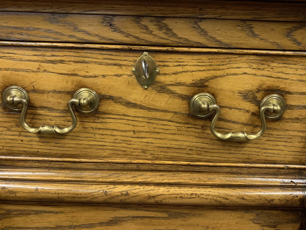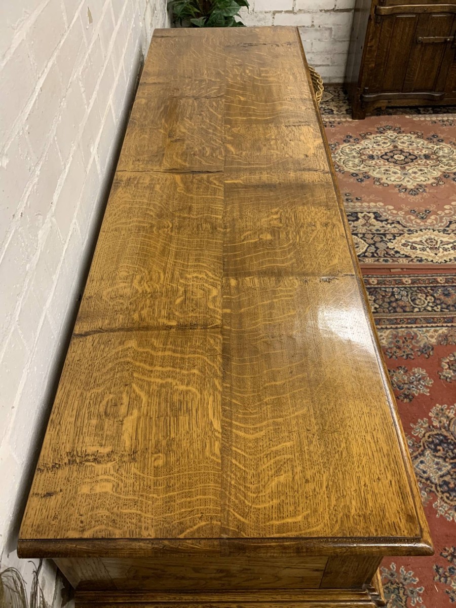 Made in glorious solid oak this stunning dresser is in excellent condition. The oversailing top sits above three lockable drawers, each drawer having a pair of drop brass handles. With a wavy apron below, pot board panelled base this fabulous oak dresser stands on six turned legs on traditional block feet.