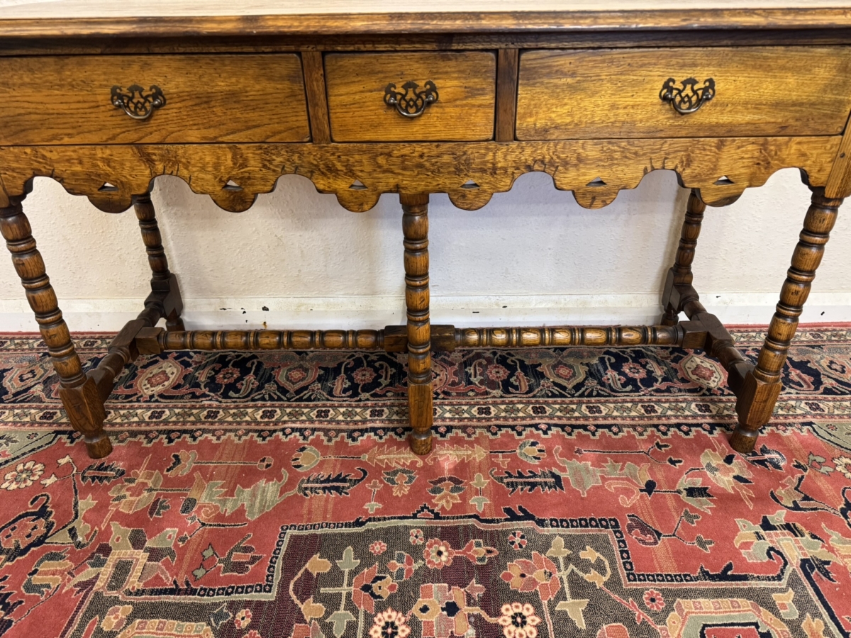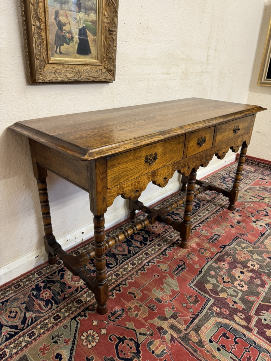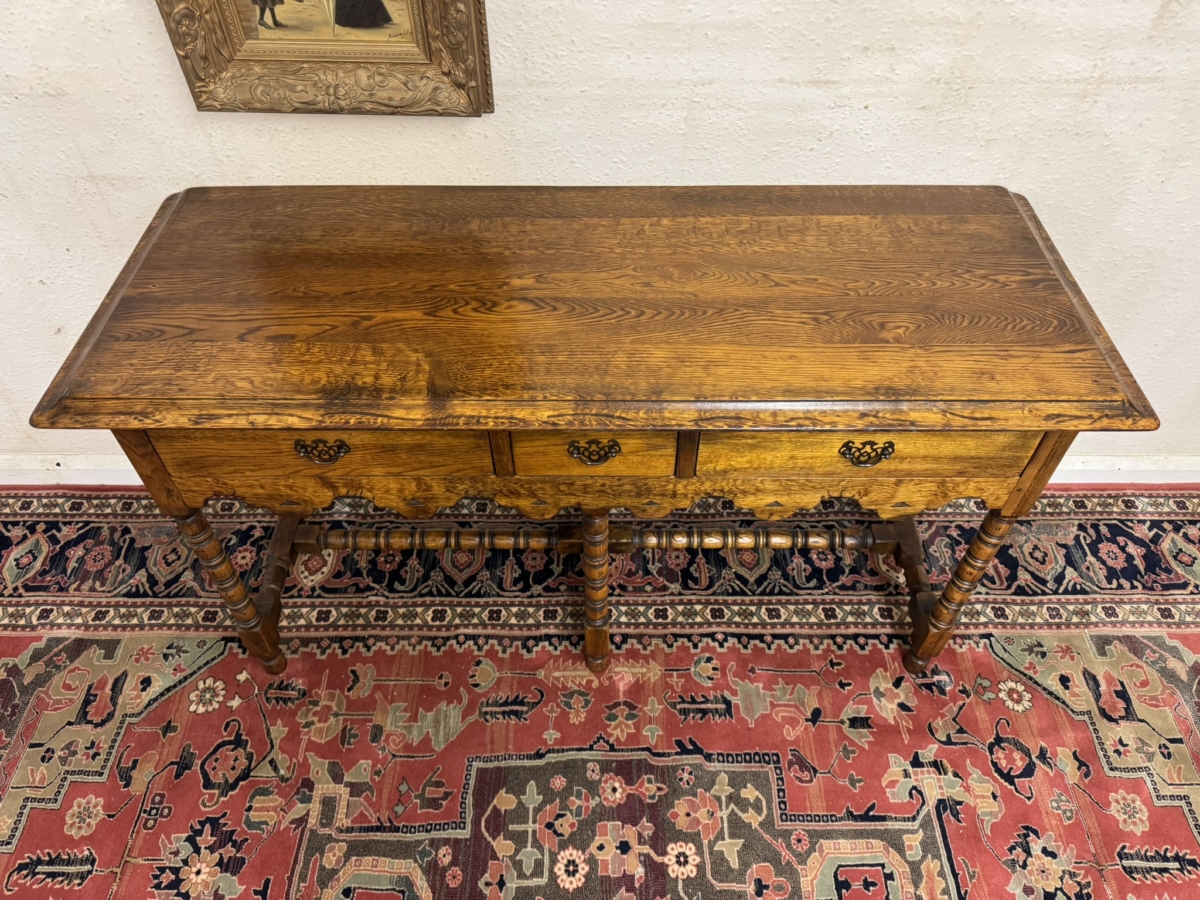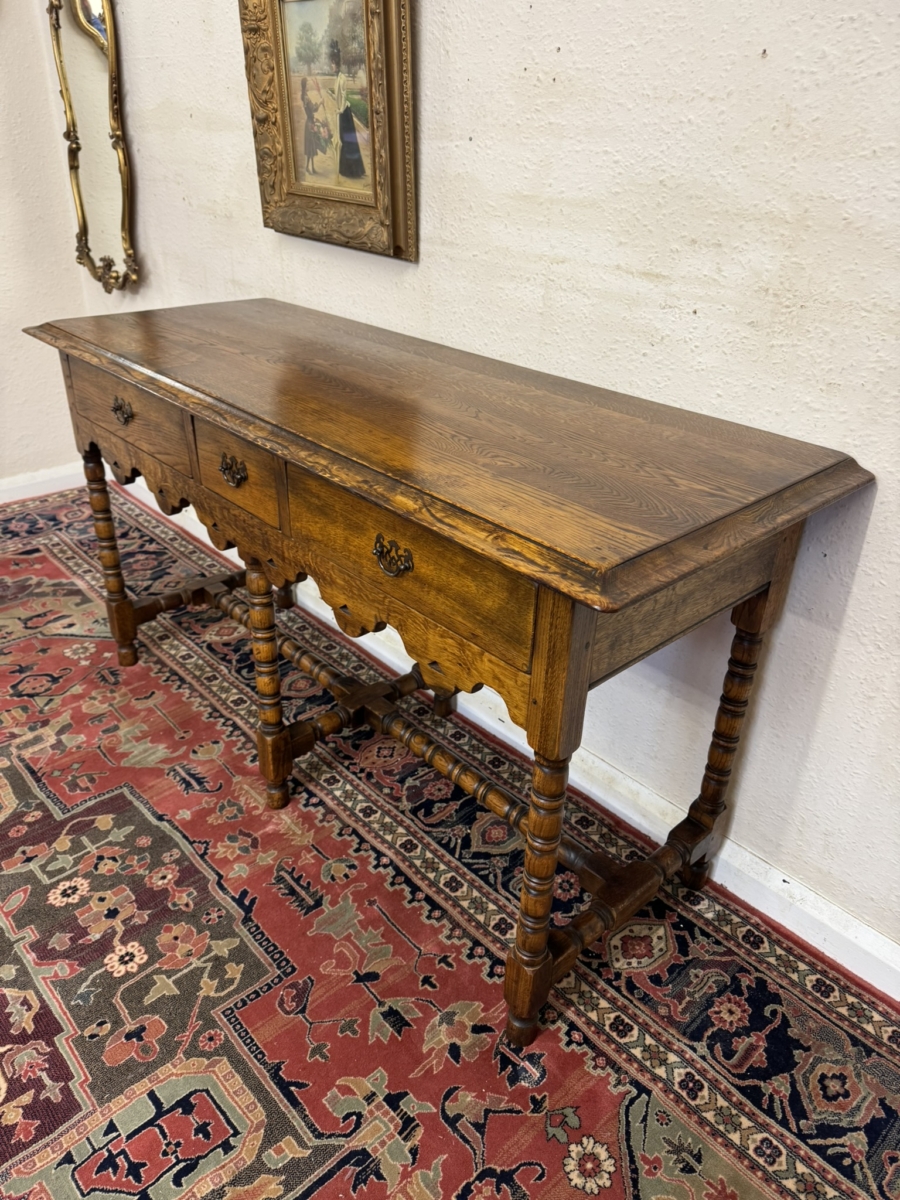 This beautifully grained oak dresser is in excellent condition. The over sailing top sits above a central short drawer which is flanked by a pair of long drawers, each drawer having a drop handle. Wavy apron beneath the drawers and standing on six fabulous turned legs with turned stretcher supports and standing on six turned feet.