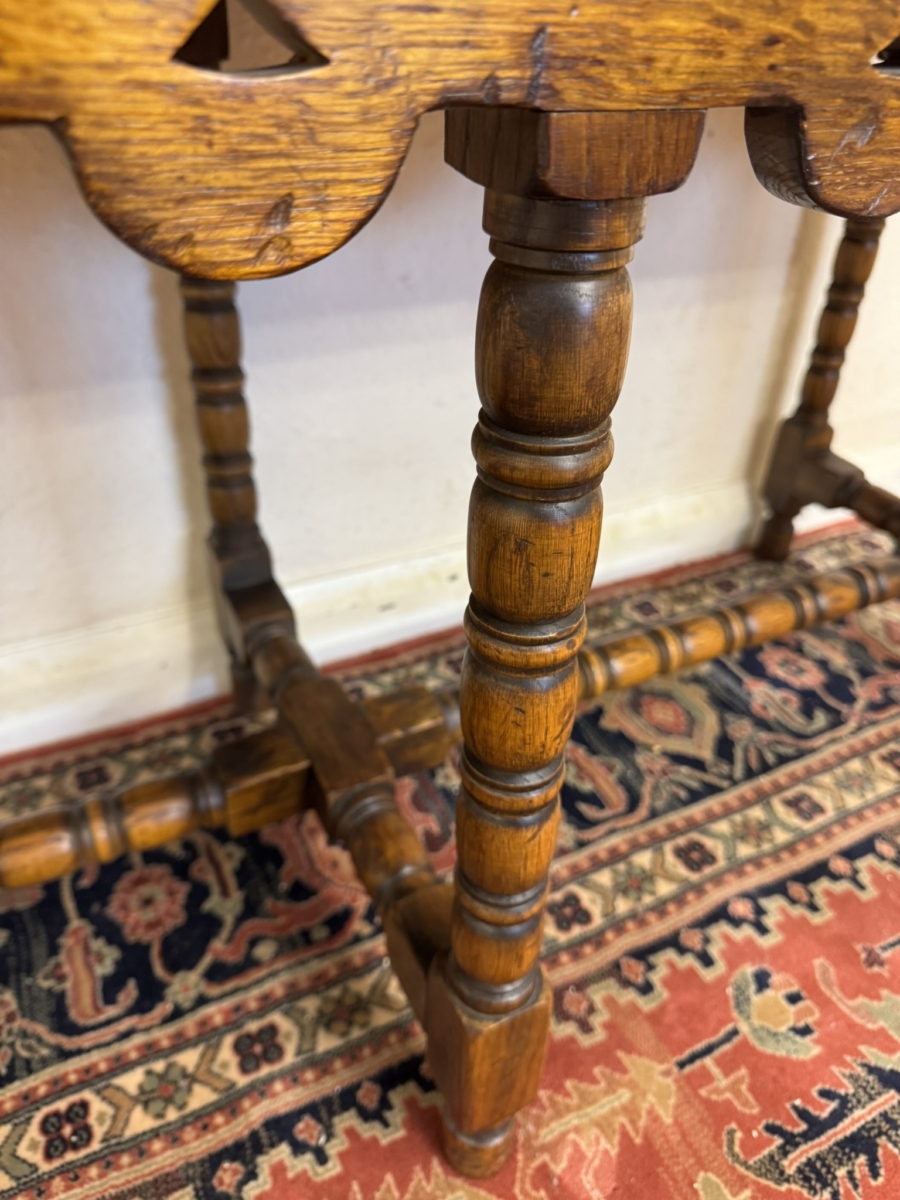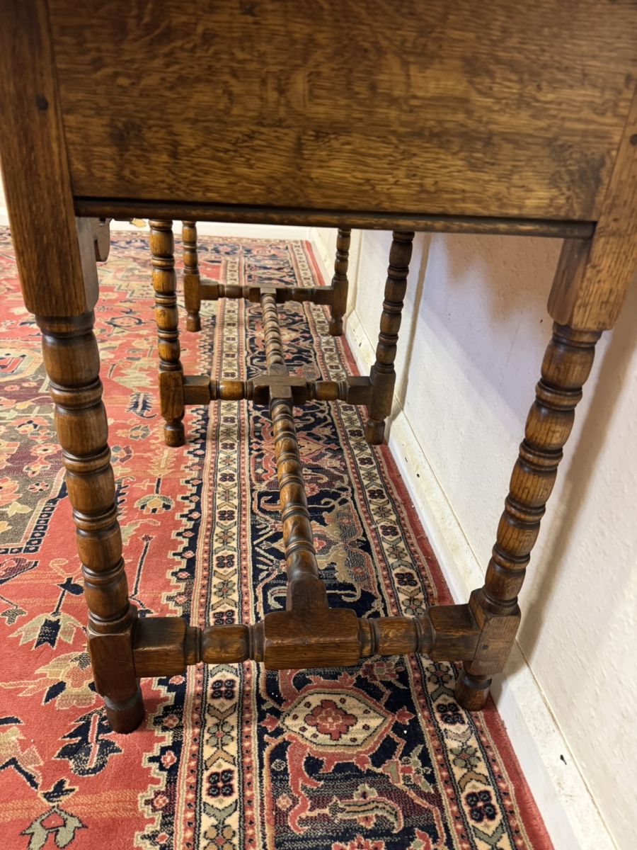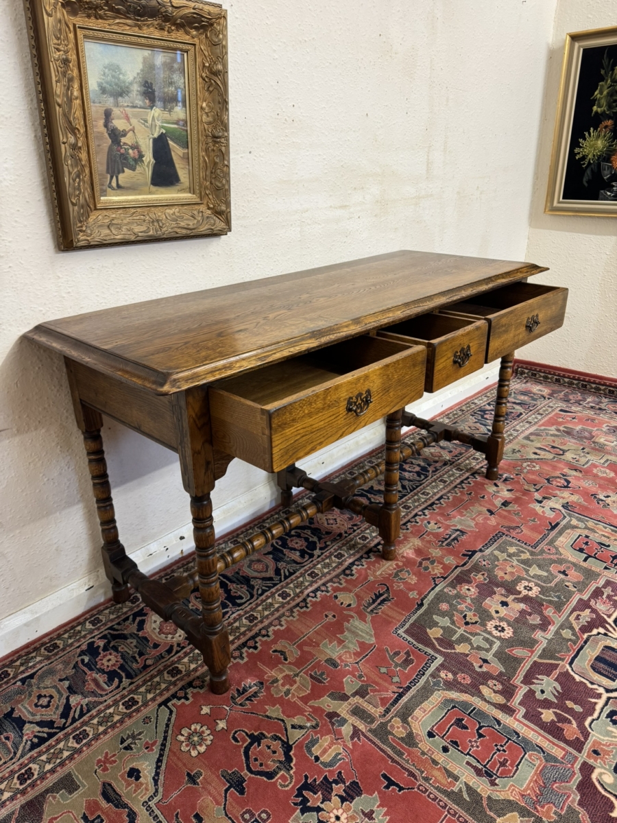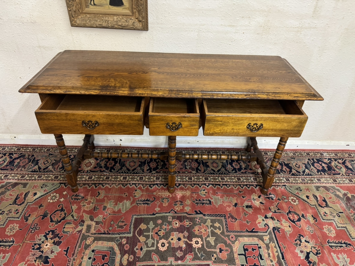 This beautifully grained oak dresser is in excellent condition. The over sailing top sits above a central short drawer which is flanked by a pair of long drawers, each drawer having a drop handle. Wavy apron beneath the drawers and standing on six fabulous turned legs with turned stretcher supports and standing on six turned feet.