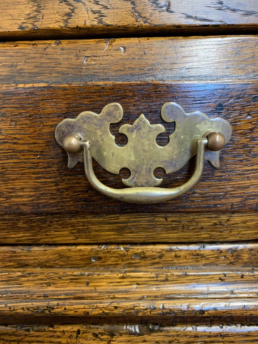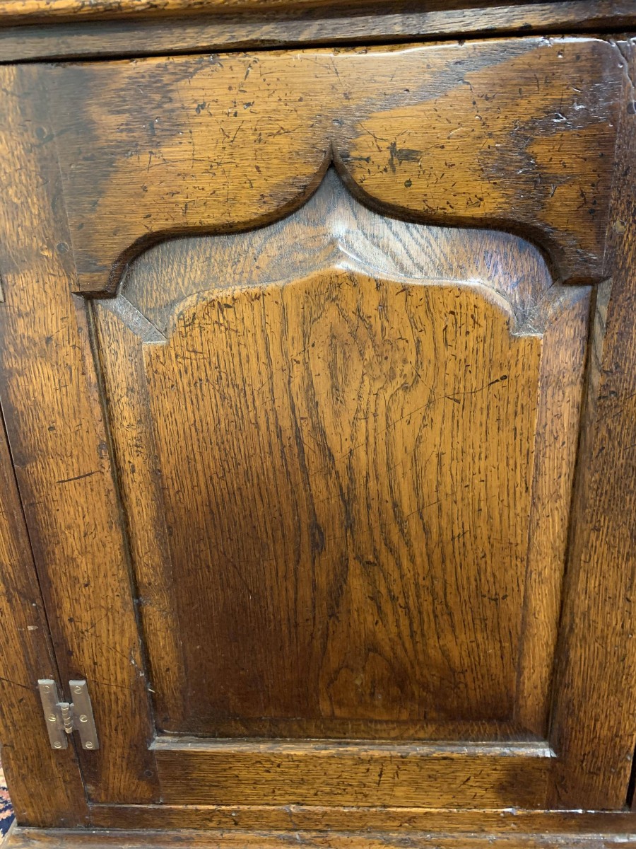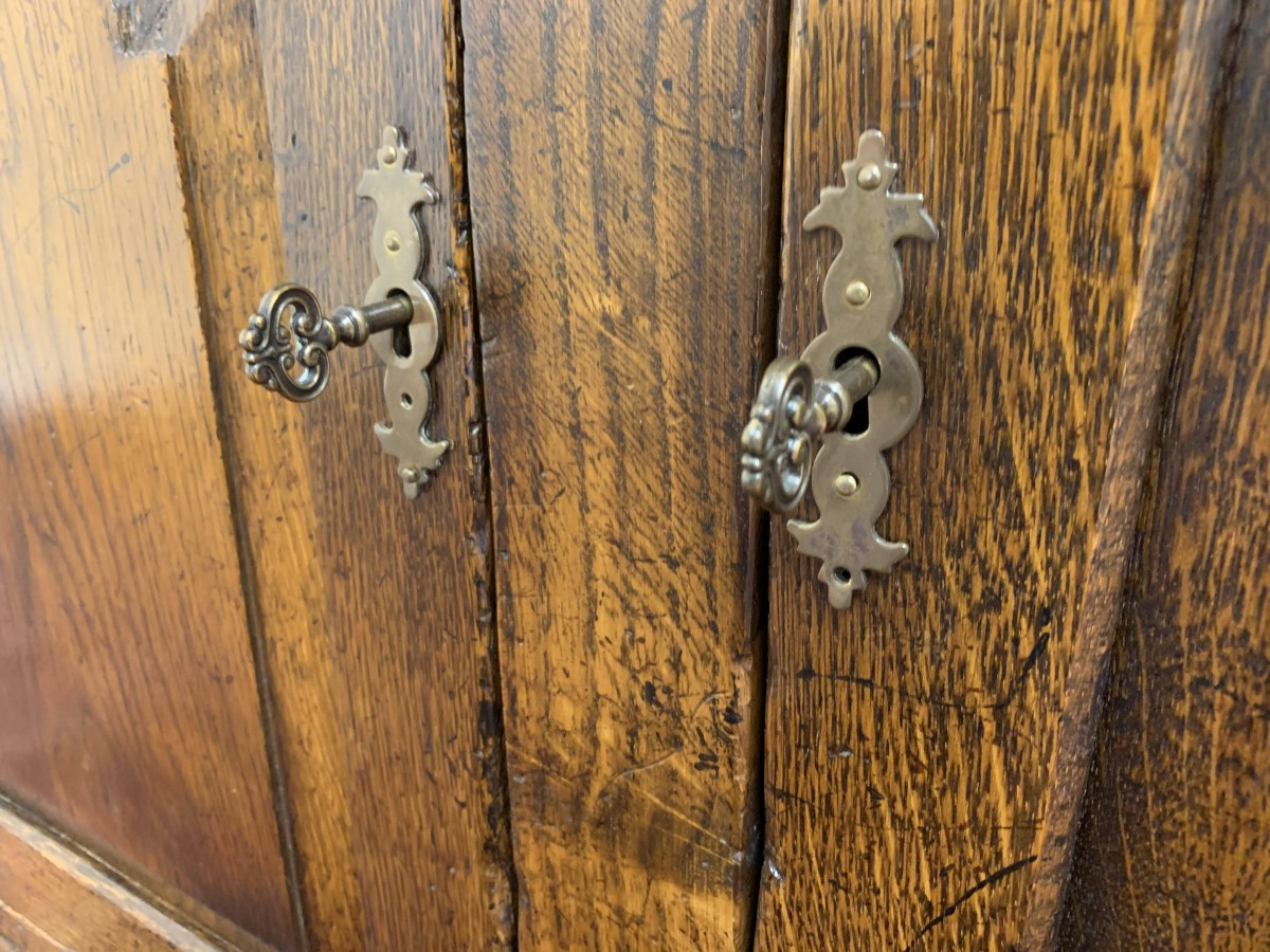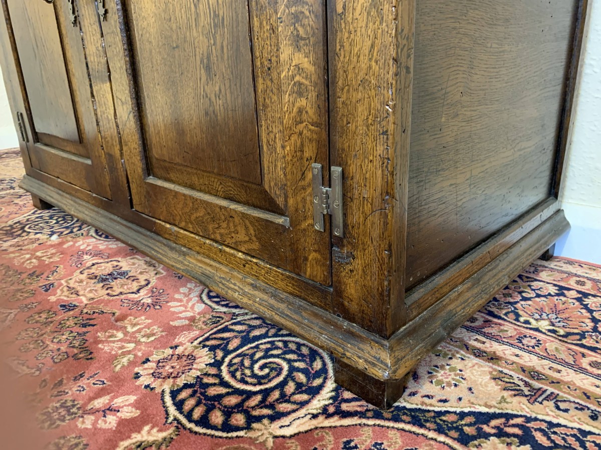 A superb oak dresser which is in excellent condition. The oversailing top sits above two drawers, below are three fielded panelled doors each with brass key, escutcheon and “H” hinges. Recessed panelled sides, this gorgeous dresser stands on traditional block feet. Please note that the platina is striking.