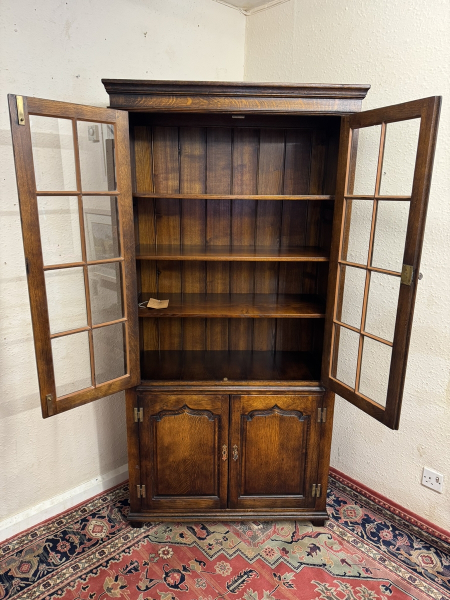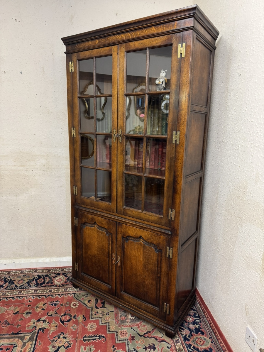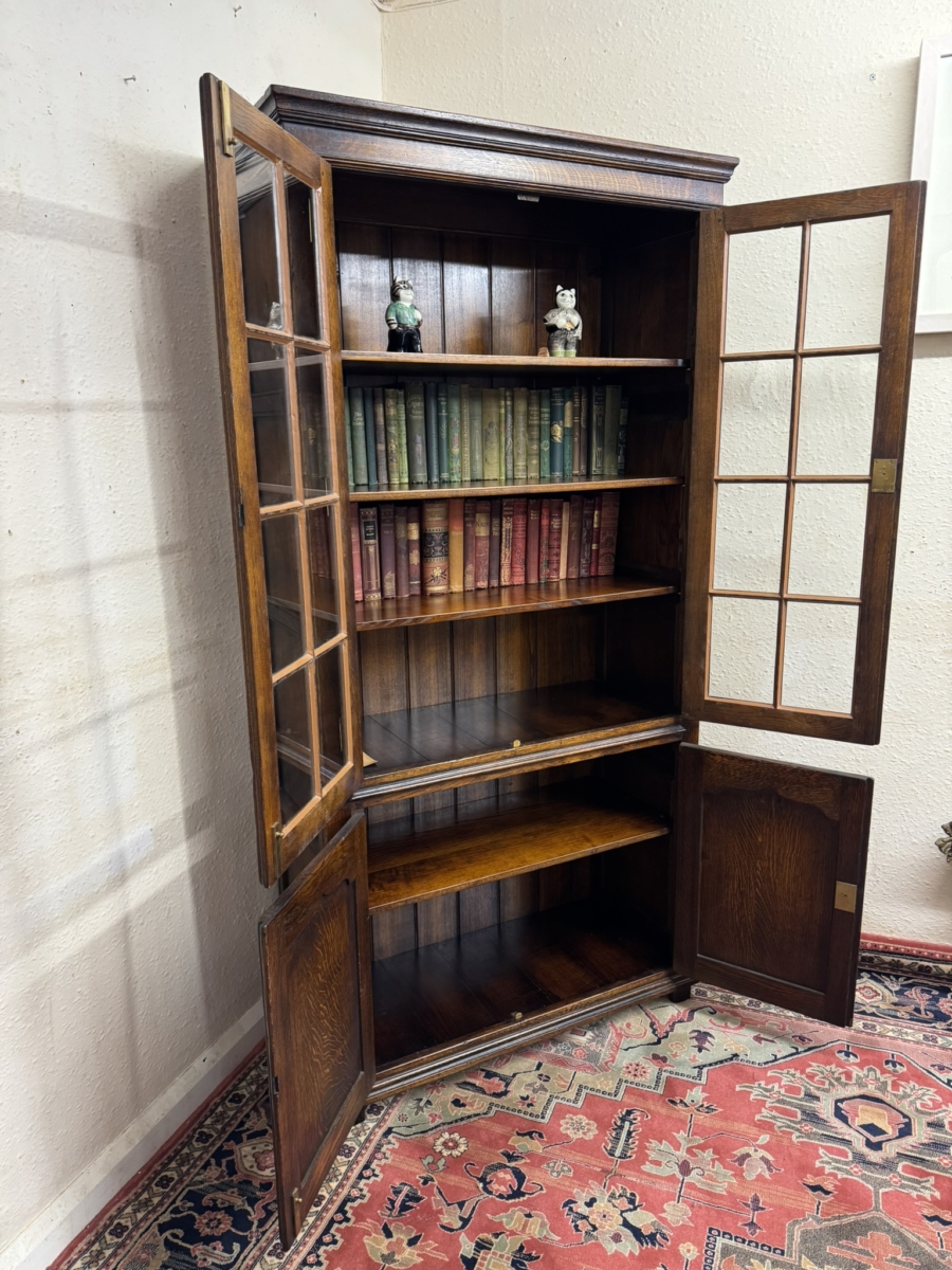 This fantastic bookcase is made in solid oak and is in excellent condition. The over sailing top sits above a pair of lockable glazed doors, each door having brass H hinges, brass escutcheon and key. The doors open to reveal three adjustable and removable shelves. Below are a pair of lockable shaped recessed panelled doors, each door having brass H hinges and brass escutcheon. The doors open to reveal a fixed shelf. Recessed panelled sides and standing on traditional block feet.