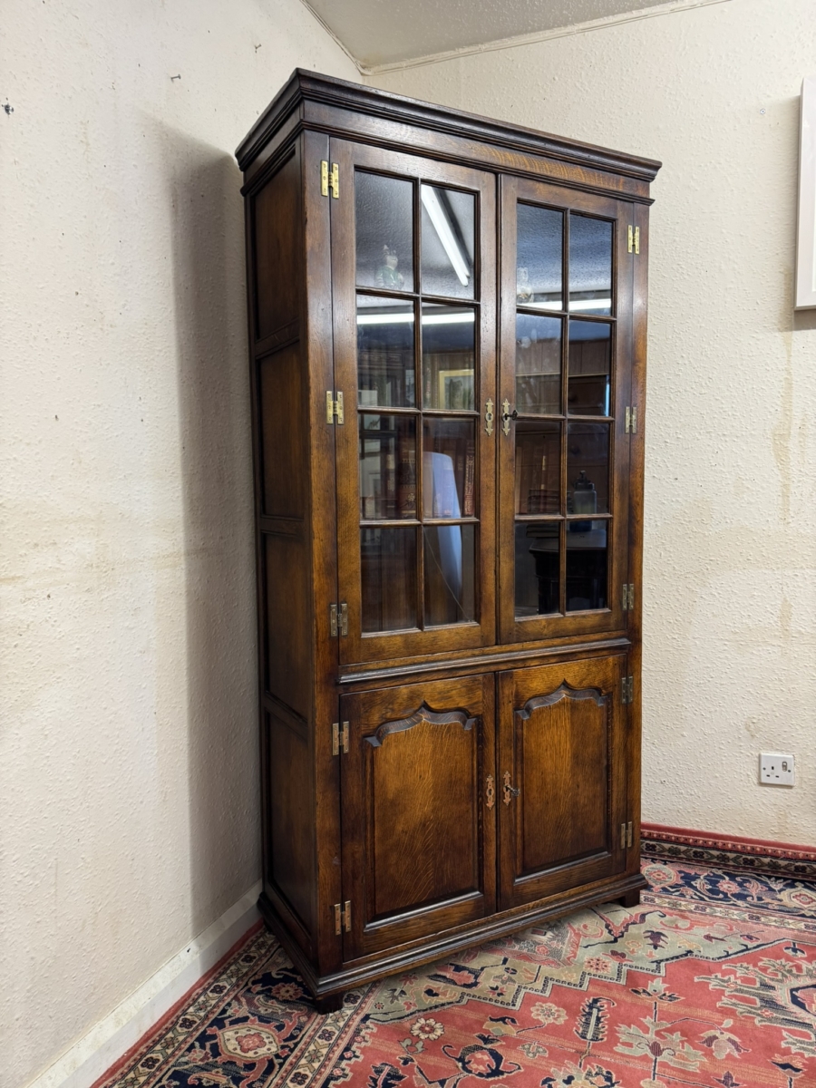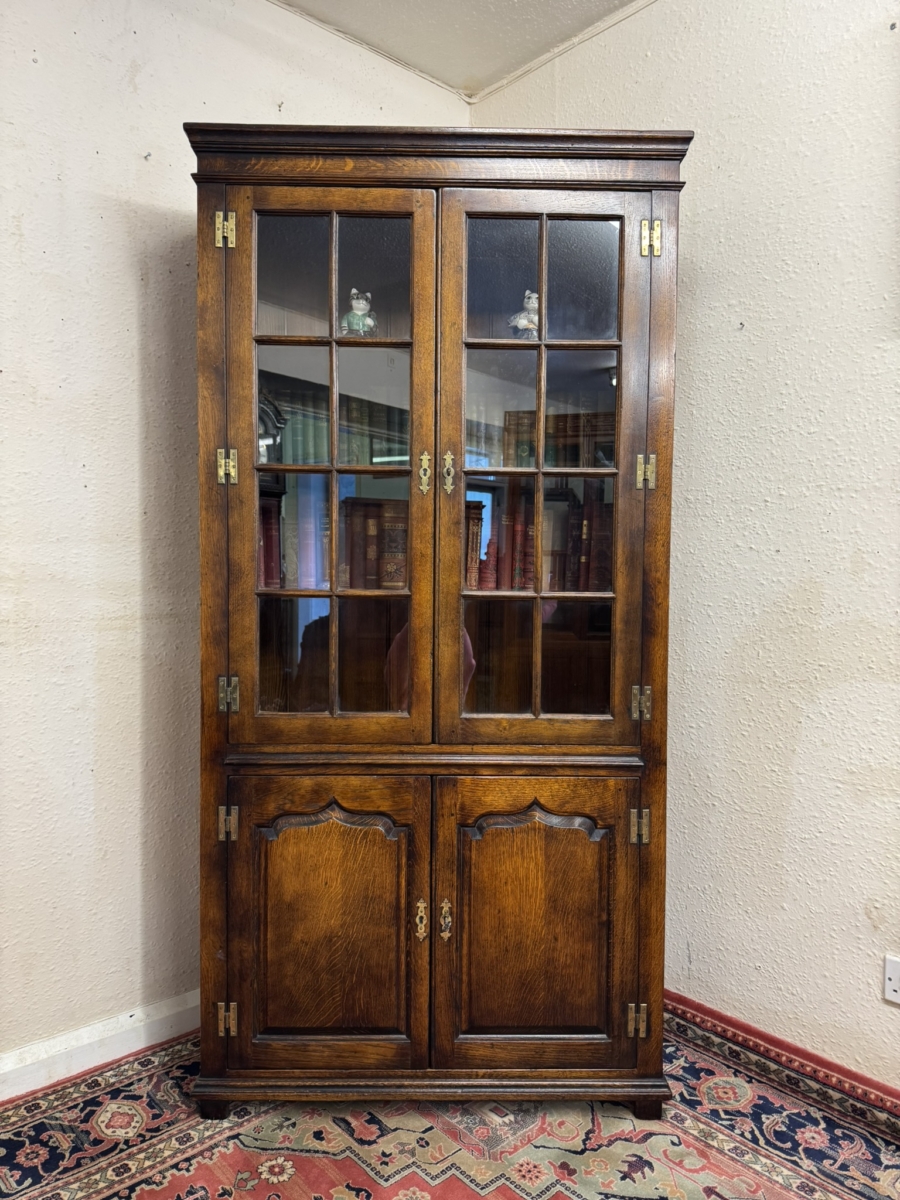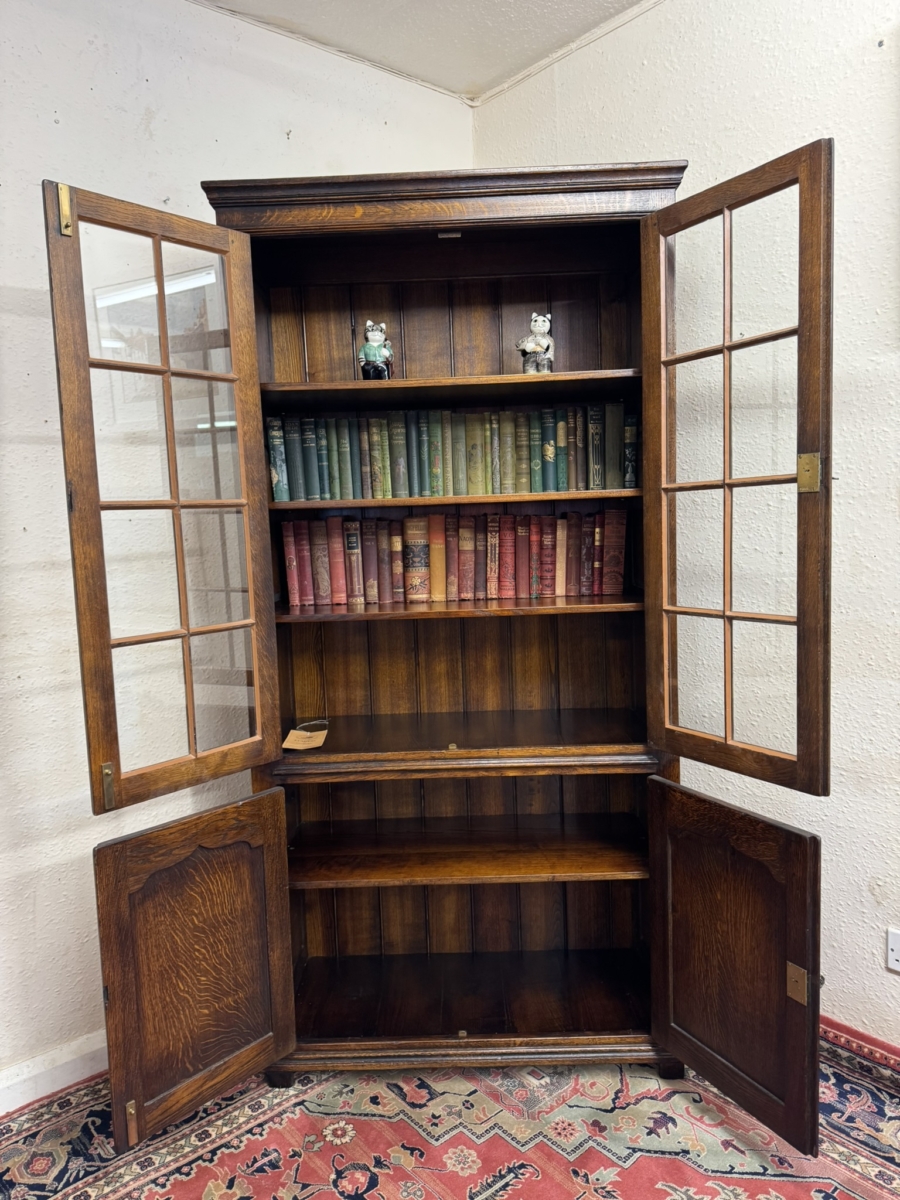 This fantastic bookcase is made in solid oak and is in excellent condition. The over sailing top sits above a pair of lockable glazed doors, each door having brass H hinges, brass escutcheon and key. The doors open to reveal three adjustable and removable shelves. Below are a pair of lockable shaped recessed panelled doors, each door having brass H hinges and brass escutcheon. The doors open to reveal a fixed shelf. Recessed panelled sides and standing on traditional block feet.