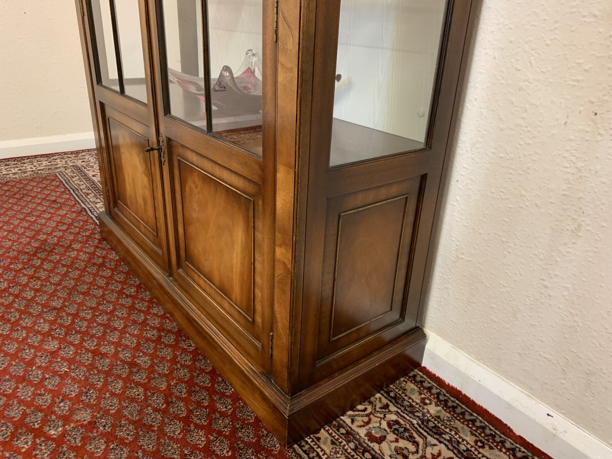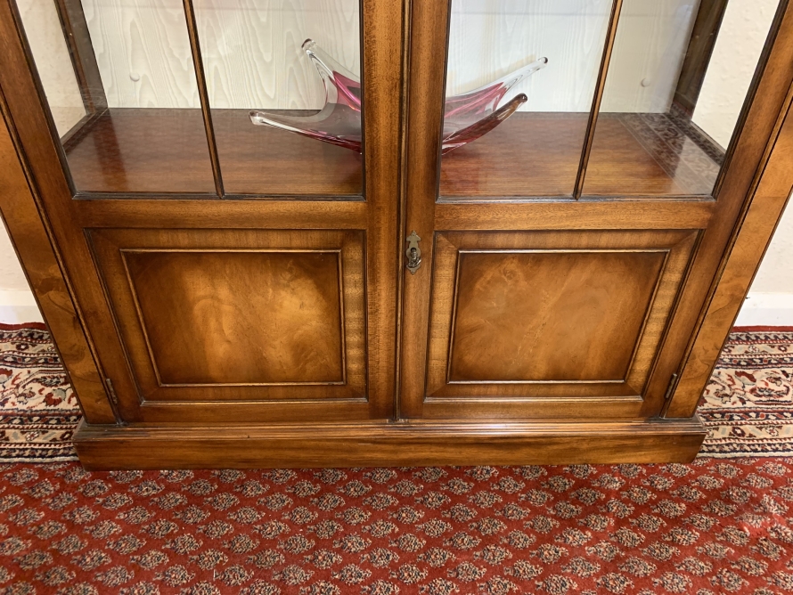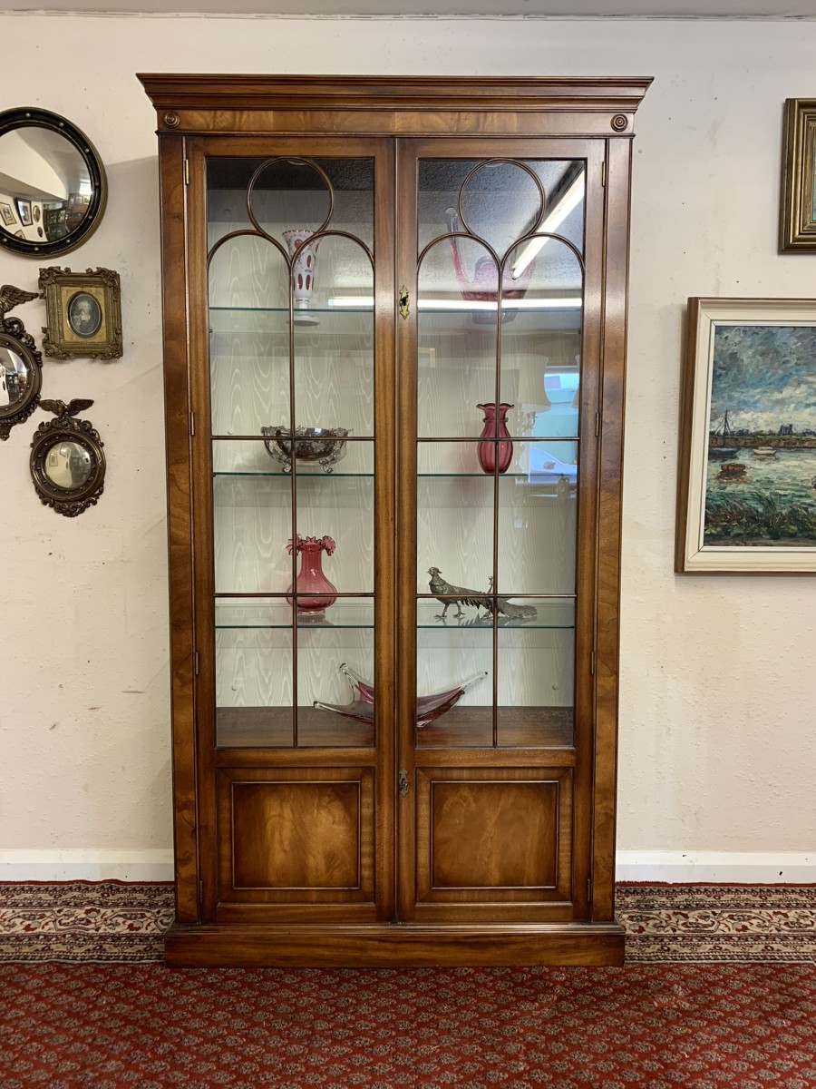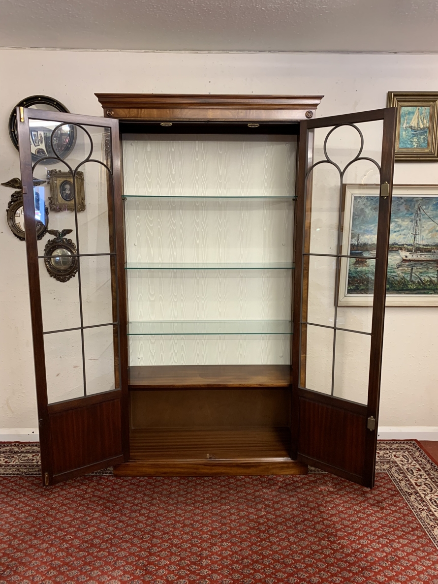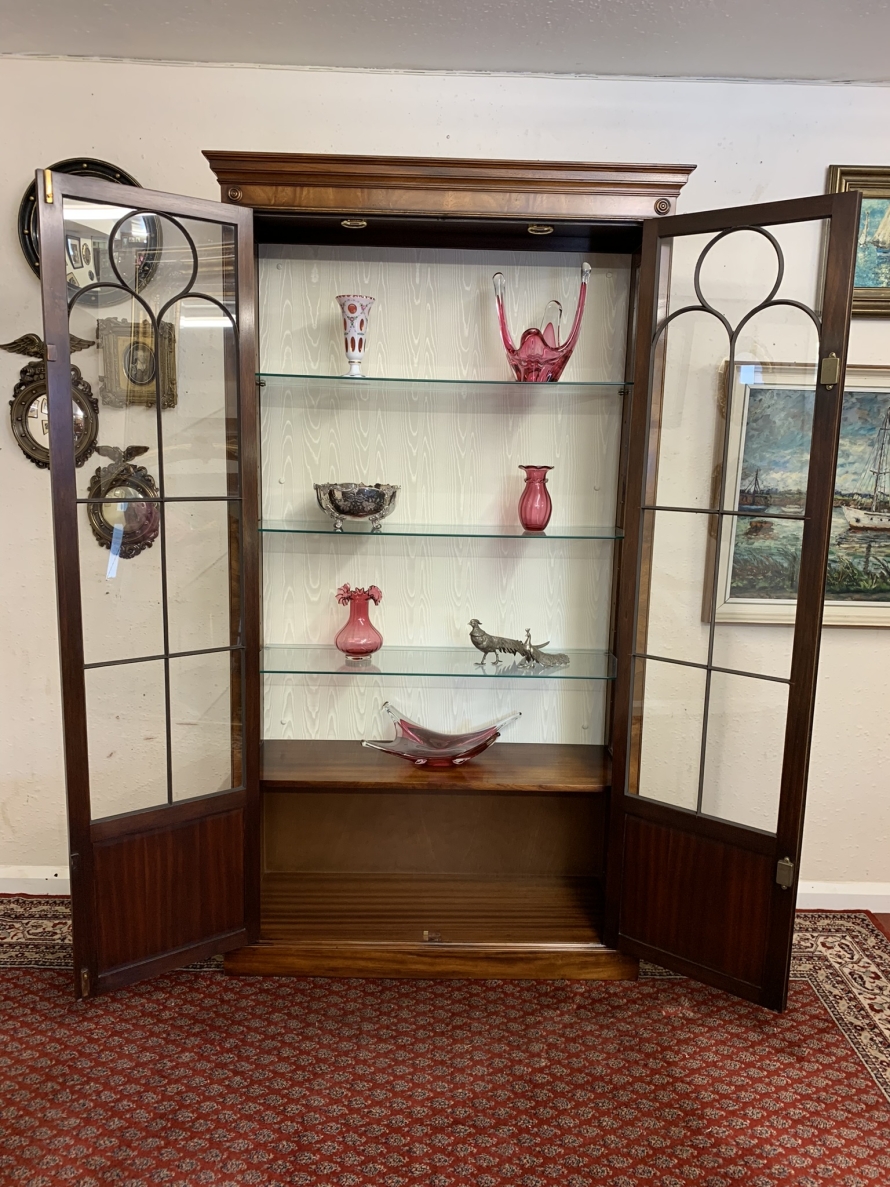 This fabulous display cabinet is in excellent condition. The stepped cornice sits above two lockable glazed doors, the doors having shaped wood barring with two recessed panels below. As a mark of quality the cabinet has two locks with keys. The doors open to reveal three glass adjustable and removable shelves with a shelf below. Glazed sides with recessed panel below this fabulous quality mahogany display cabinet stands on a plinth base.