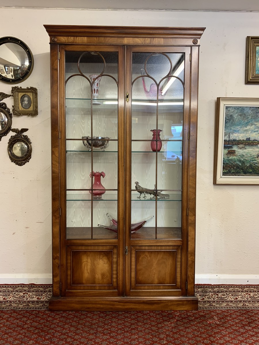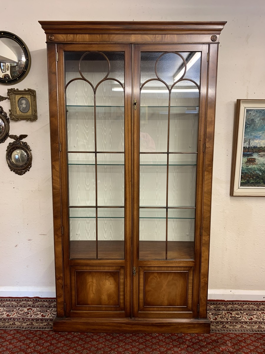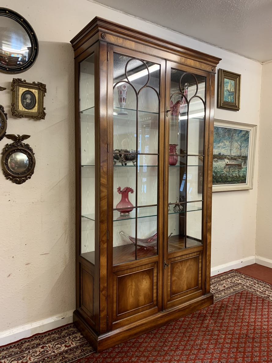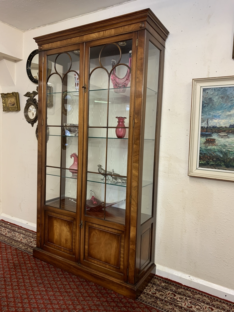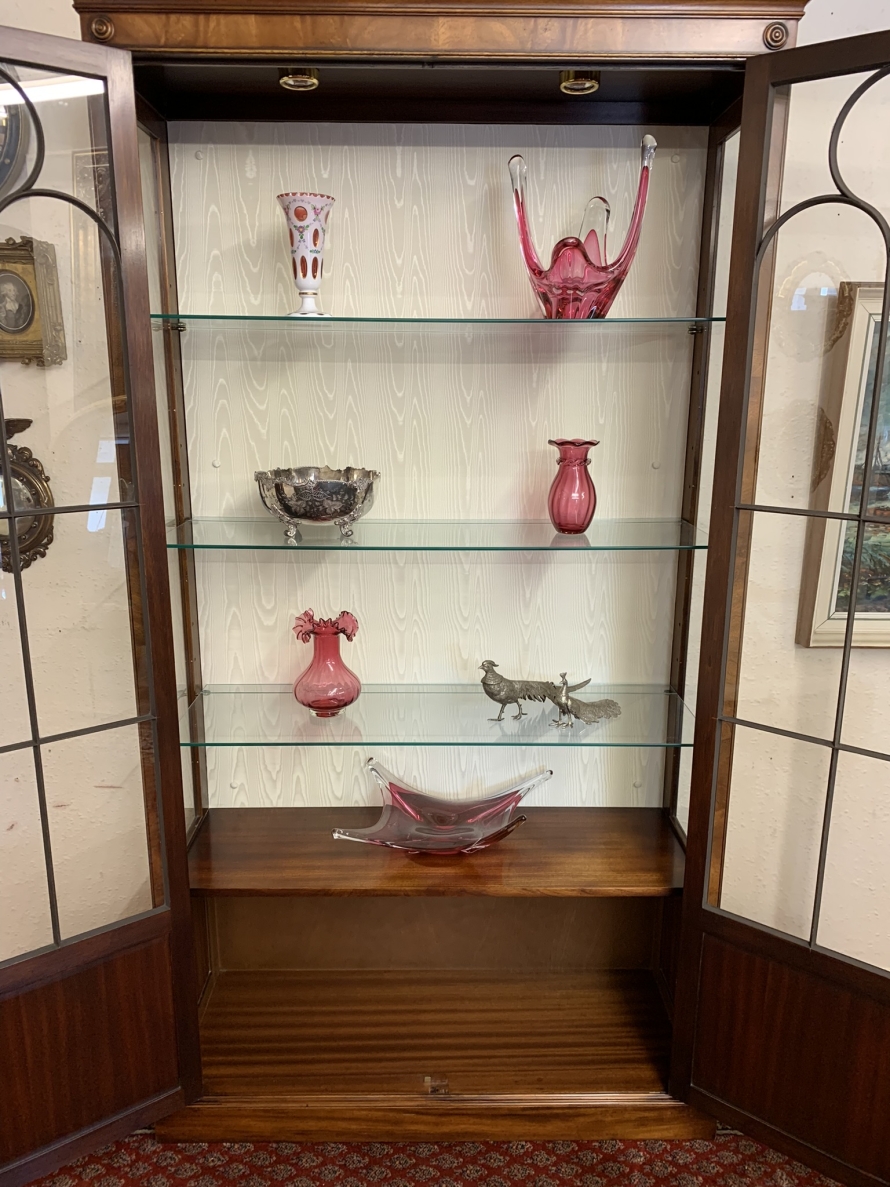 This fabulous display cabinet is in excellent condition. The stepped cornice sits above two lockable glazed doors, the doors having shaped wood barring with two recessed panels below. As a mark of quality the cabinet has two locks with keys. The doors open to reveal three glass adjustable and removable shelves with a shelf below. Glazed sides with recessed panel below this fabulous quality mahogany display cabinet stands on a plinth base.