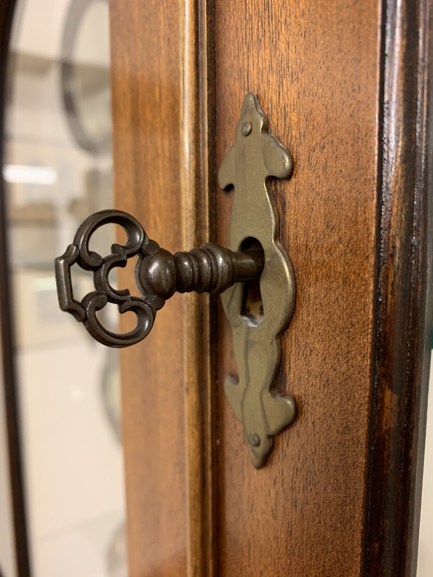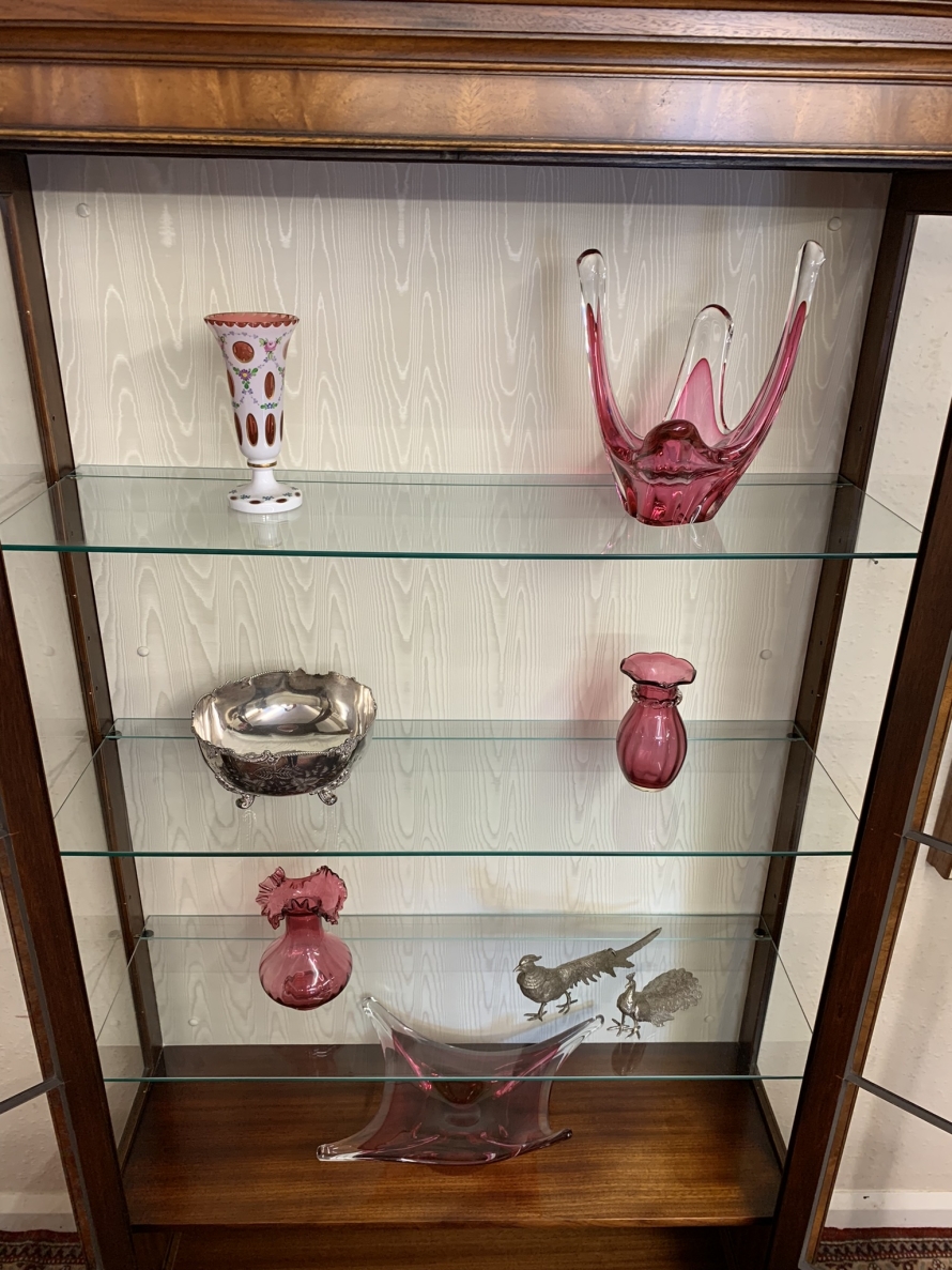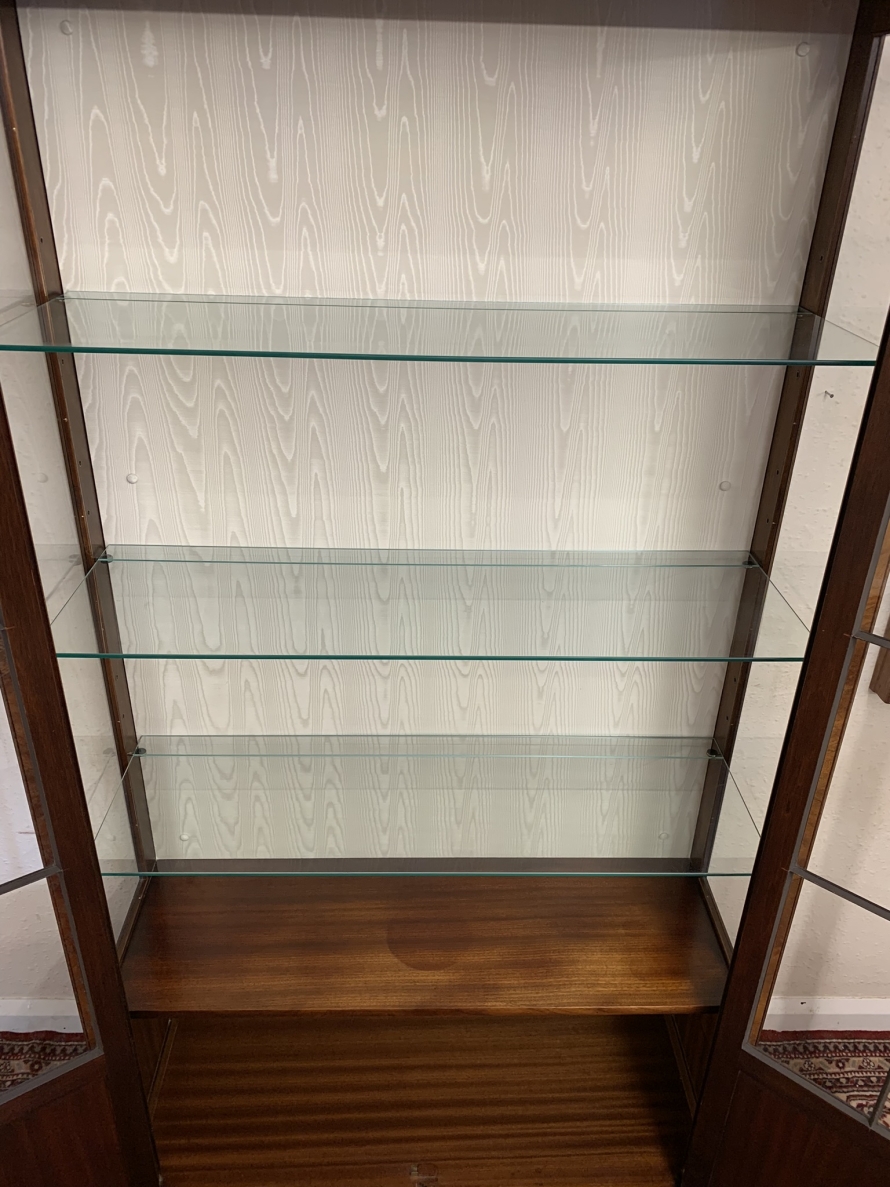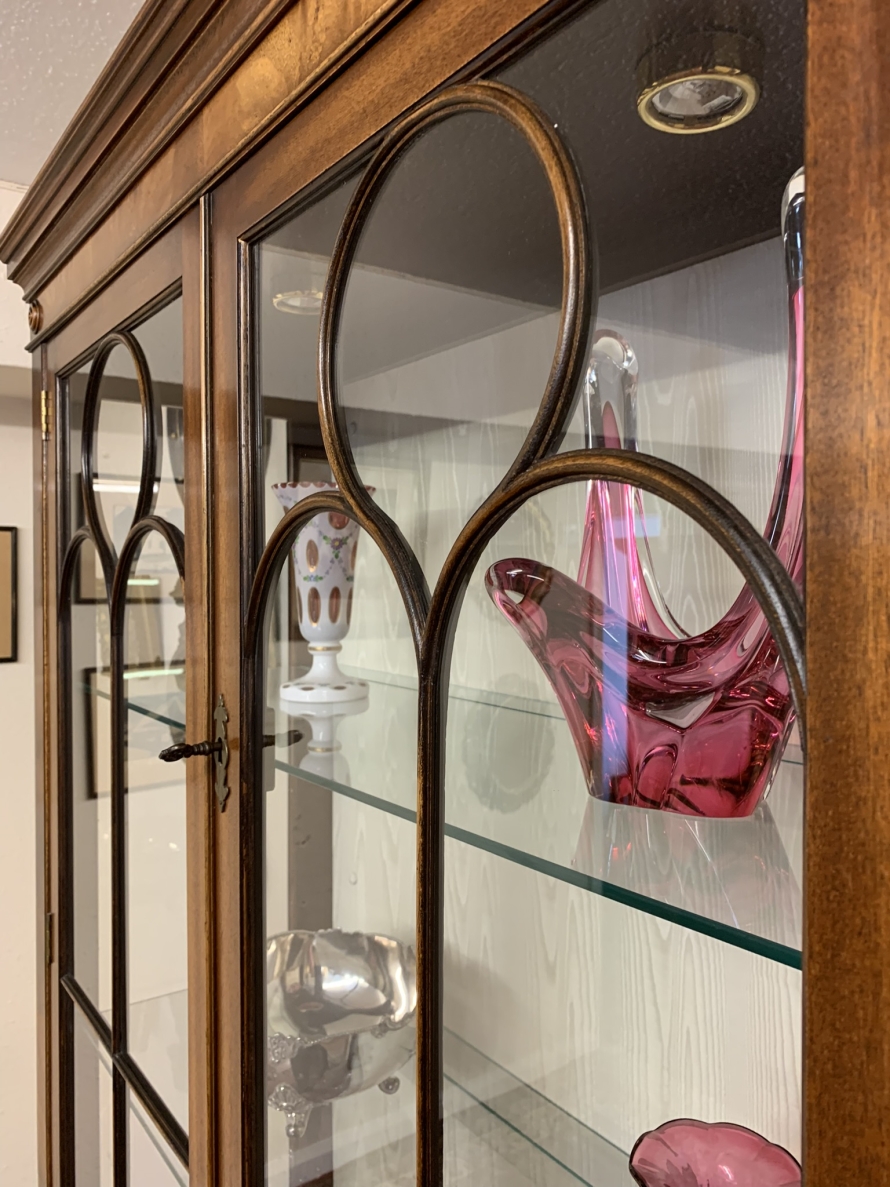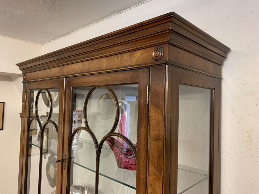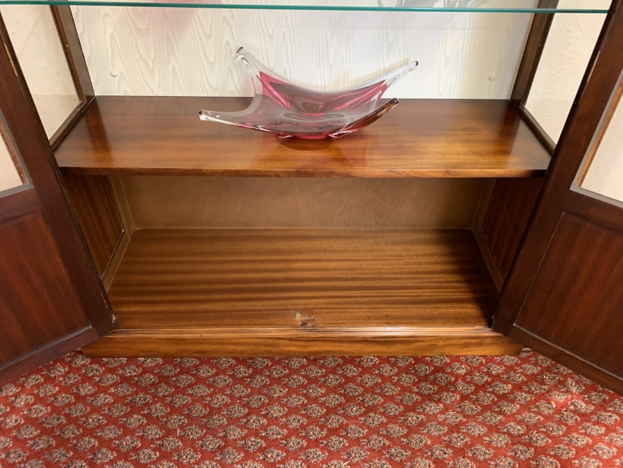 This fabulous display cabinet is in excellent condition. The stepped cornice sits above two lockable glazed doors, the doors having shaped wood barring with two recessed panels below. As a mark of quality the cabinet has two locks with keys. The doors open to reveal three glass adjustable and removable shelves with a shelf below. Glazed sides with recessed panel below this fabulous quality mahogany display cabinet stands on a plinth base.