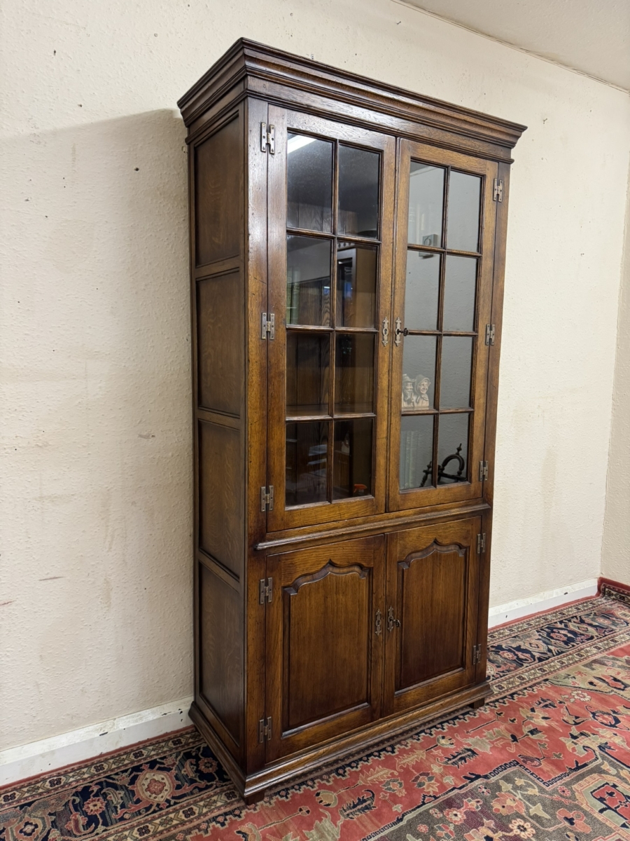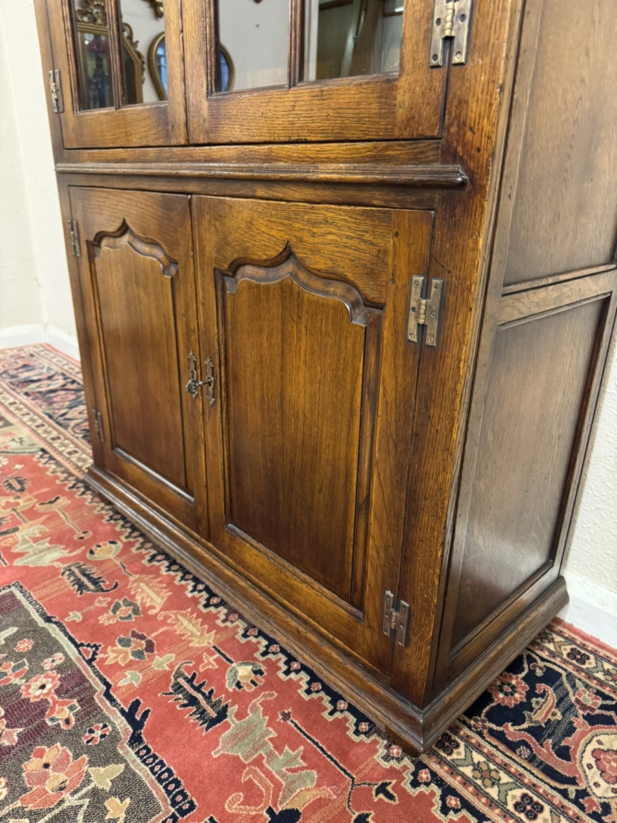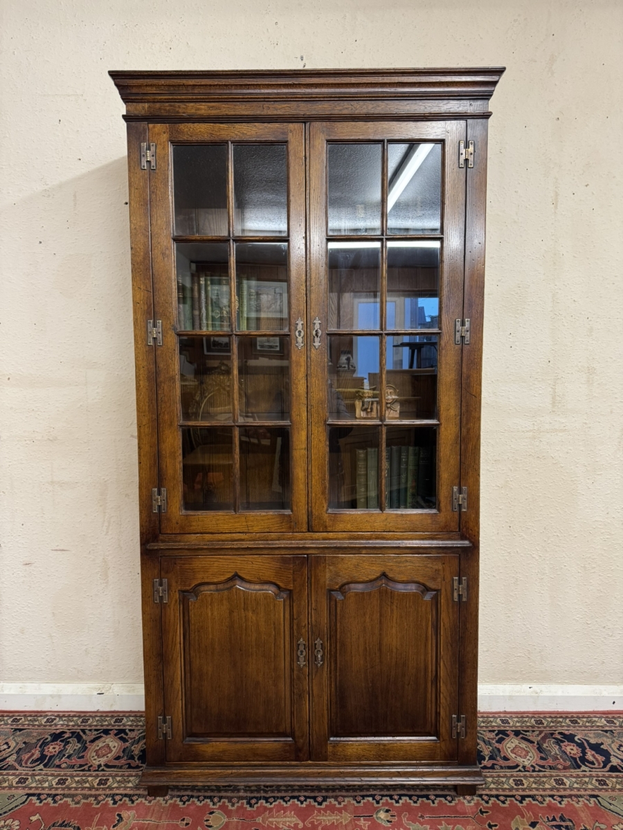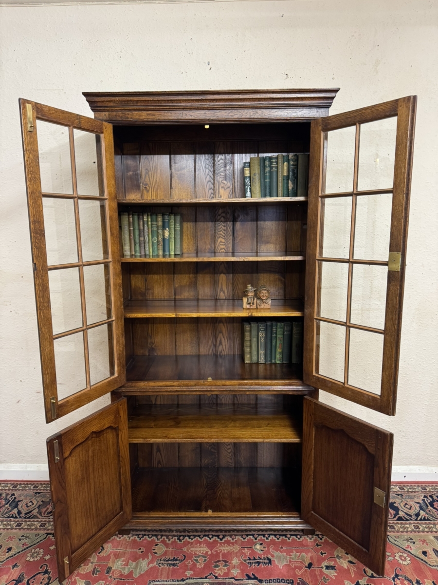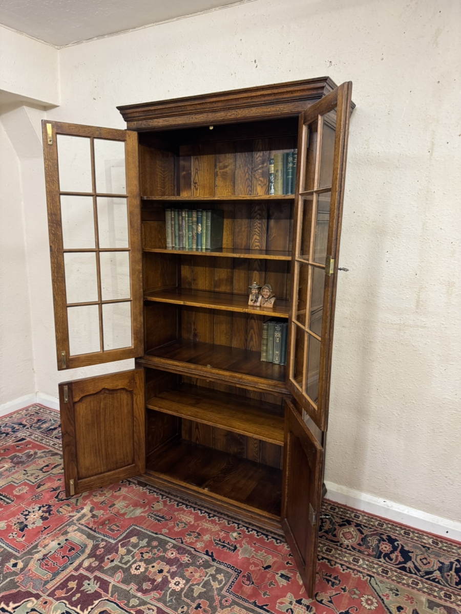 This super bookcase made entirely in solid oak is in excellent condition. The stepped cornice sits above a pair of lockable glazed doors, each door having traditional H brass hinges decorative brass escutcheon and key. There is wood barring decoration to the doors. The doors open to reveal a boarded back and three removable shelves. Below are a pair of shaped recessed panelled lockable doors, each door having brass H hinges, brass escutcheon and key. The doors open to reveal a boarded back and base and fixed shelf. Stepped skirt and standing on traditional block feet.