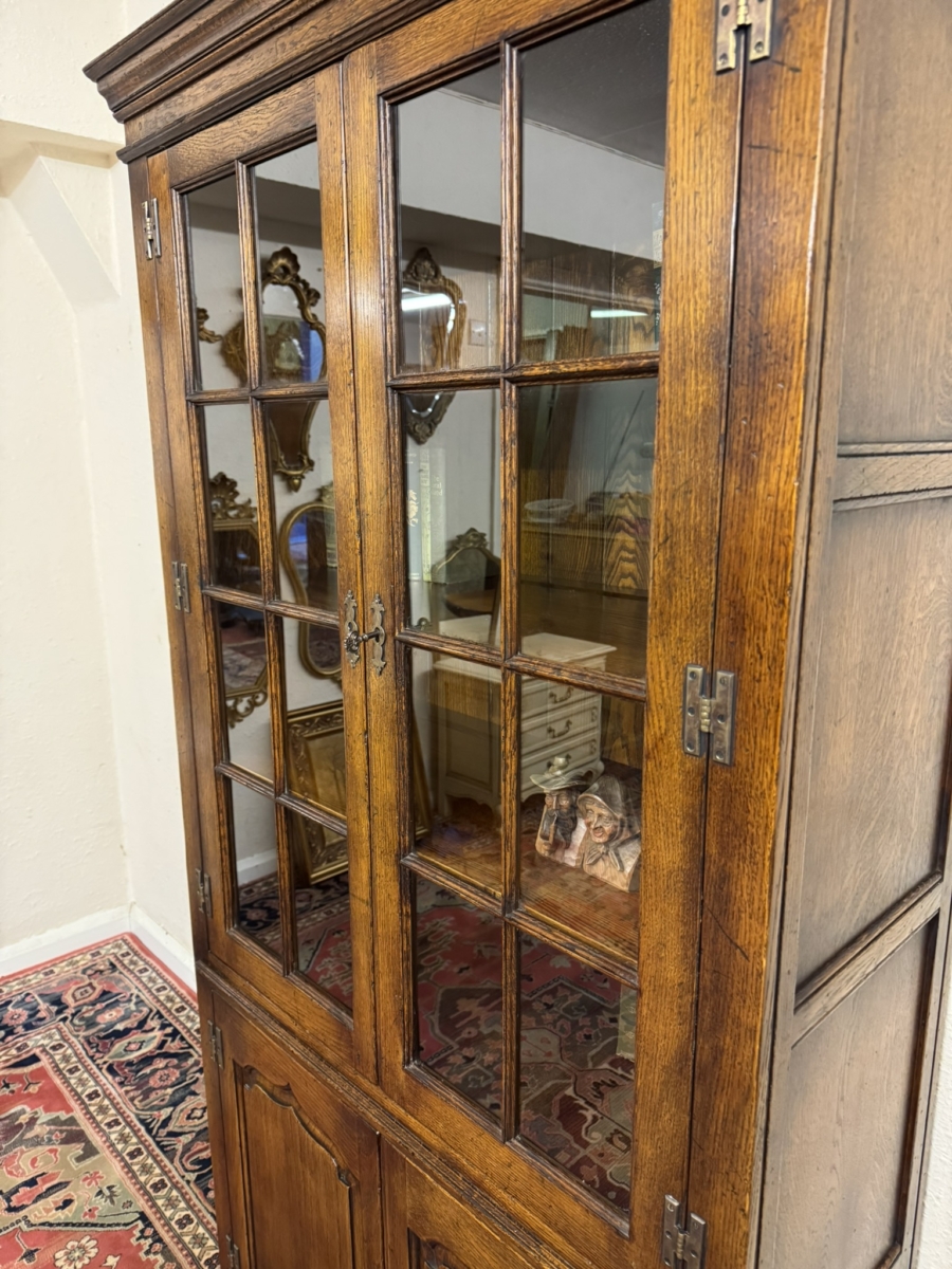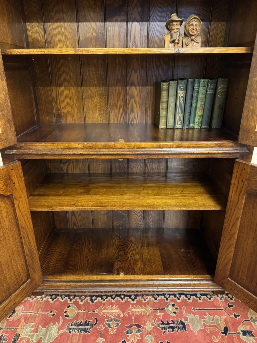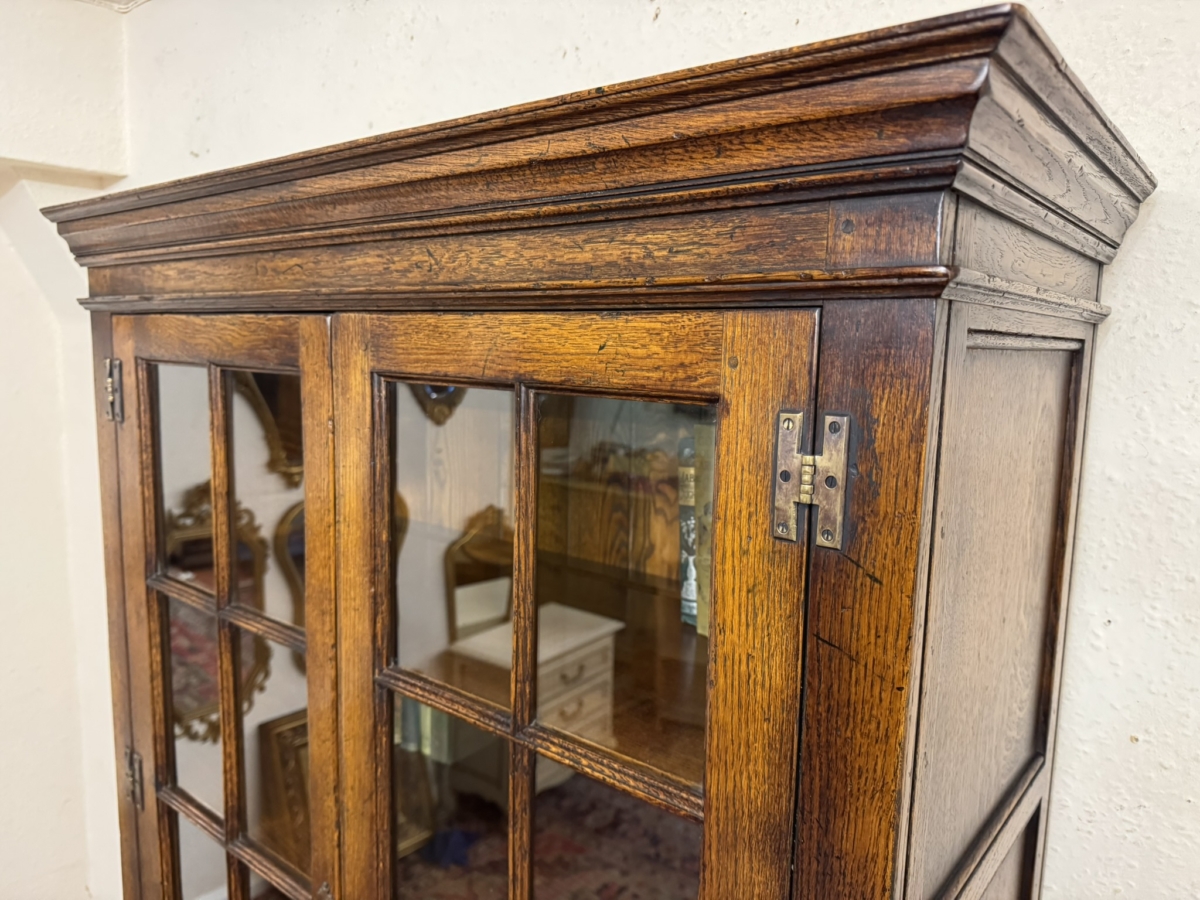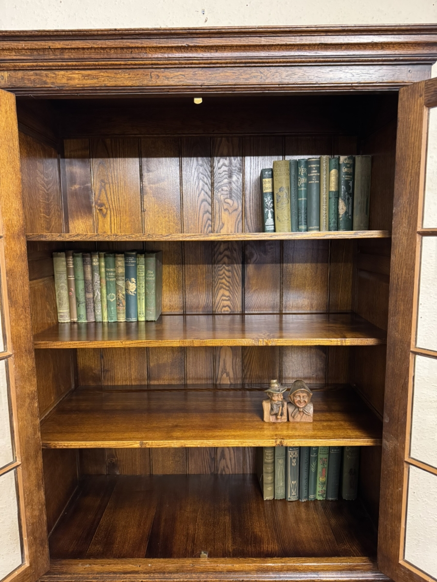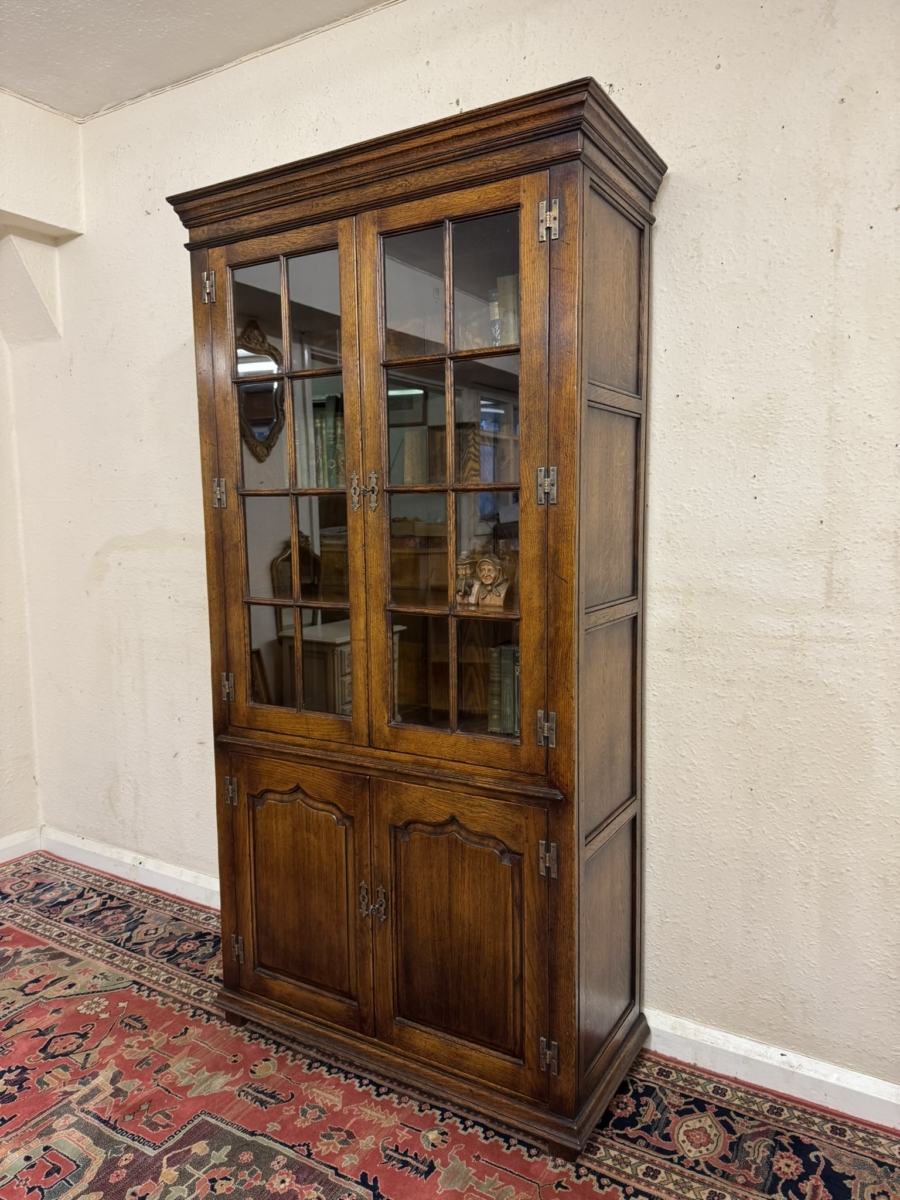 This super bookcase made entirely in solid oak is in excellent condition. The stepped cornice sits above a pair of lockable glazed doors, each door having traditional H brass hinges decorative brass escutcheon and key. There is wood barring decoration to the doors. The doors open to reveal a boarded back and three removable shelves. Below are a pair of shaped recessed panelled lockable doors, each door having brass H hinges, brass escutcheon and key. The doors open to reveal a boarded back and base and fixed shelf. Stepped skirt and standing on traditional block feet.