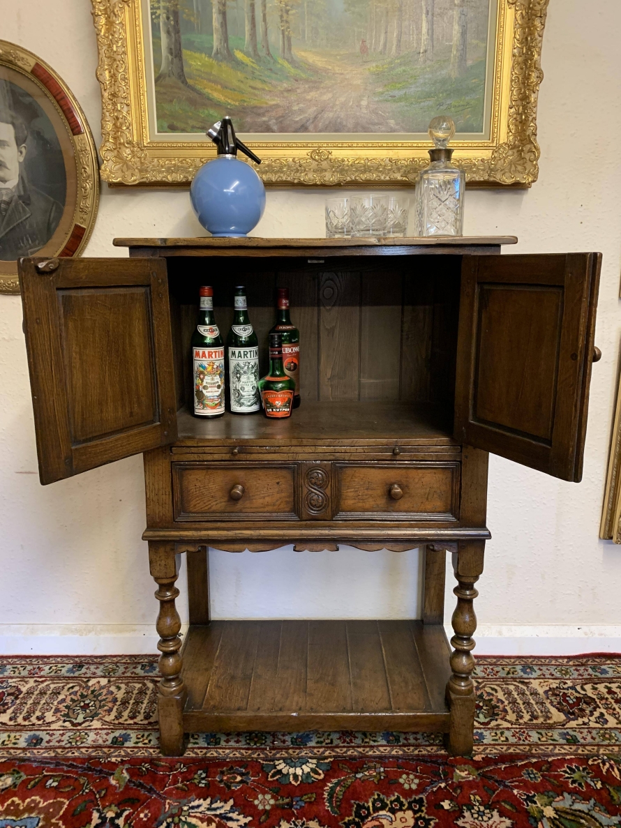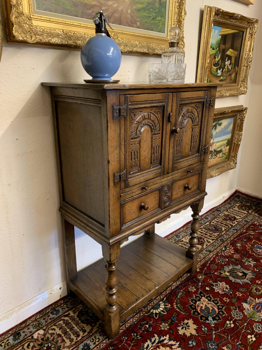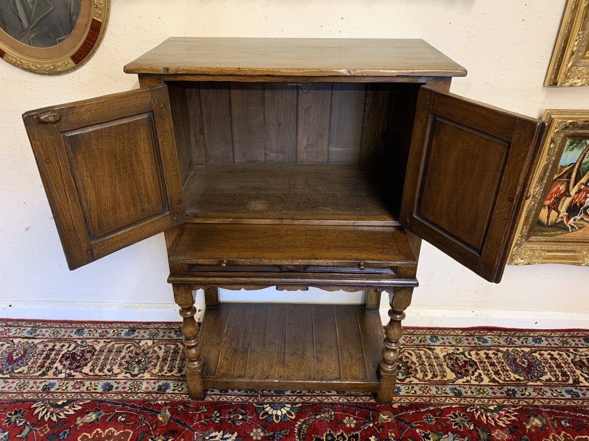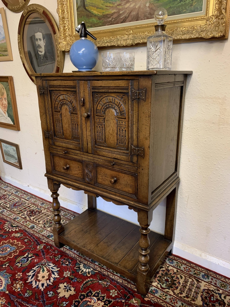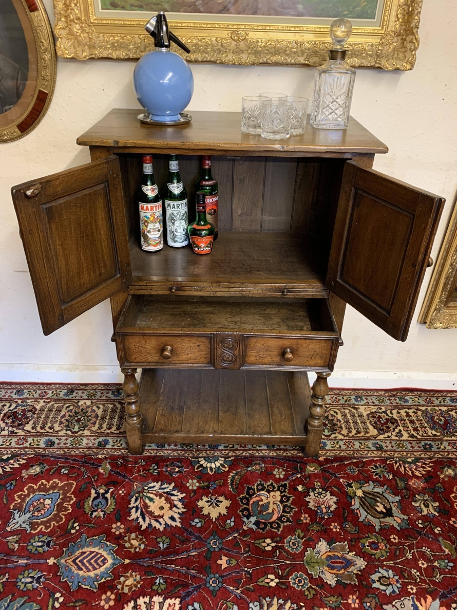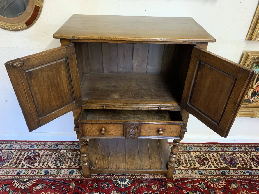 The oversailing top sits above a pair of carved recessed panelled doors, the doors having primitive hinges , turned knob handle and locking latch the doors open to reveal ample storage. There is a serving slide below which in turn sits above drawer. Having a pot board base with two elegant turned legs on block supports to the front. The cabinet is made by the renowned Titchmarsh and Goodwin furniture makers and is in excellent condition.