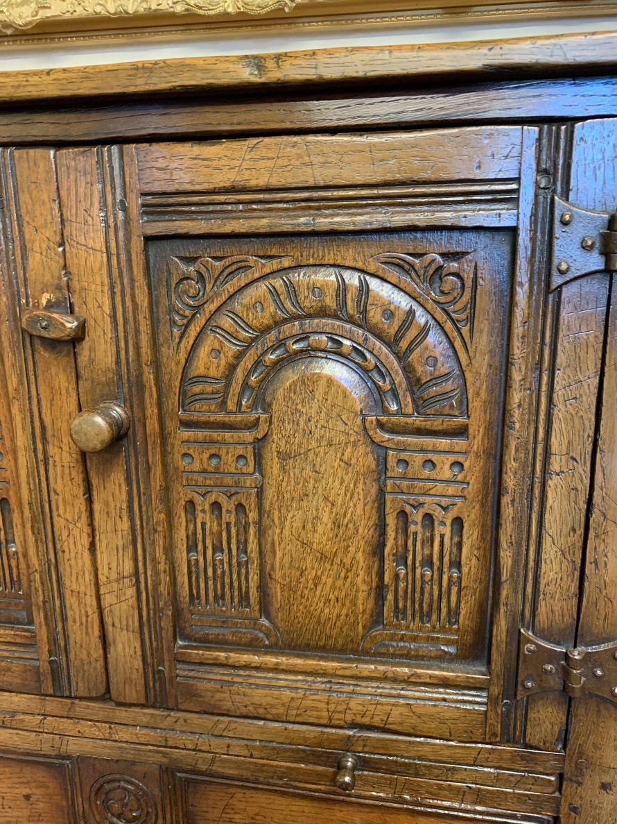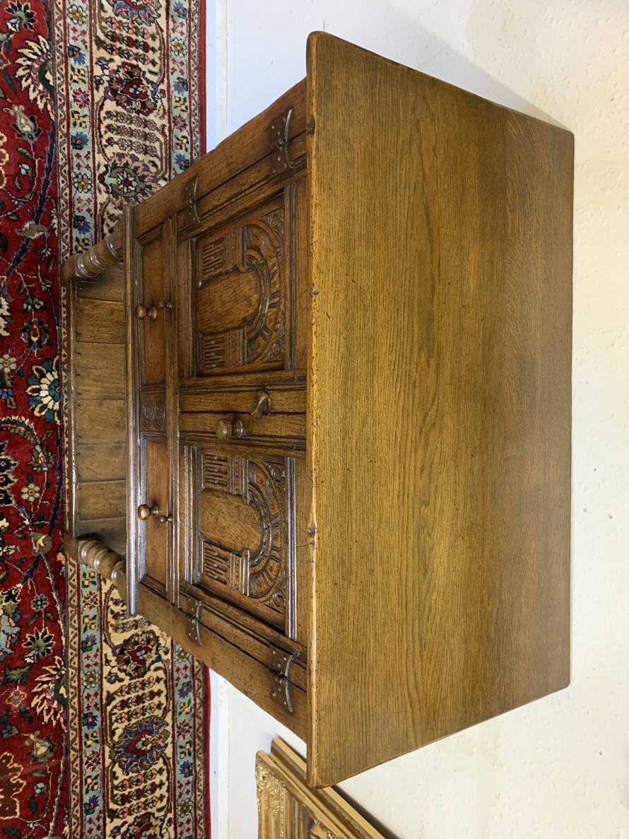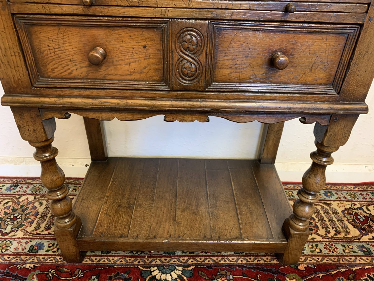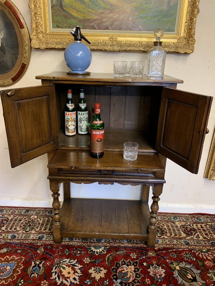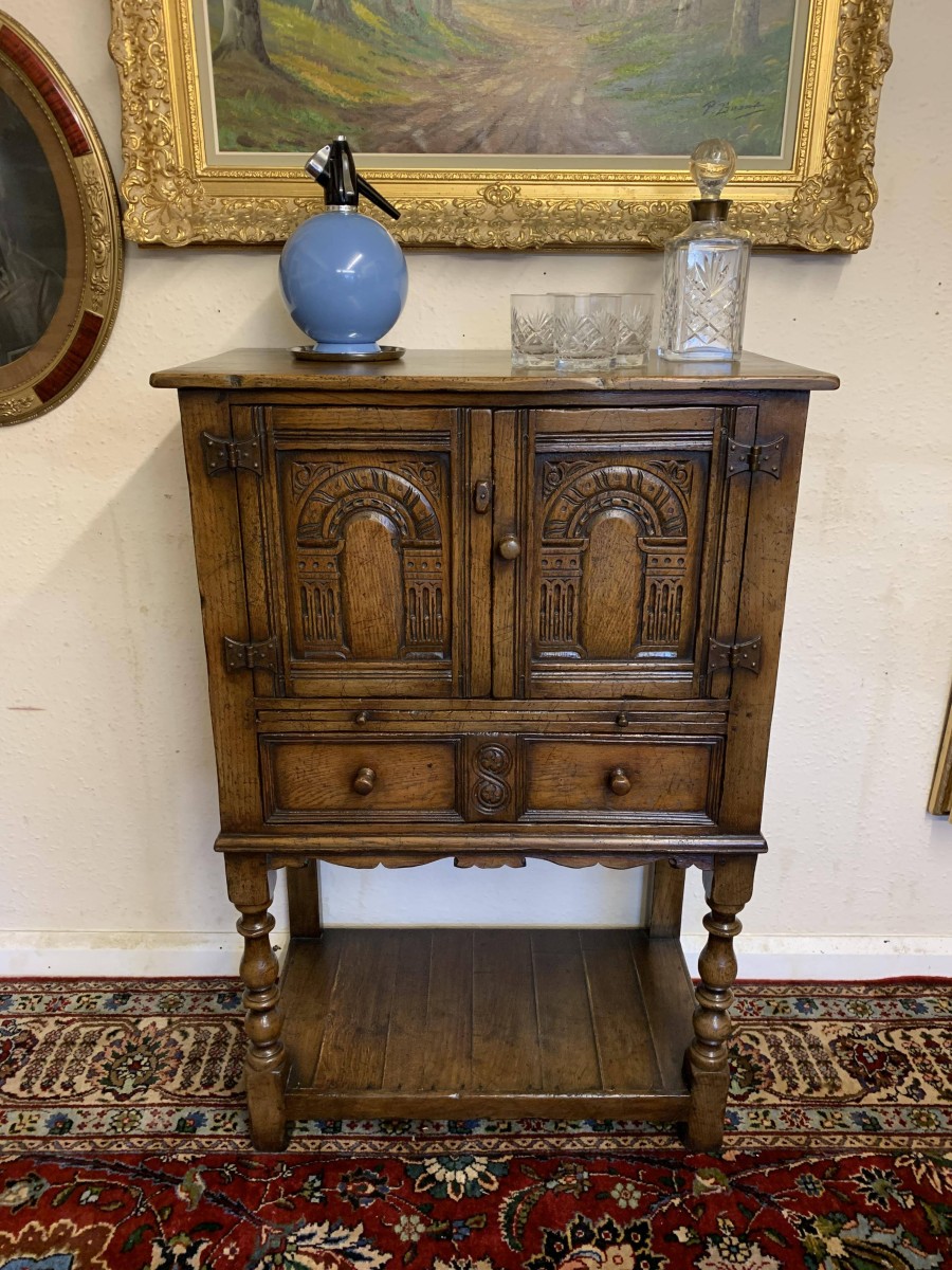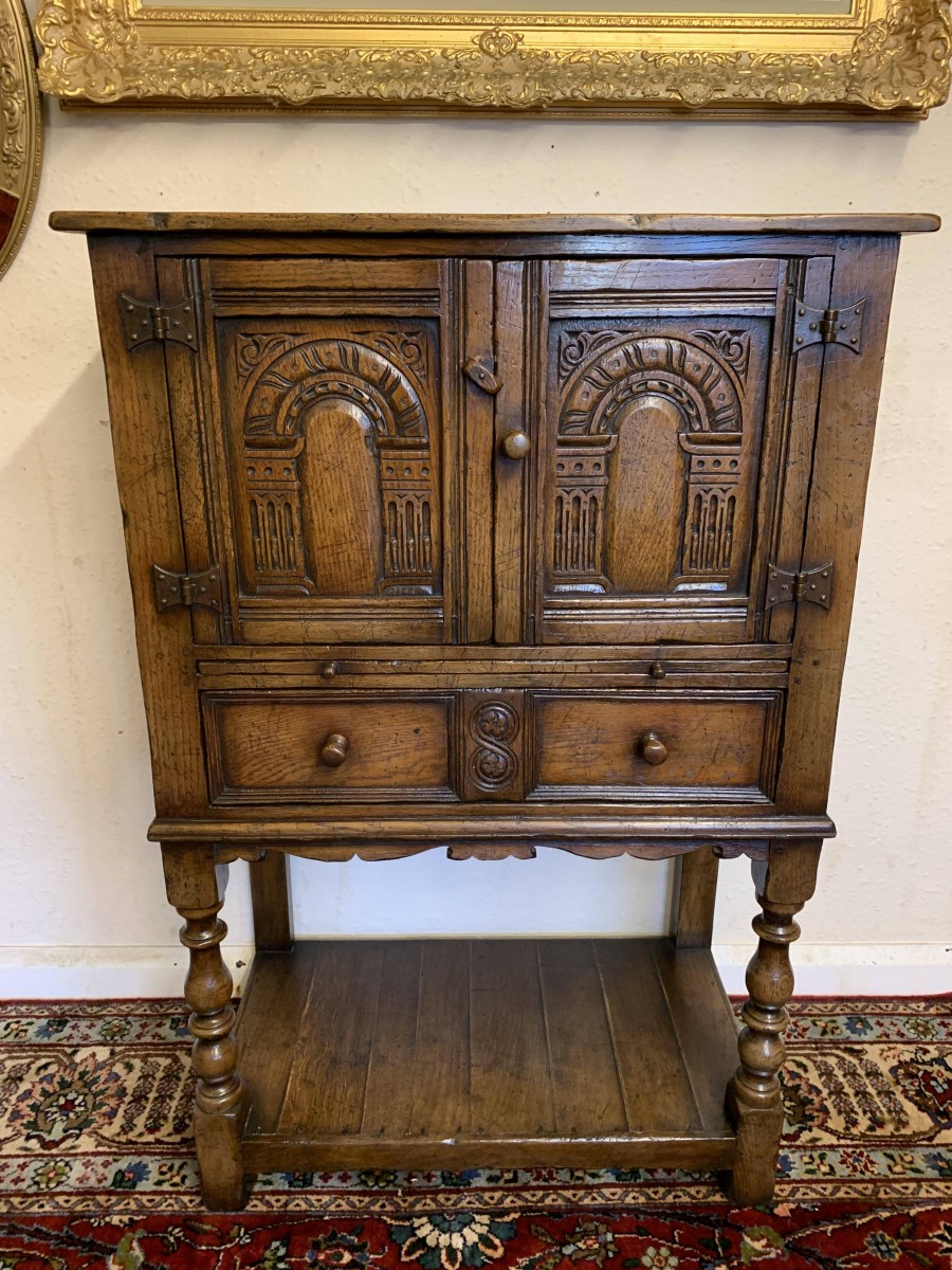 The oversailing top sits above a pair of carved recessed panelled doors, the doors having primitive hinges , turned knob handle and locking latch the doors open to reveal ample storage. There is a serving slide below which in turn sits above drawer. Having a pot board base with two elegant turned legs on block supports to the front. The cabinet is made by the renowned Titchmarsh and Goodwin furniture makers and is in excellent condition.