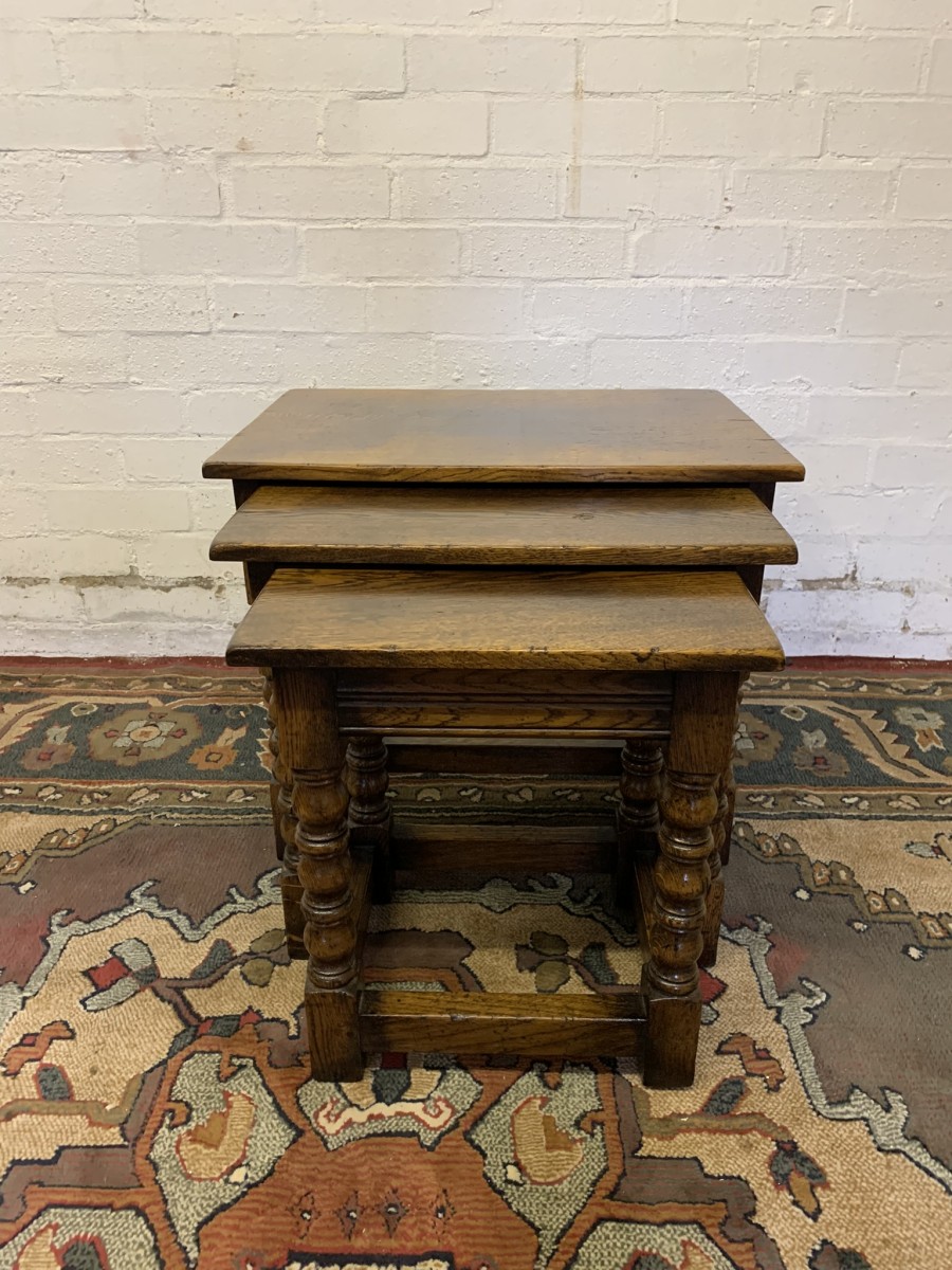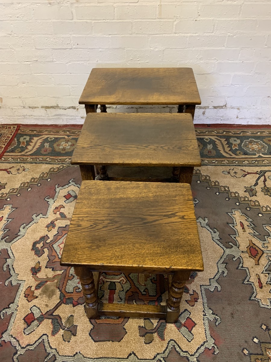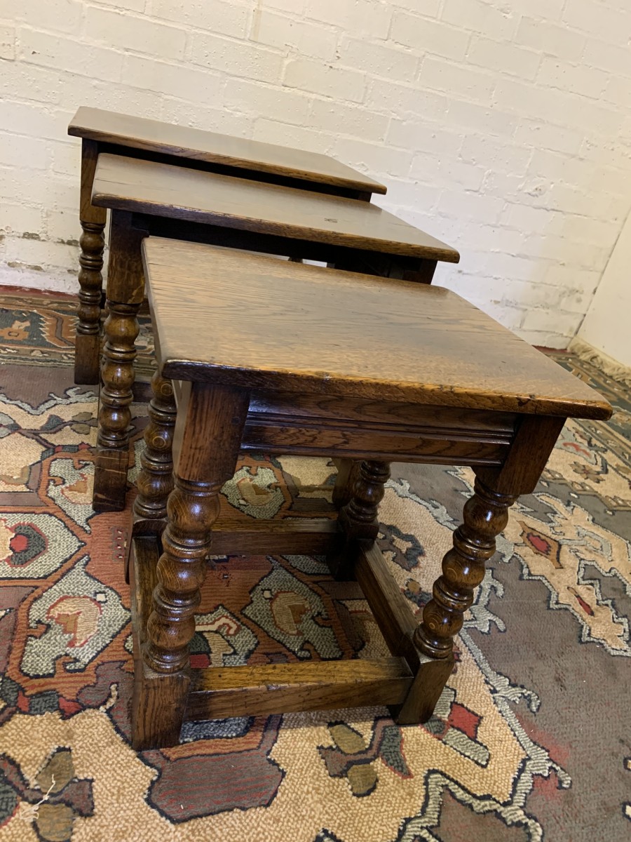 Made in a fabulous solid oak and in excellent condition. The nest consists of three graduated tables which slide effortlessly in and out. Each table has four elegant turned legs, stretcher supports and sit on traditional block feet. T