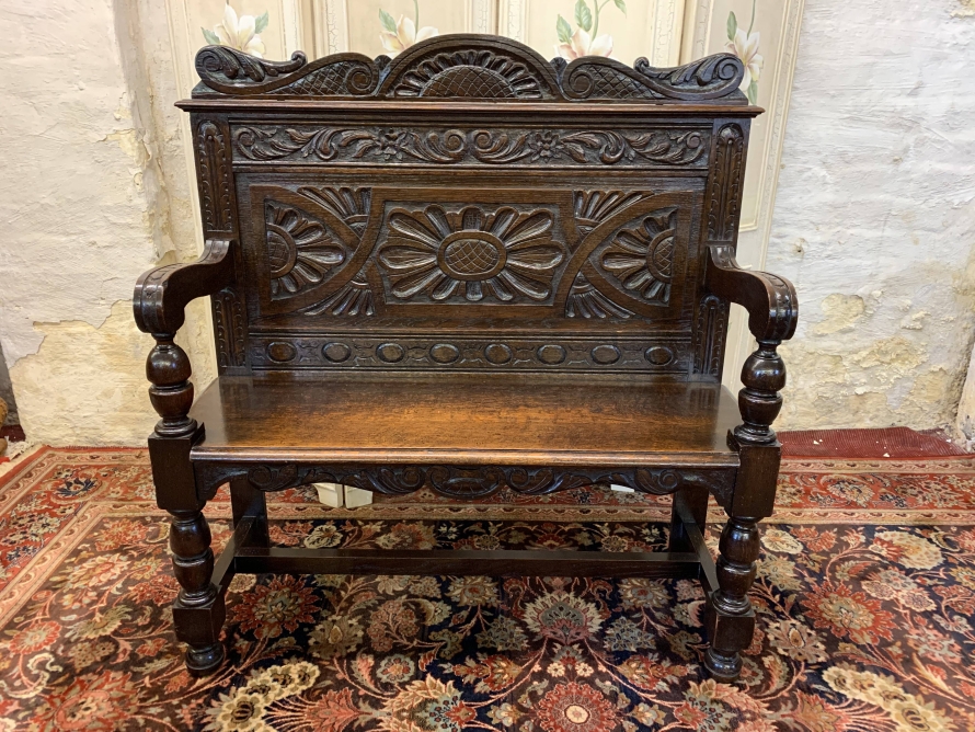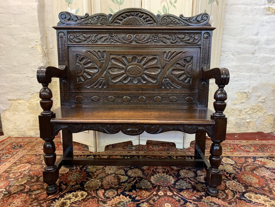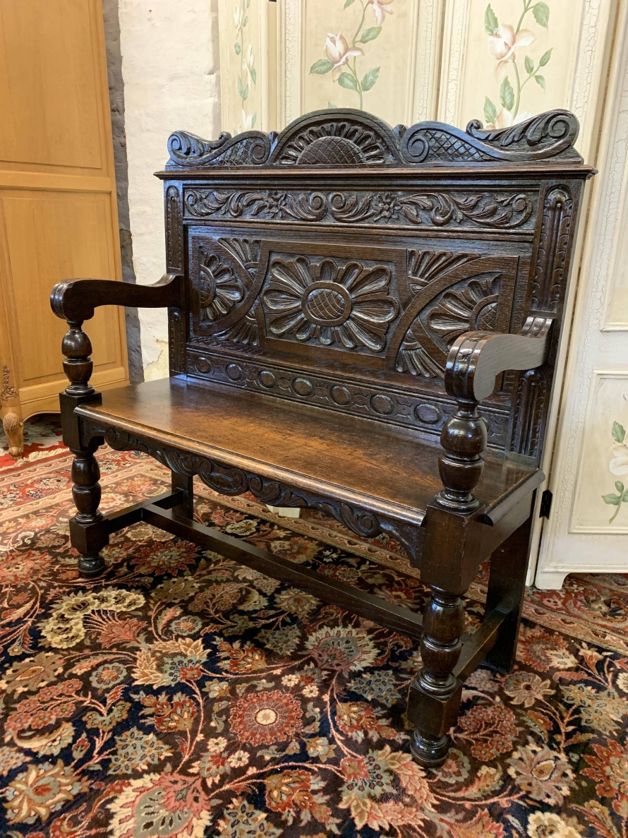 This super settle is in excellent condition and dates circa 1895. Having a heavly carved back, shaped arms with turned supports, oak seat with shaped carving below the settle stands on two turned legs to the front connected by stretcher supports.