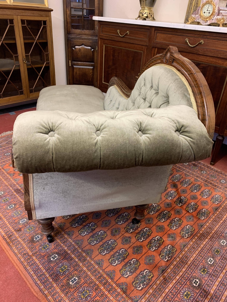 A fine example of English Victorian craftsmanship, this elegant chaise longue dates circa 1885. Having a carved walnut shaped frame with an upholstered seat and a deep buttoned upholstered back. This quality item stands on four turned legs with original casters.