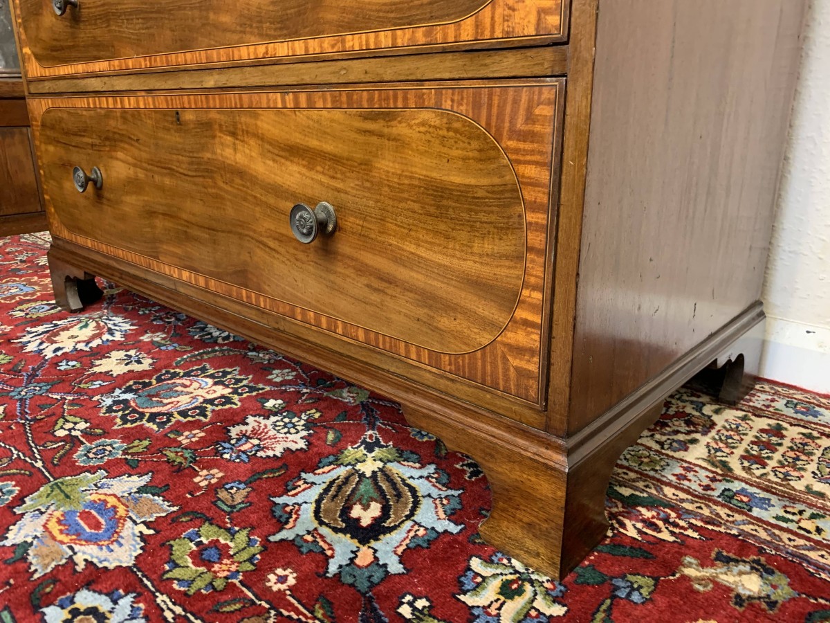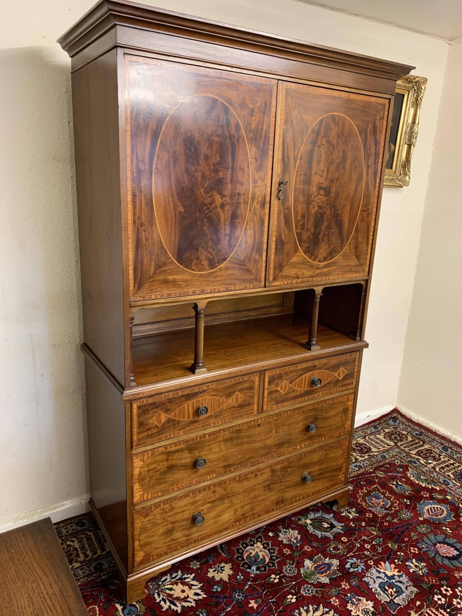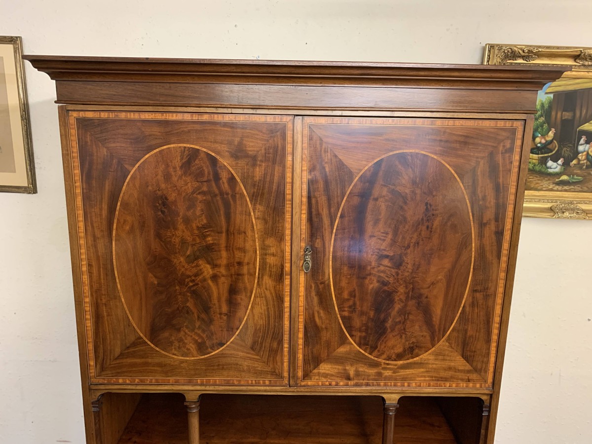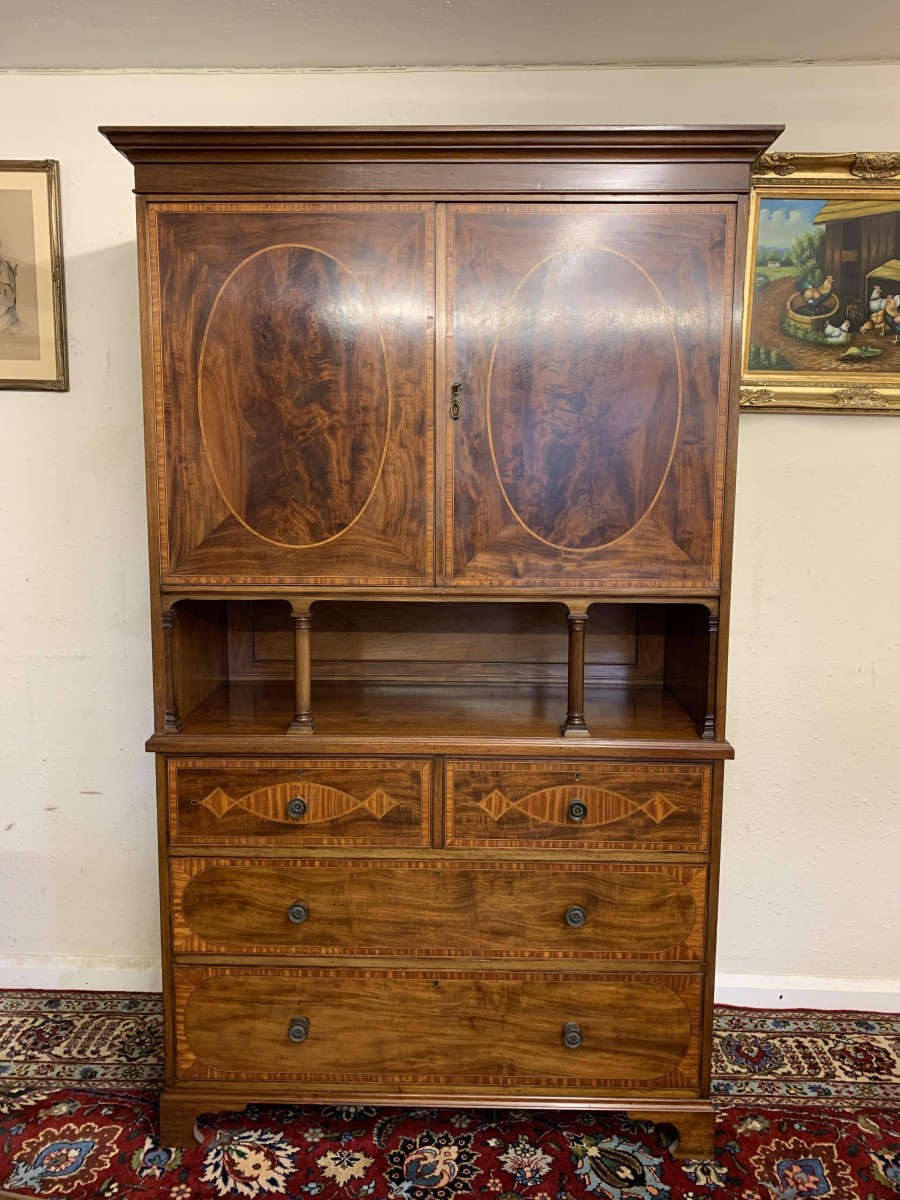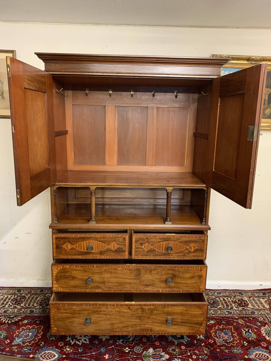 Made in beautiful mahogany and dating circa 1890 this linen cupboard is in excellent condition. The oversailing top sits above a pair of lockable inlaid doors, the doors open to reveal nine brass hooks and ample storage. Open section below having a pair of turned column supports. A pair of two short inlaid drawers sit above a pair of long inlaid drawers, each of the drawers having decorative brass handles. This fabulous linen cupboard sits on four bracket feet.