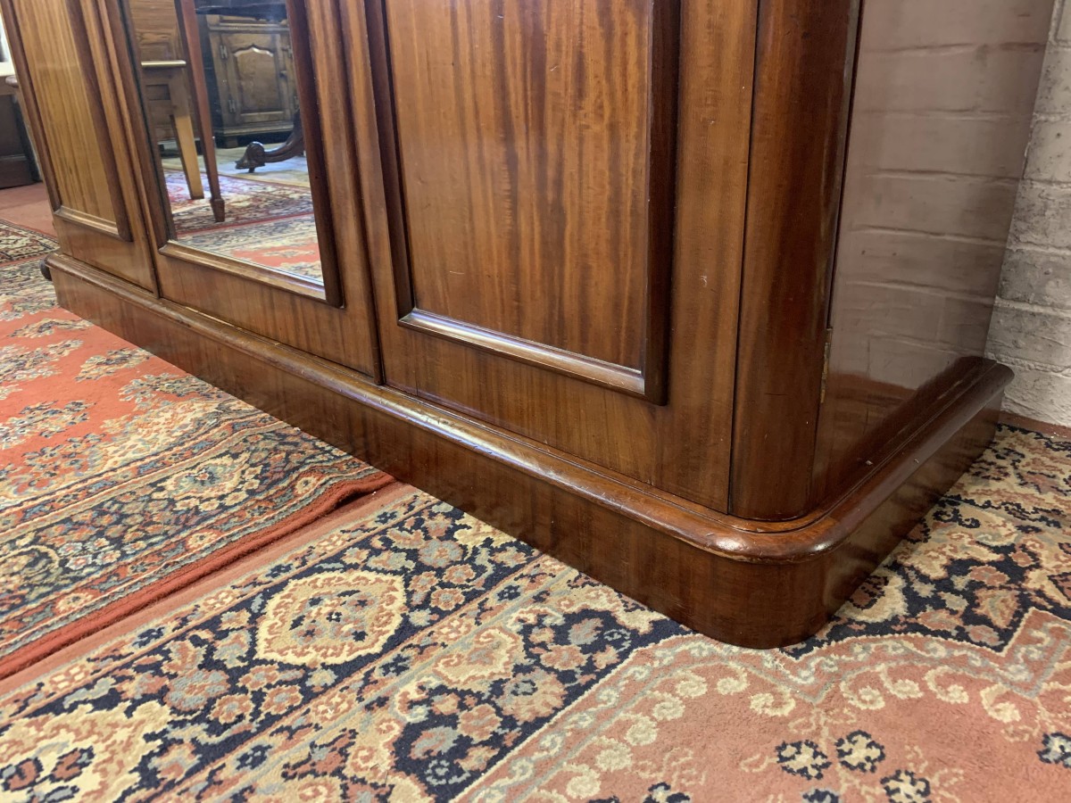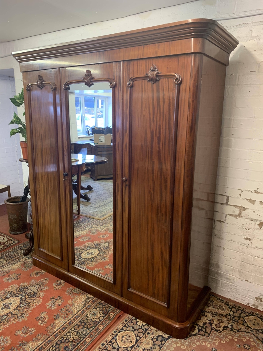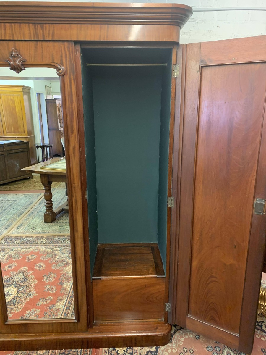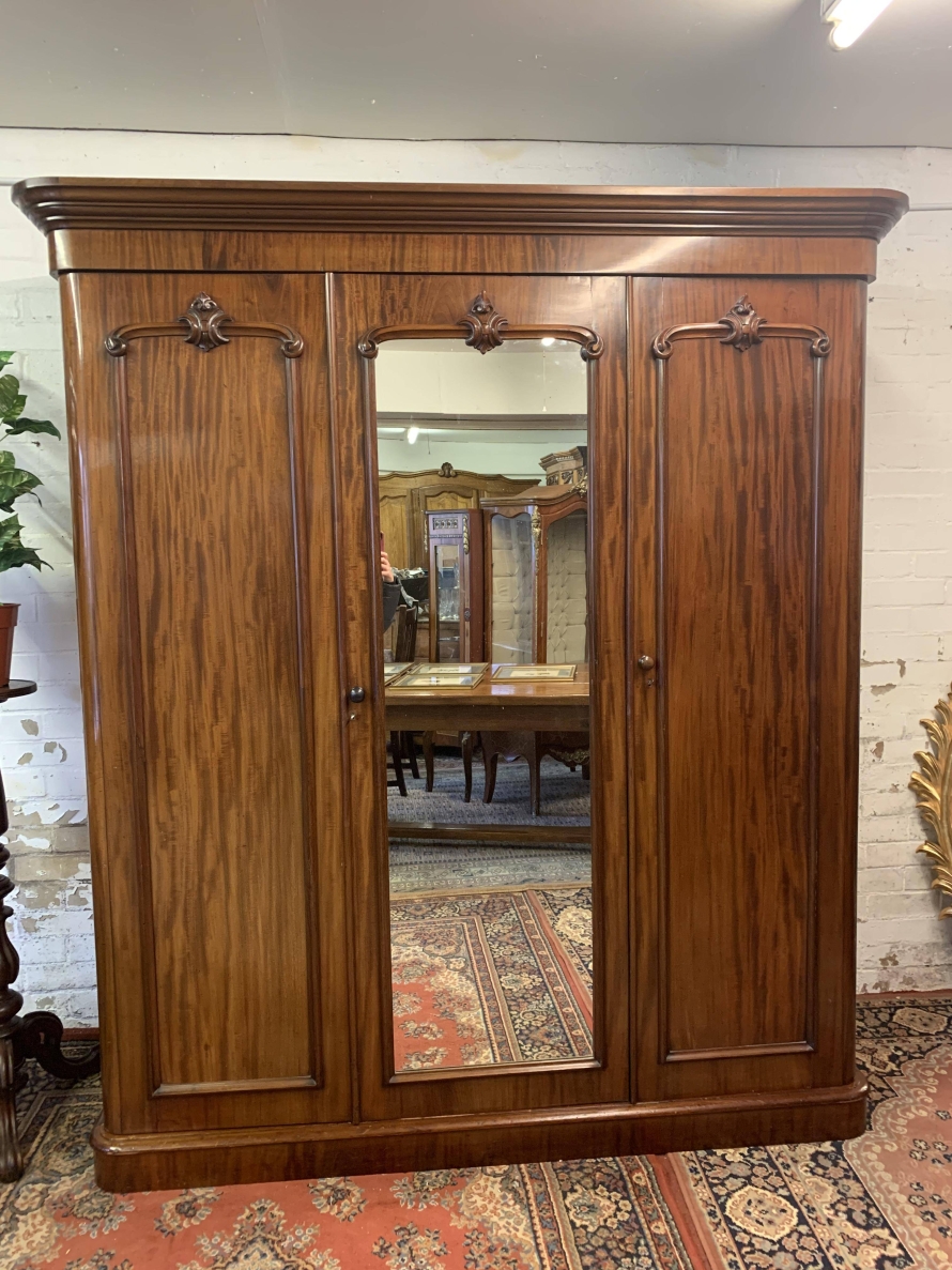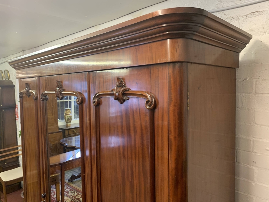 A fantastic example of English Victorian craftsmanship – this beautiful wardrobe is in excellent condition. The stepped rounded corners sits above a central mirrored door with carving to the top. The central door is flanked by a pair of recessed panelled doors, each with decorative carvings to the top. The left hand side and central door open to reveal a brass hanging rail which sits above an open sliding drawer and three drawers, each drawer having a pair of brass handles. The right-hand door opens to reveal a hanging rail with lided storage section below. This exceptional quality wardrobe sits on a rounded plinth base.