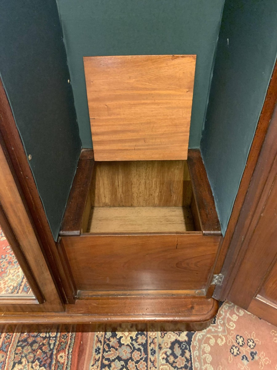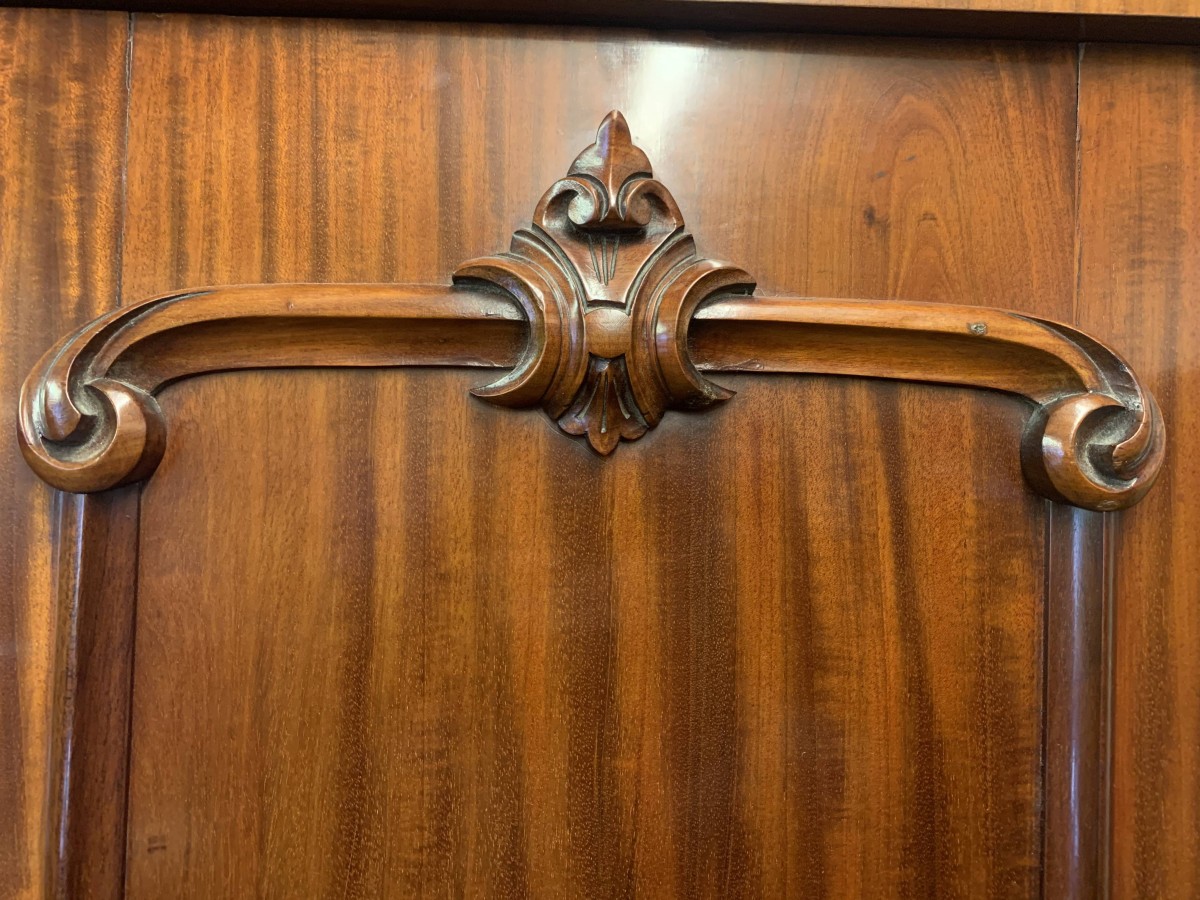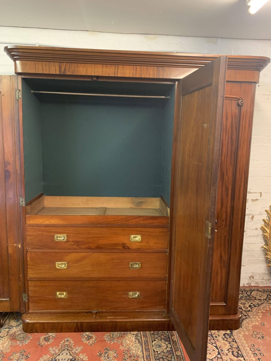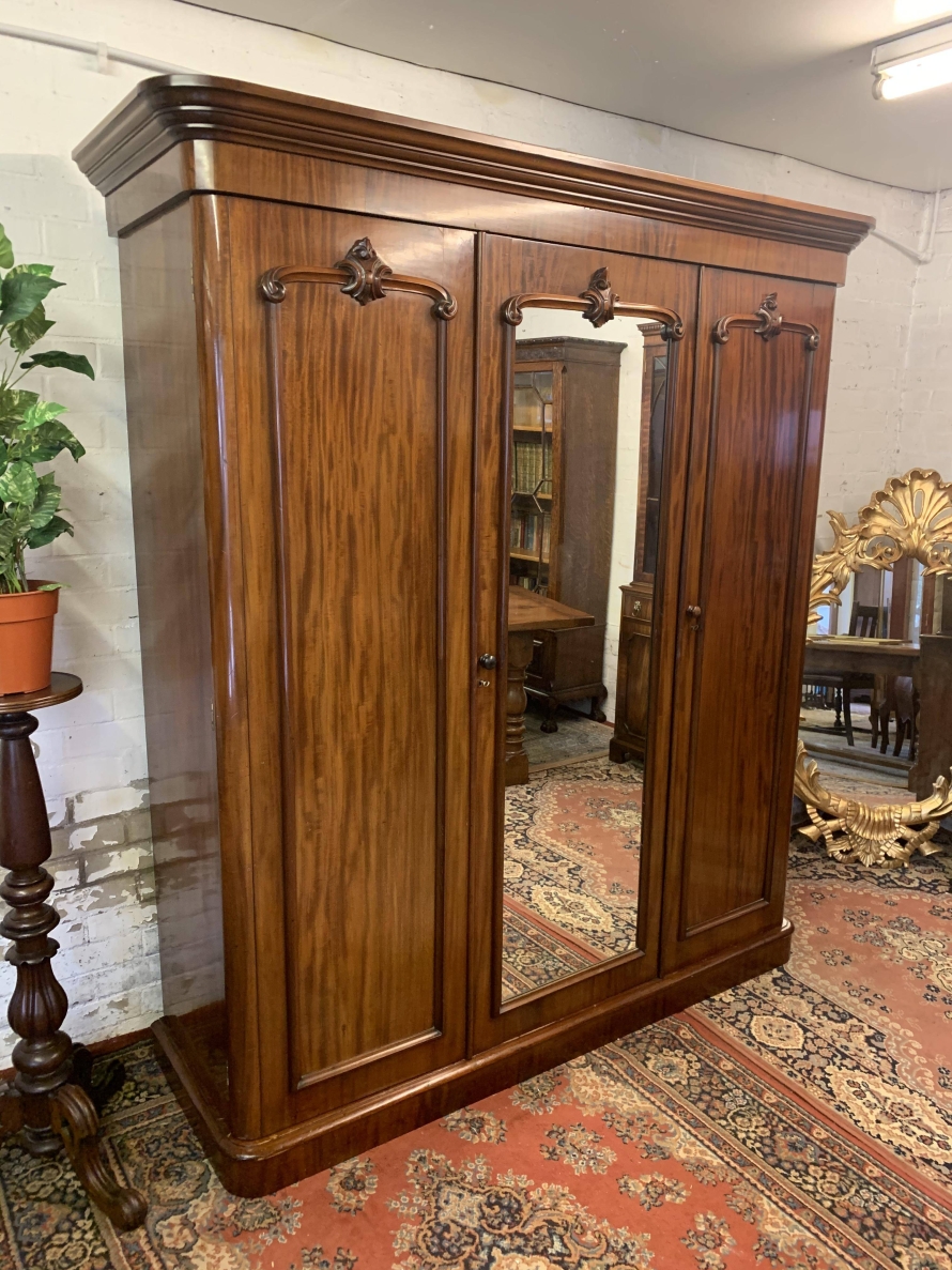 A fantastic example of English Victorian craftsmanship – this beautiful wardrobe is in excellent condition. The stepped rounded corners sits above a central mirrored door with carving to the top. The central door is flanked by a pair of recessed panelled doors, each with decorative carvings to the top. The left hand side and central door open to reveal a brass hanging rail which sits above an open sliding drawer and three drawers, each drawer having a pair of brass handles. The right-hand door opens to reveal a hanging rail with lided storage section below. This exceptional quality wardrobe sits on a rounded plinth base.