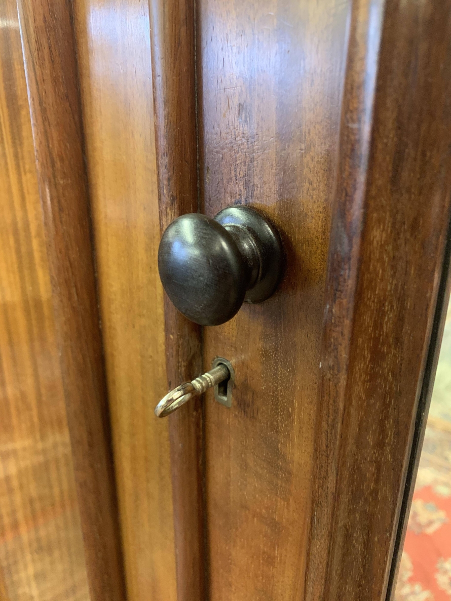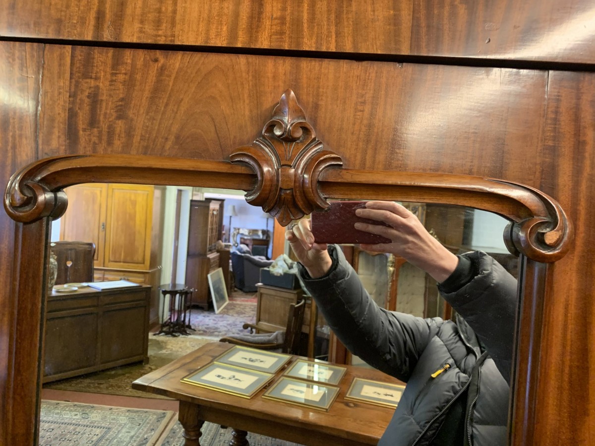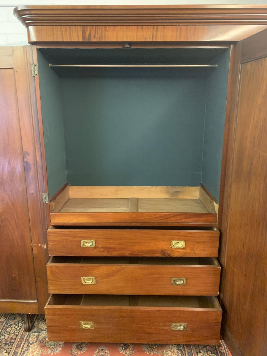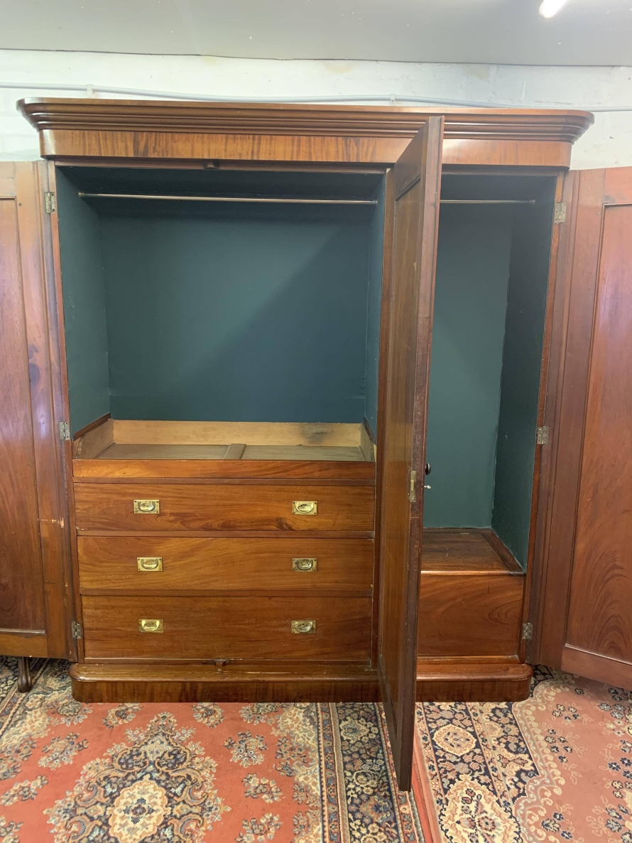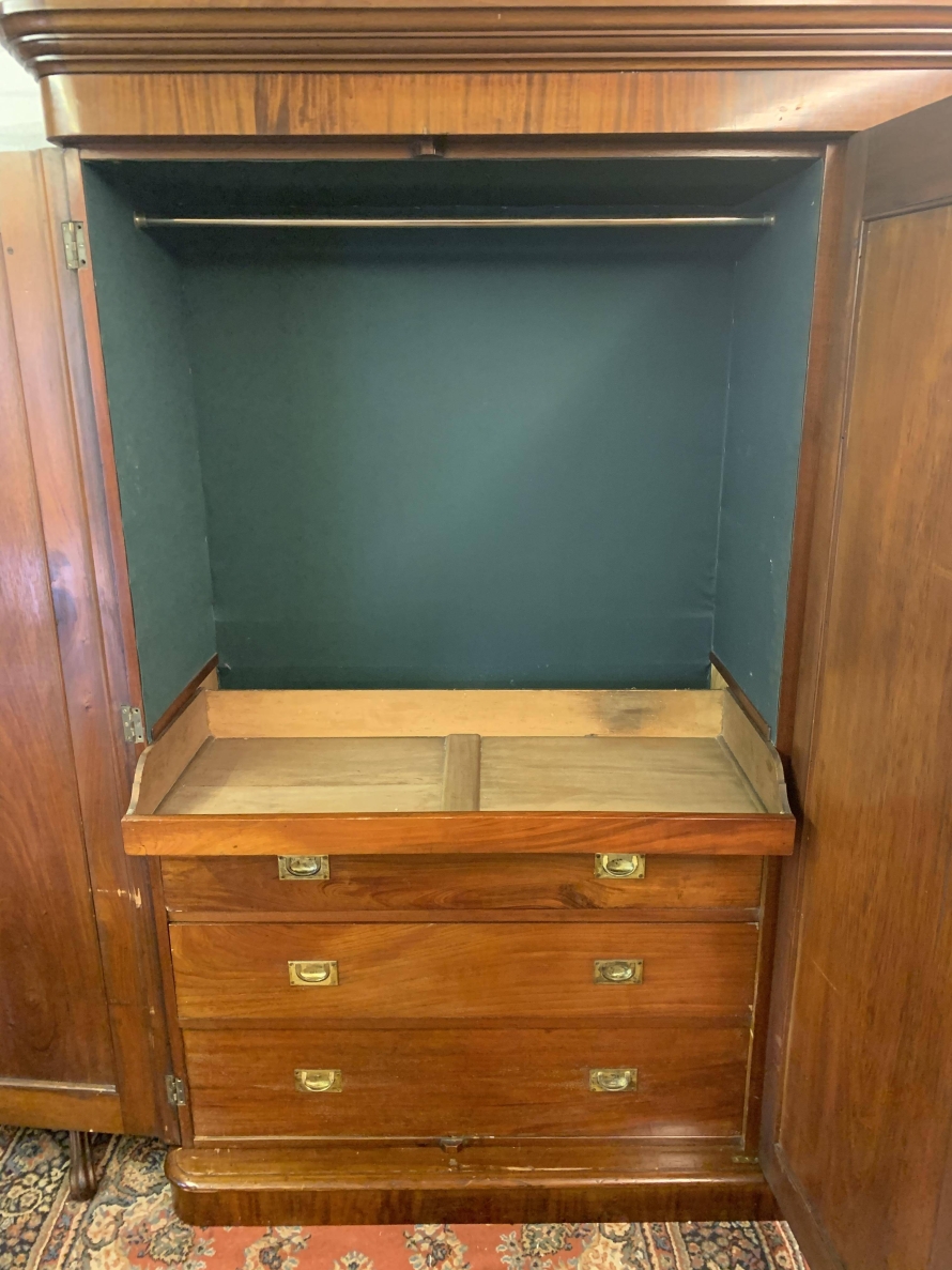 A fantastic example of English Victorian craftsmanship – this beautiful wardrobe is in excellent condition. The stepped rounded corners sits above a central mirrored door with carving to the top. The central door is flanked by a pair of recessed panelled doors, each with decorative carvings to the top. The left hand side and central door open to reveal a brass hanging rail which sits above an open sliding drawer and three drawers, each drawer having a pair of brass handles. The right-hand door opens to reveal a hanging rail with lided storage section below. This exceptional quality wardrobe sits on a rounded plinth base.