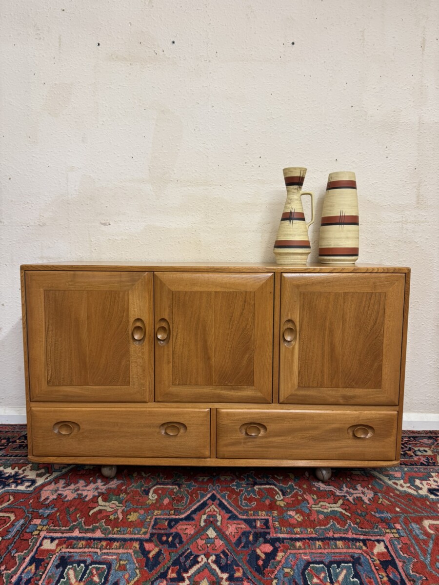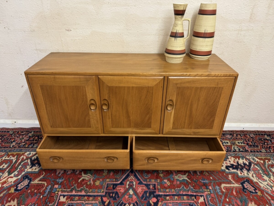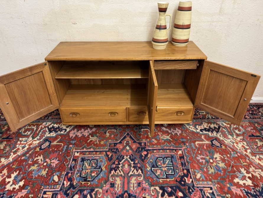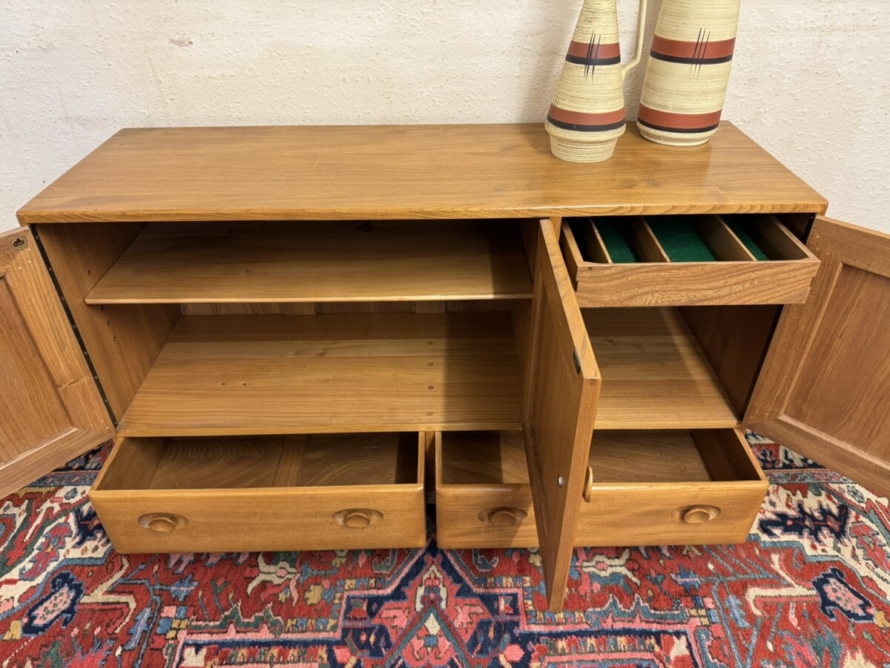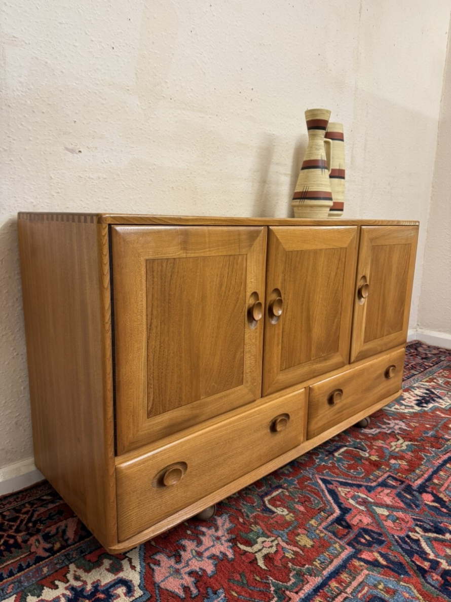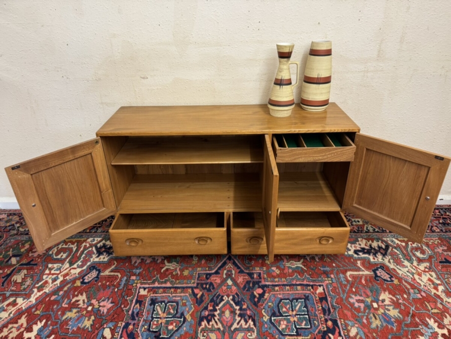 This fantastic Ercol sideboard is in excellent condition. Windsor model 468 sideboard – fabulously designed and of high quality manufacturered from the renowned Ercol furniture makers. Light blonde colour and is made in solid elm. Offering fabulous storage space with the left and central door opening to reveal an adjustable and removable shelf, the right-hand door opening to reveal a removable cutlery drawer. Below are two drawers, each with two handles. All original casters.