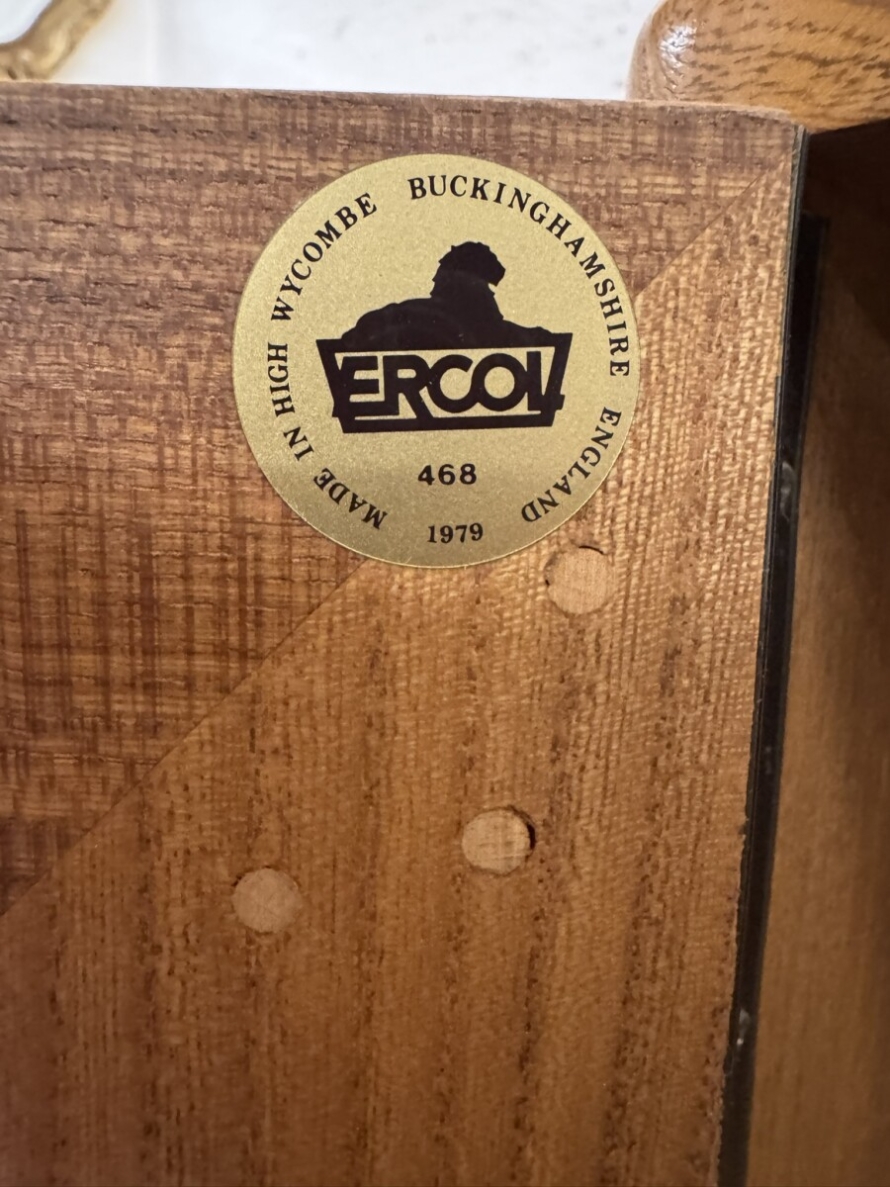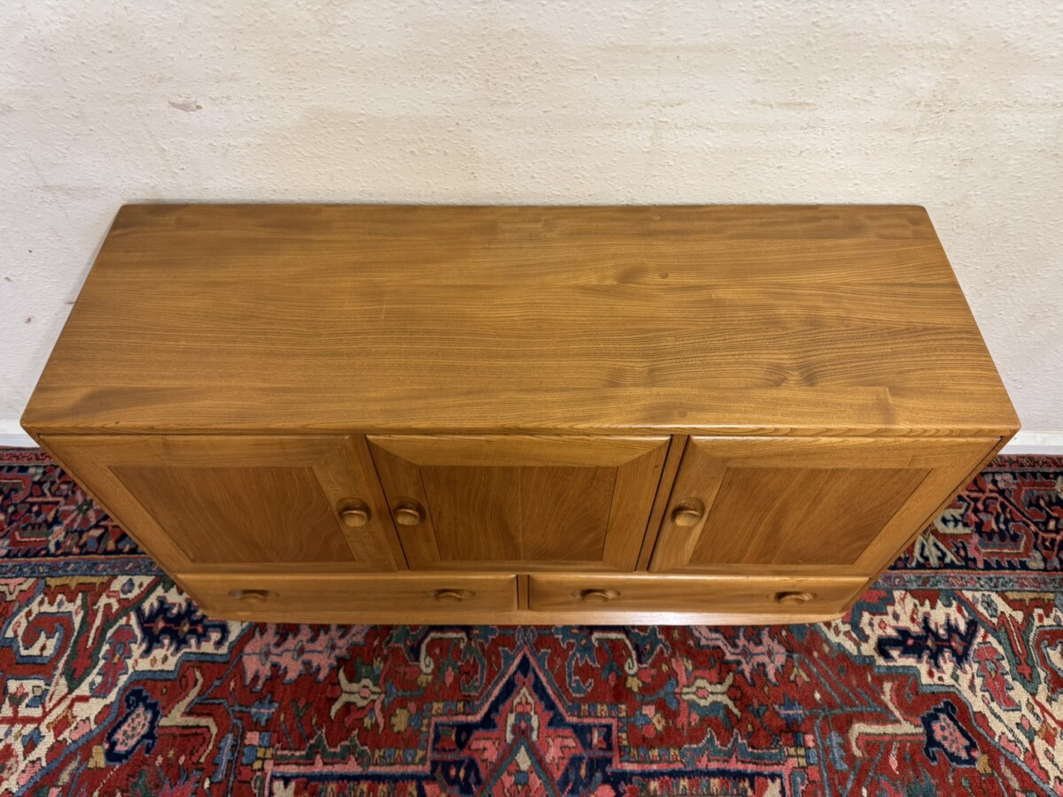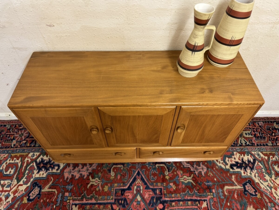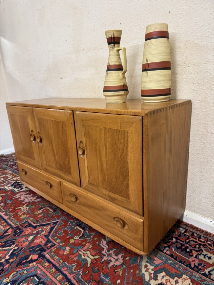 This fantastic Ercol sideboard is in excellent condition. Windsor model 468 sideboard – fabulously designed and of high quality manufacturered from the renowned Ercol furniture makers. Light blonde colour and is made in solid elm. Offering fabulous storage space with the left and central door opening to reveal an adjustable and removable shelf, the right-hand door opening to reveal a removable cutlery drawer. Below are two drawers, each with two handles. All original casters.