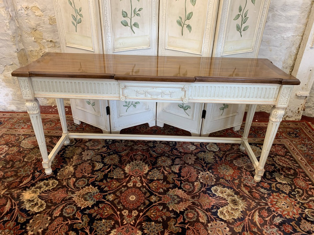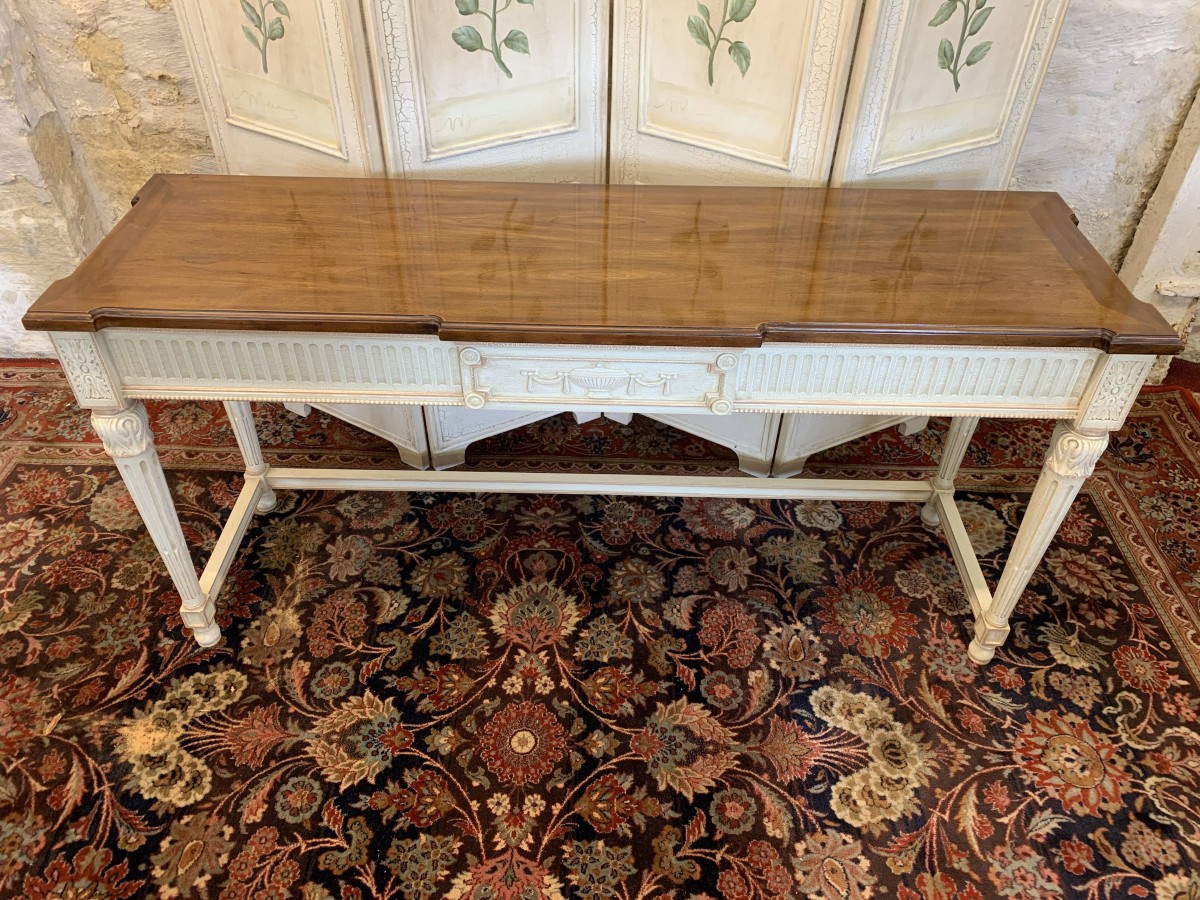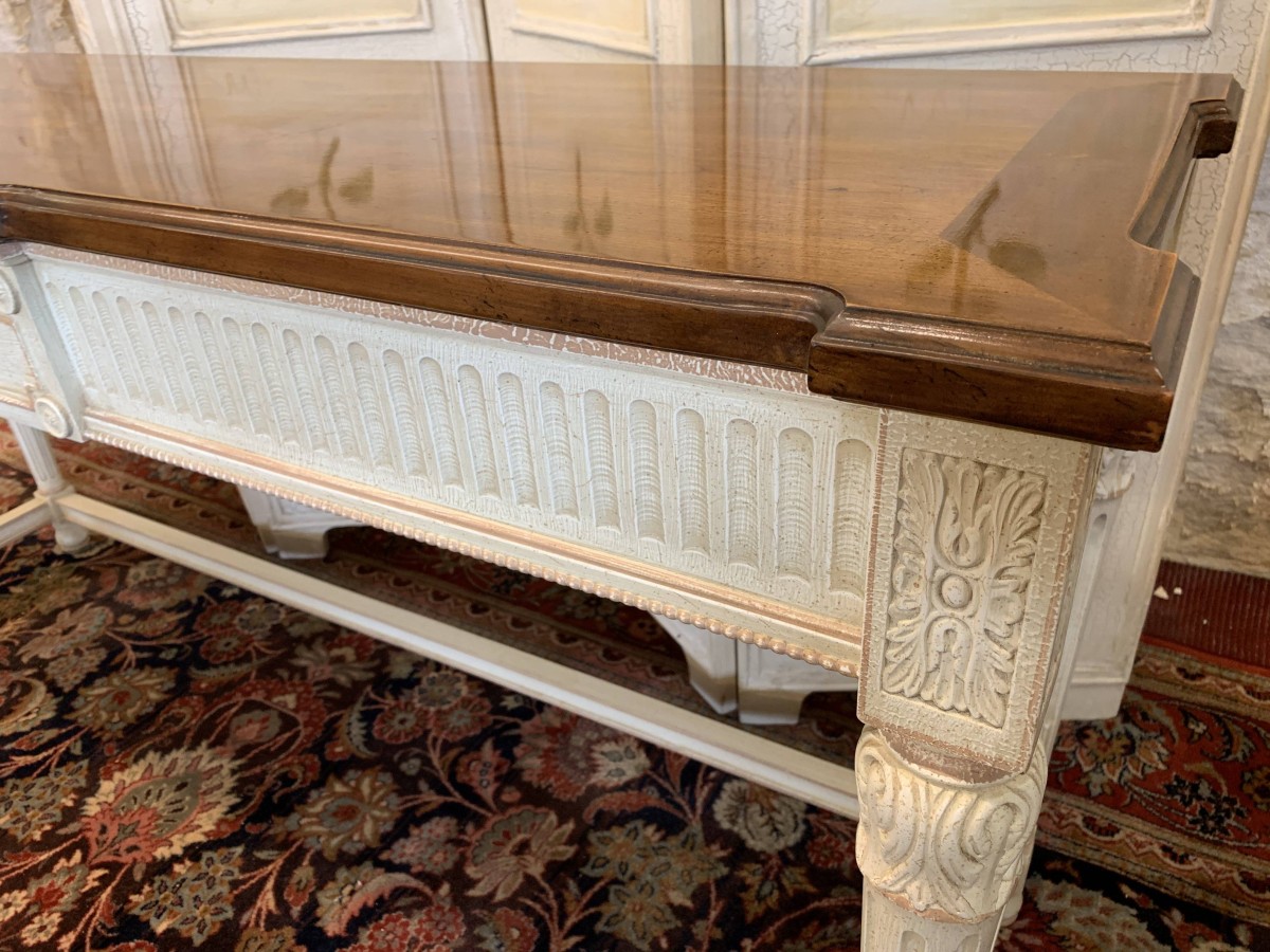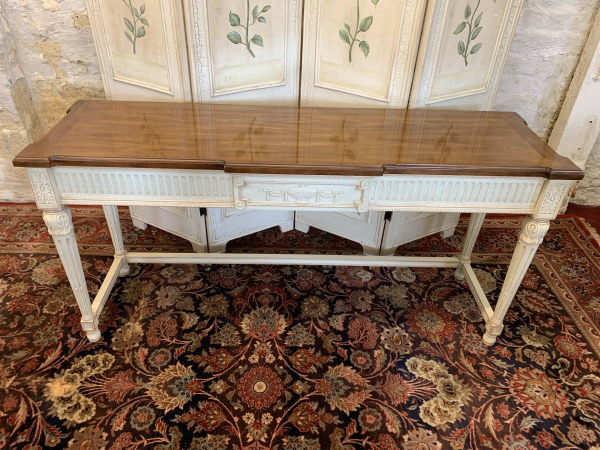 This fantastic console table has a white base and a shaped walnut top. Carved “Adams” style decoration to the front and sides,four carved turned legs conected by side and back stretcher and standing on four turned feet.